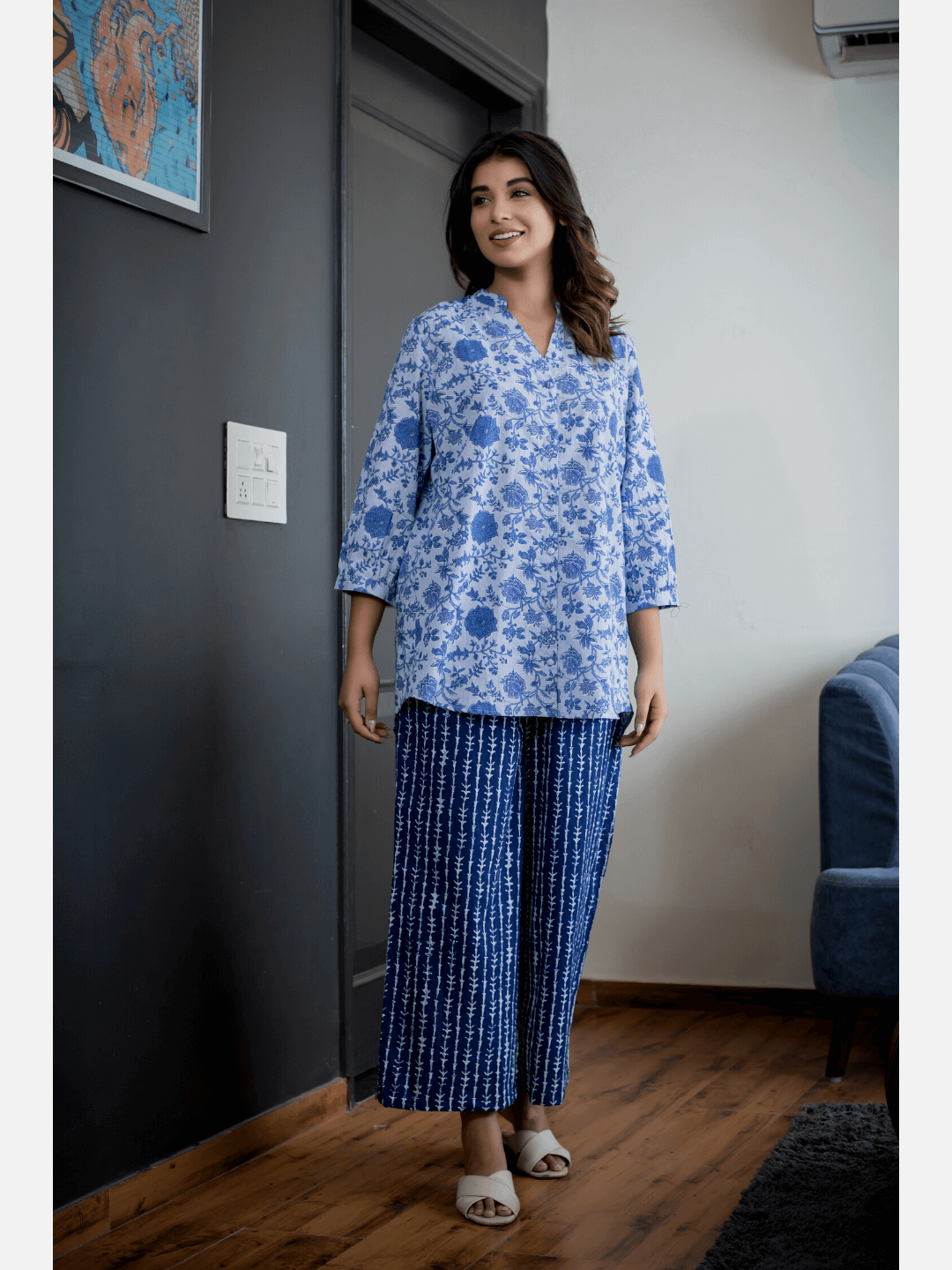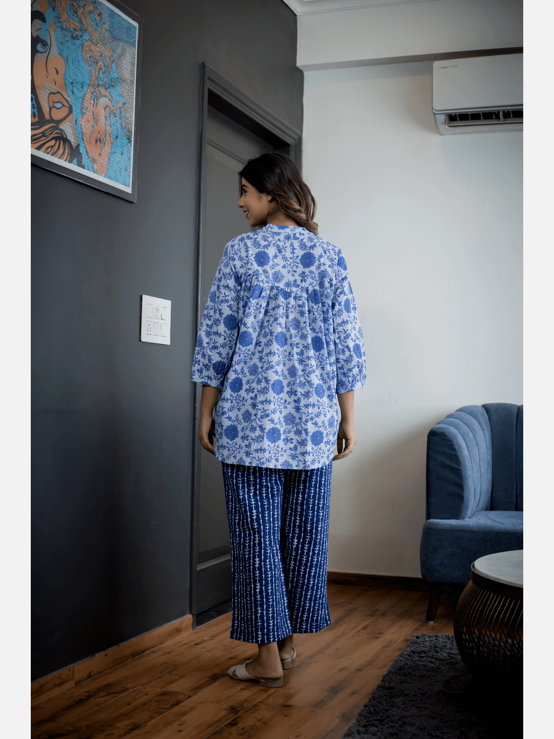 Blue Back pleated indigo Cotton Loungewear