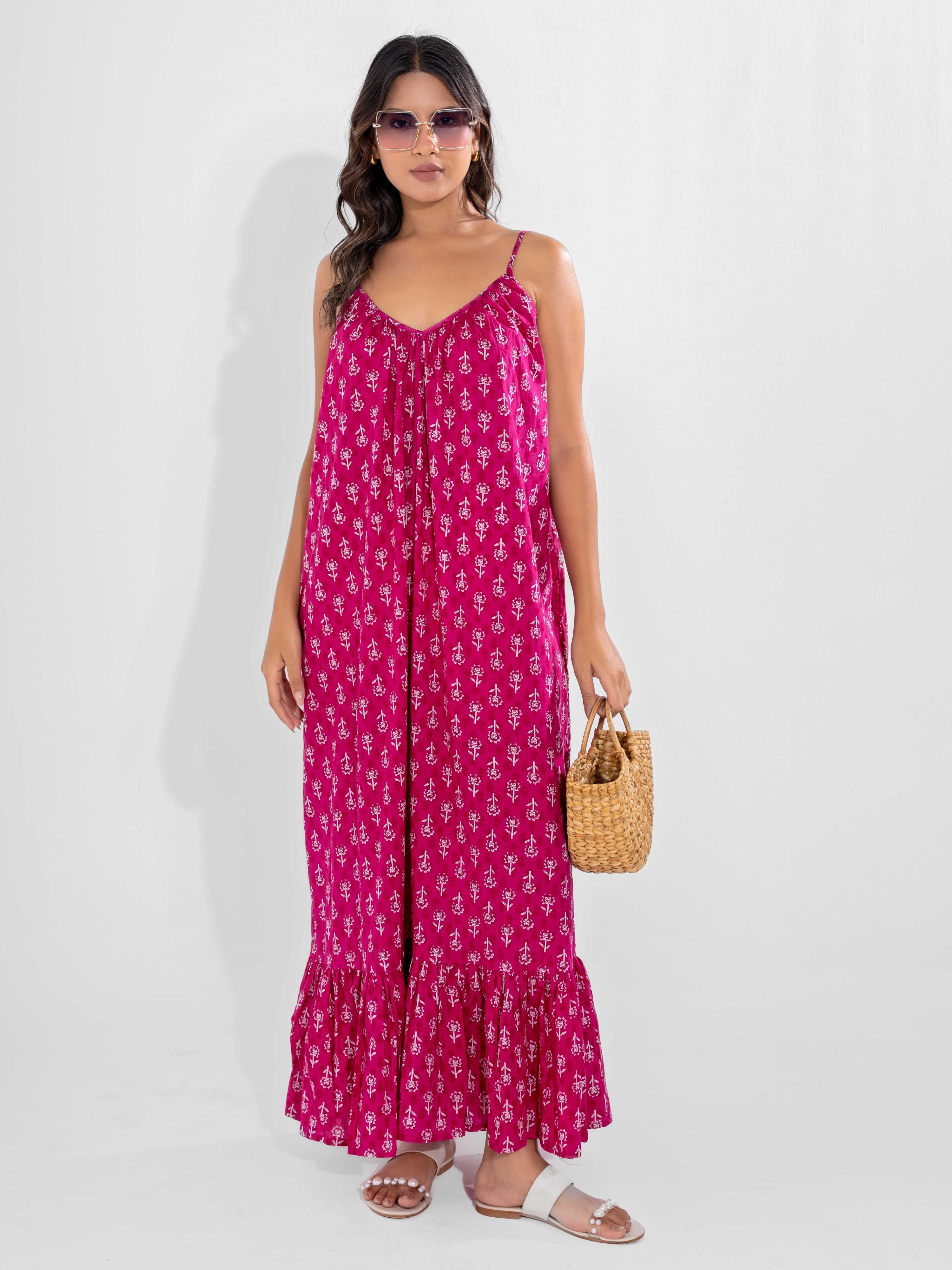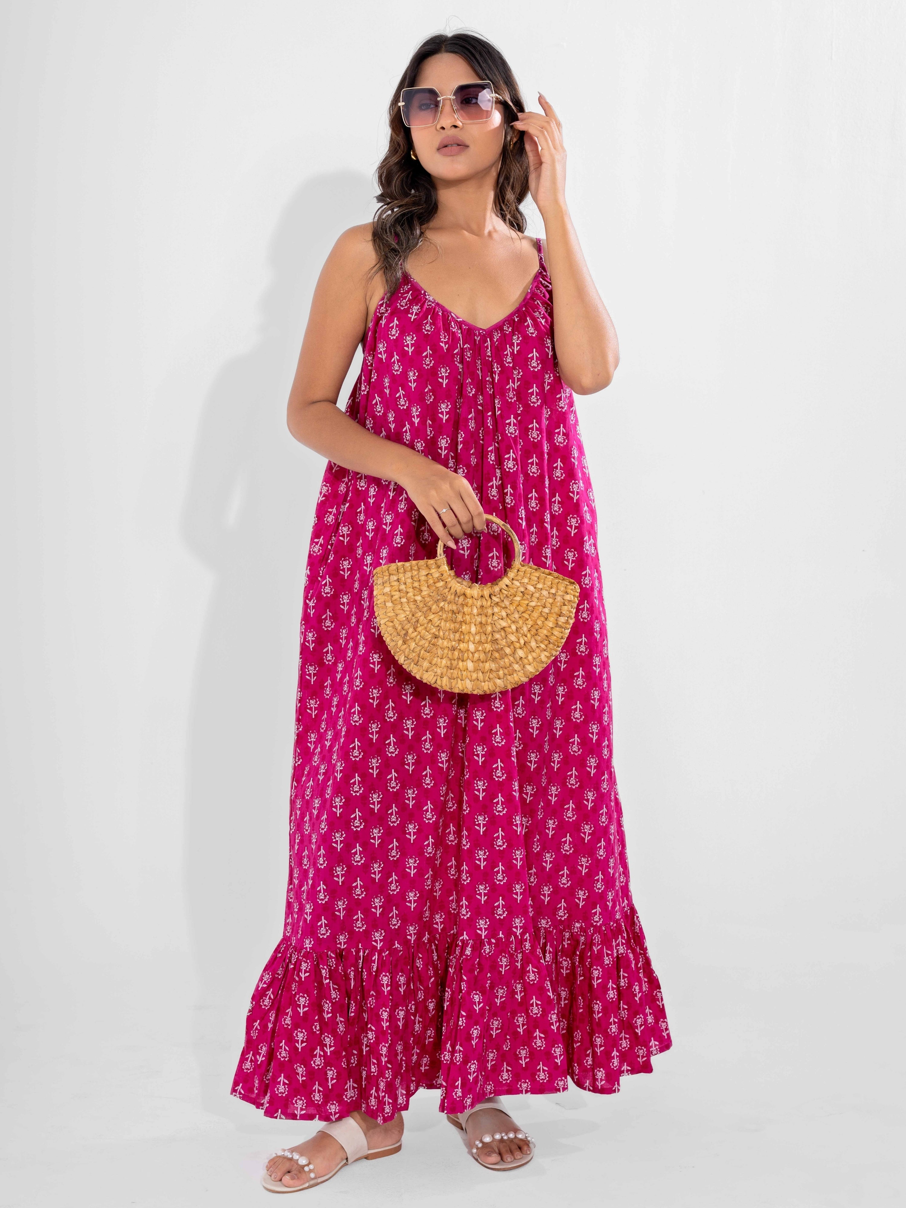 The Pink Bohemian Pure Cotton Ghera Maxi combines playful style with soft, breathable cotton. Its vibrant pink hue and flowing design make it perfect for carefree, joyful days.