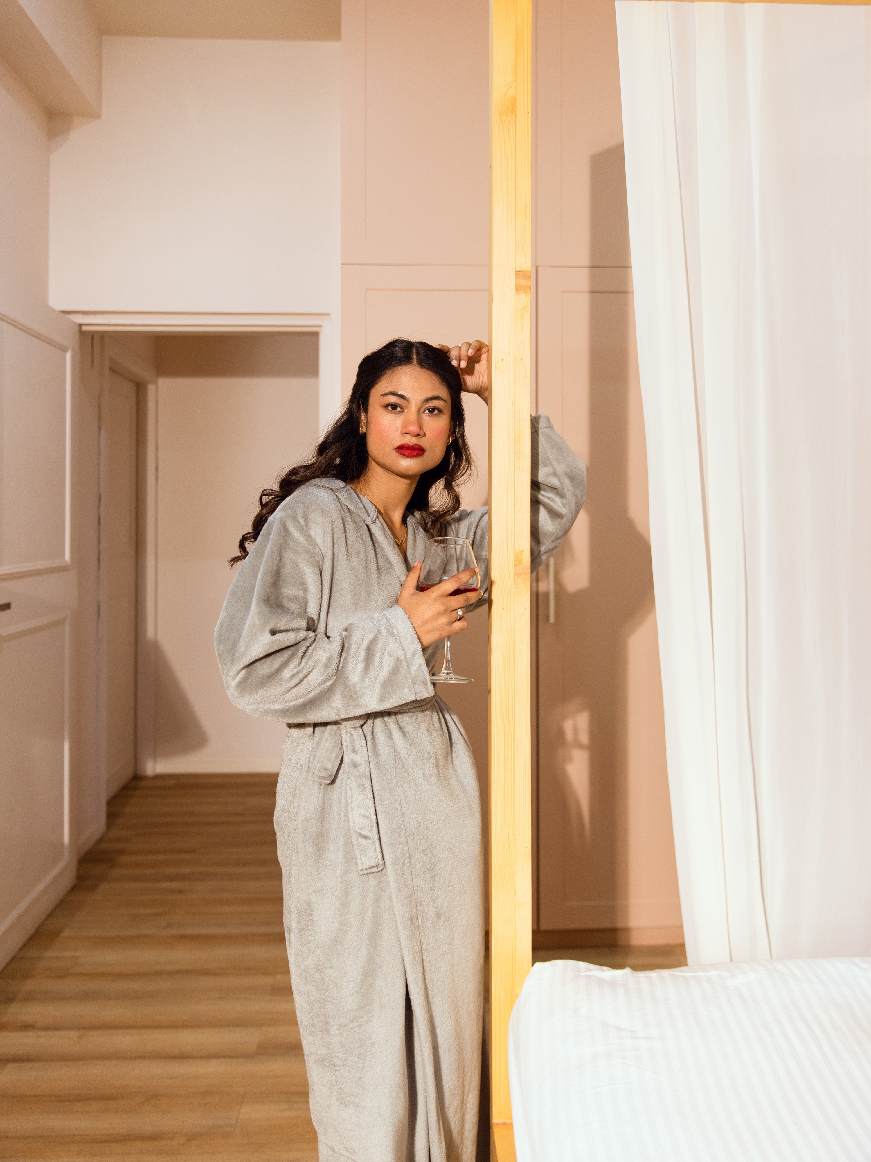 Treat yourself to ultimate comfort with our Grey Super Soft Woollen Hoodie Robe! This ultra-soft robe combines the coziness of wool with the convenience of a hoodie for a quirky and luxurious lounging experience. Perfect for lazy days at home or a stylish alternative to a traditional bathrobe.