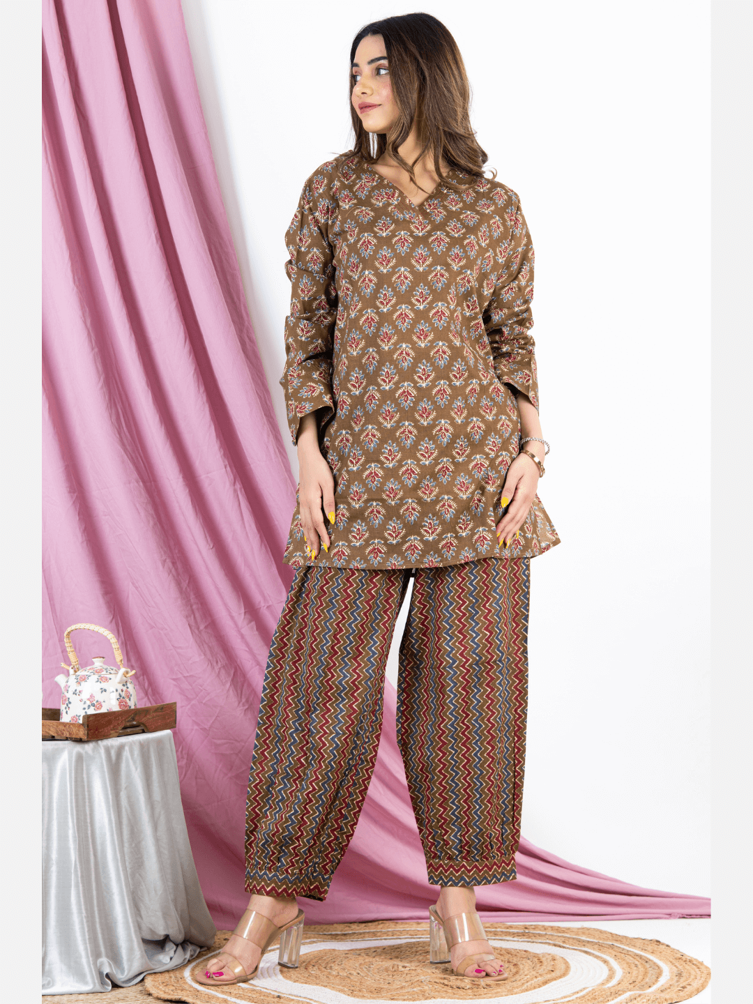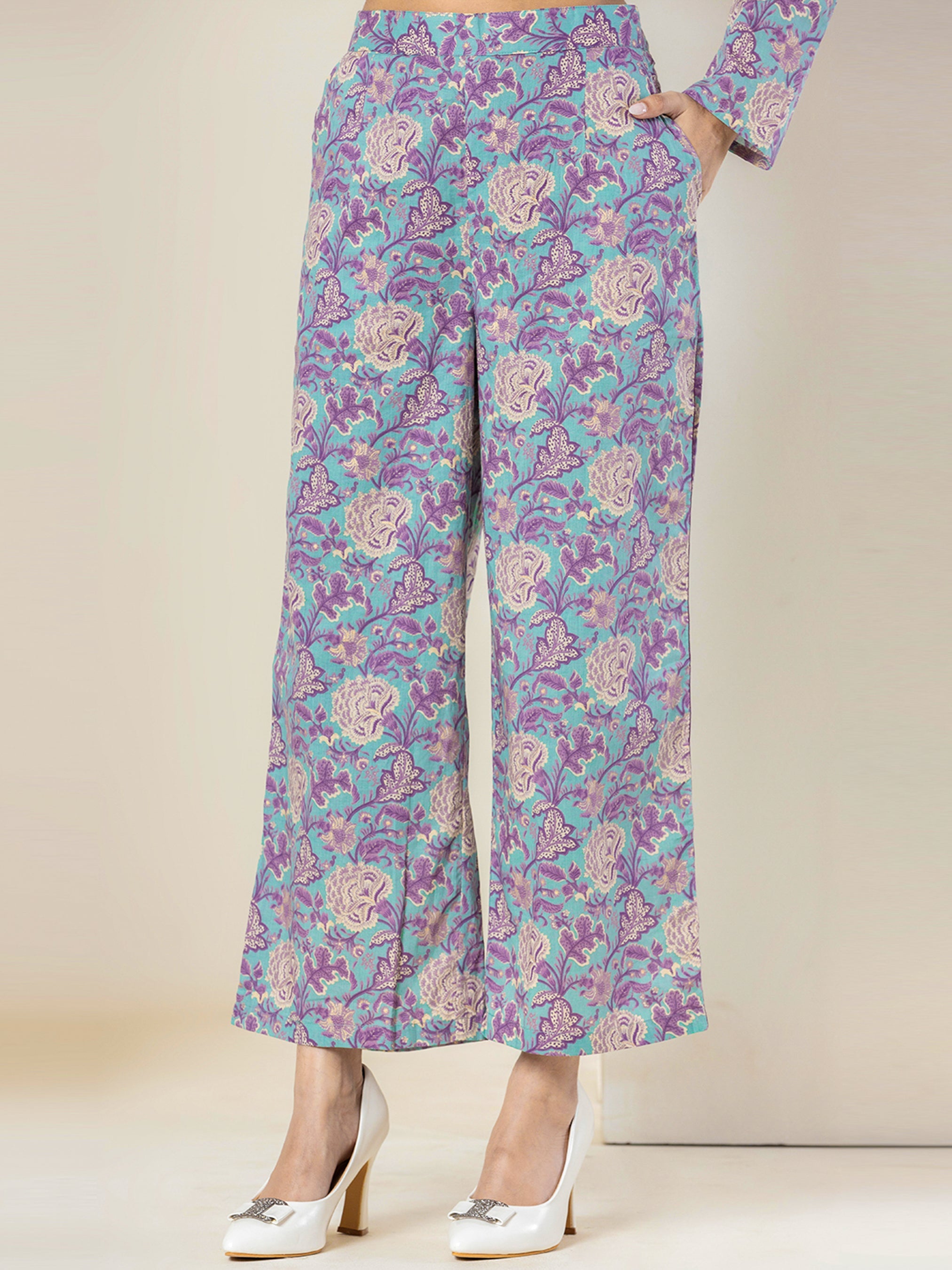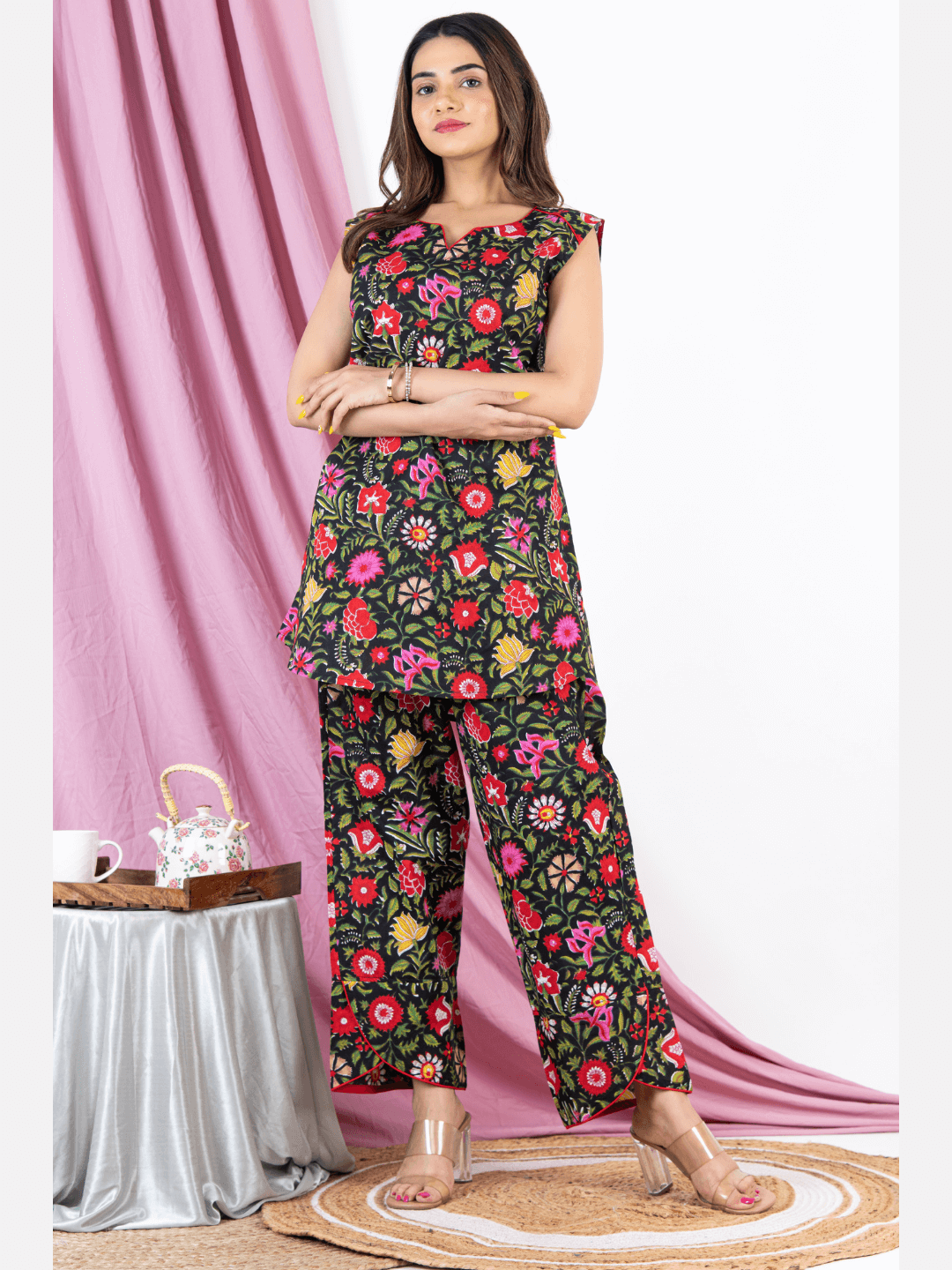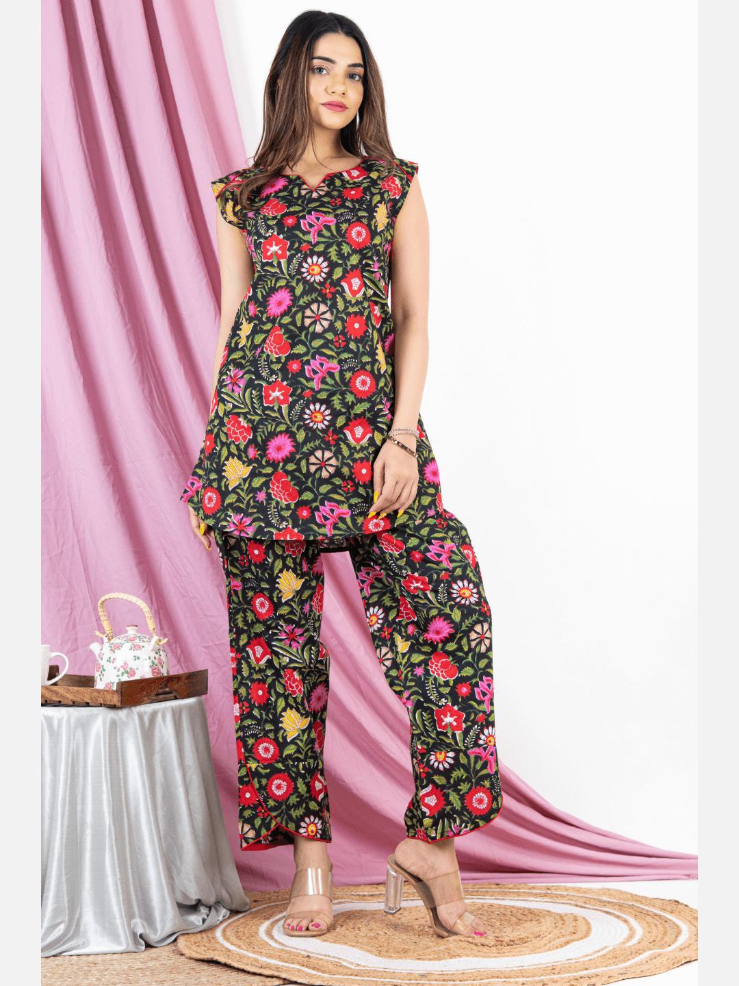 Tropical Raven's Wing Floral V-Neck Patiala Co-Ord Set