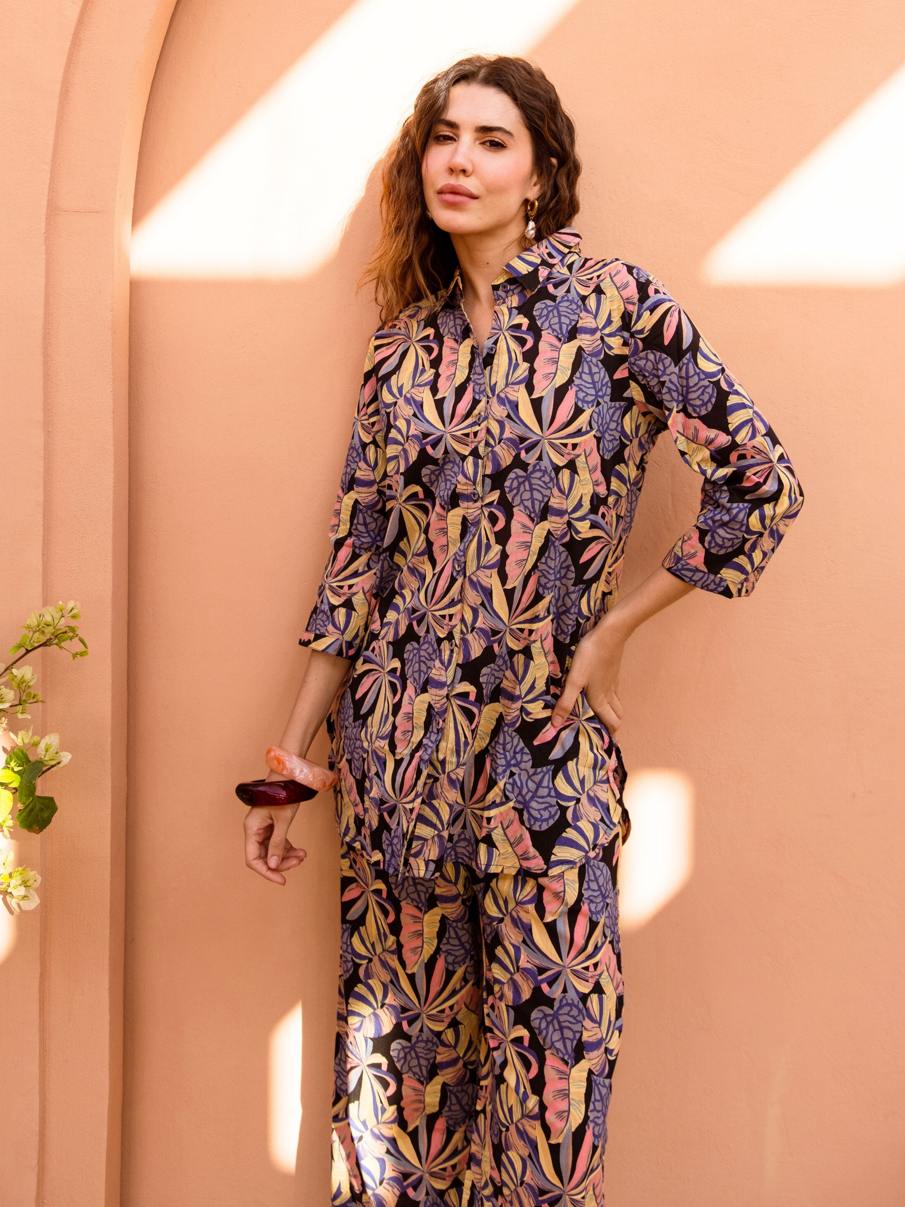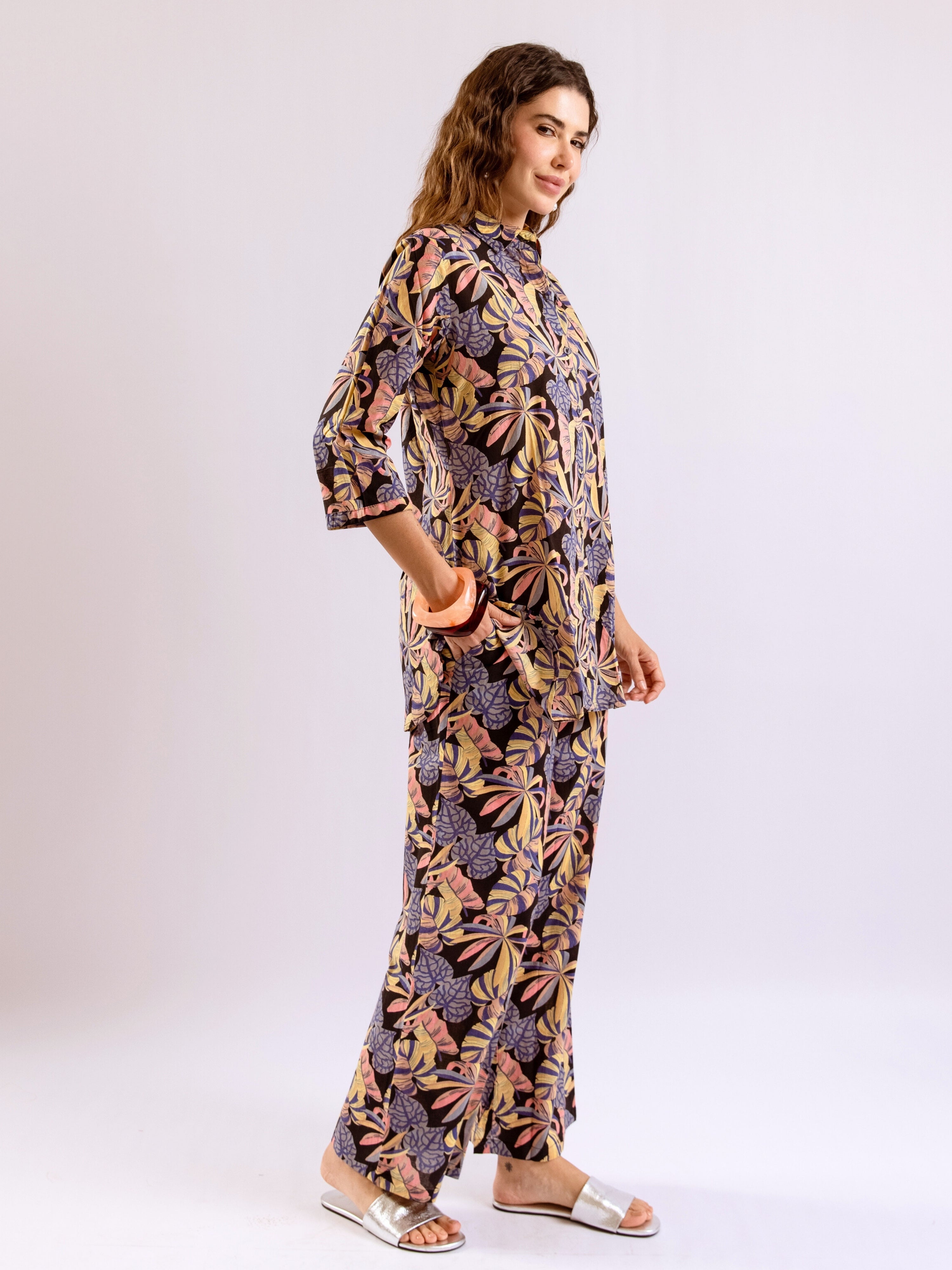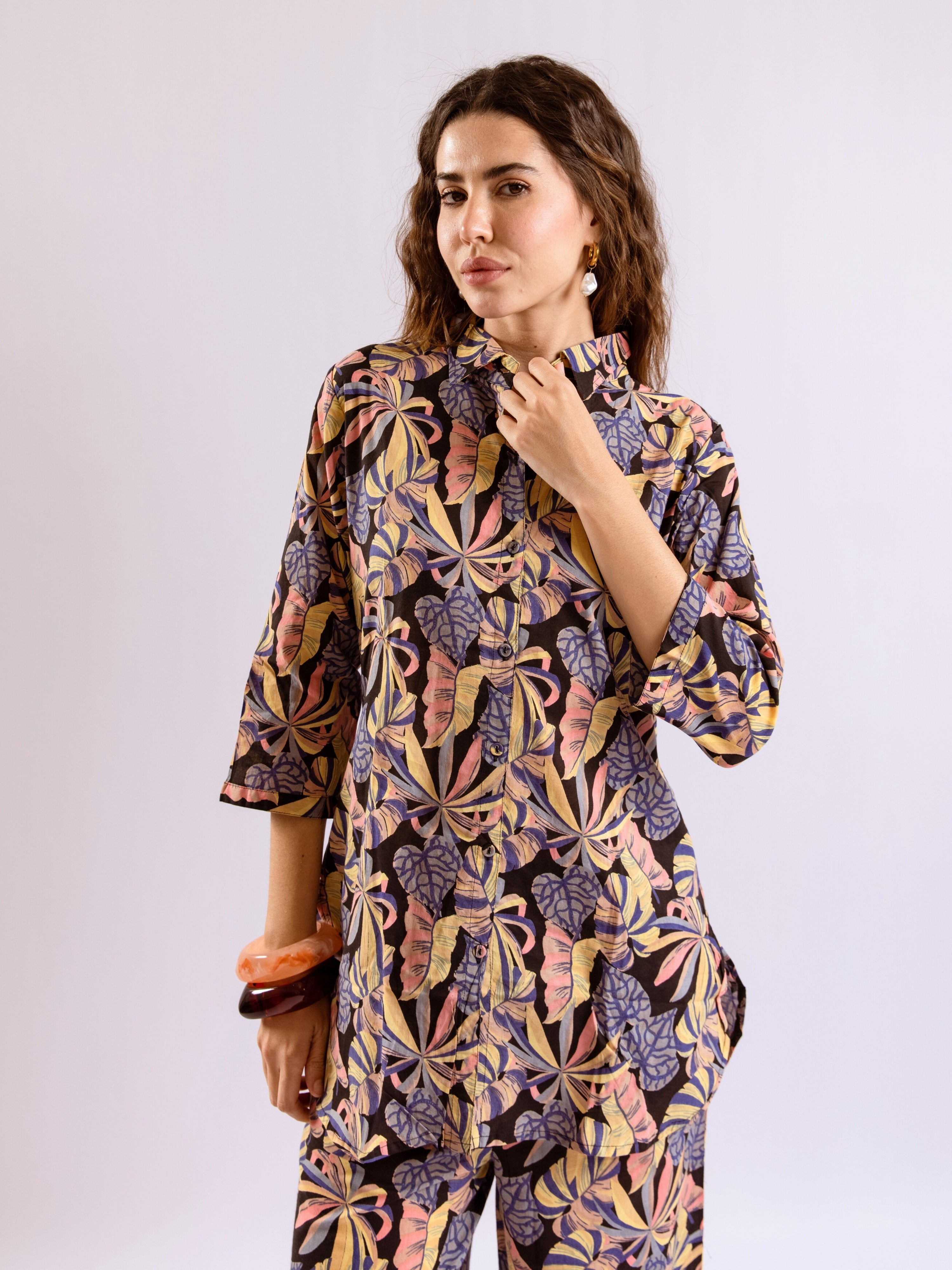 Tropical Noir Flower Collared Shirt Co-Ord Set