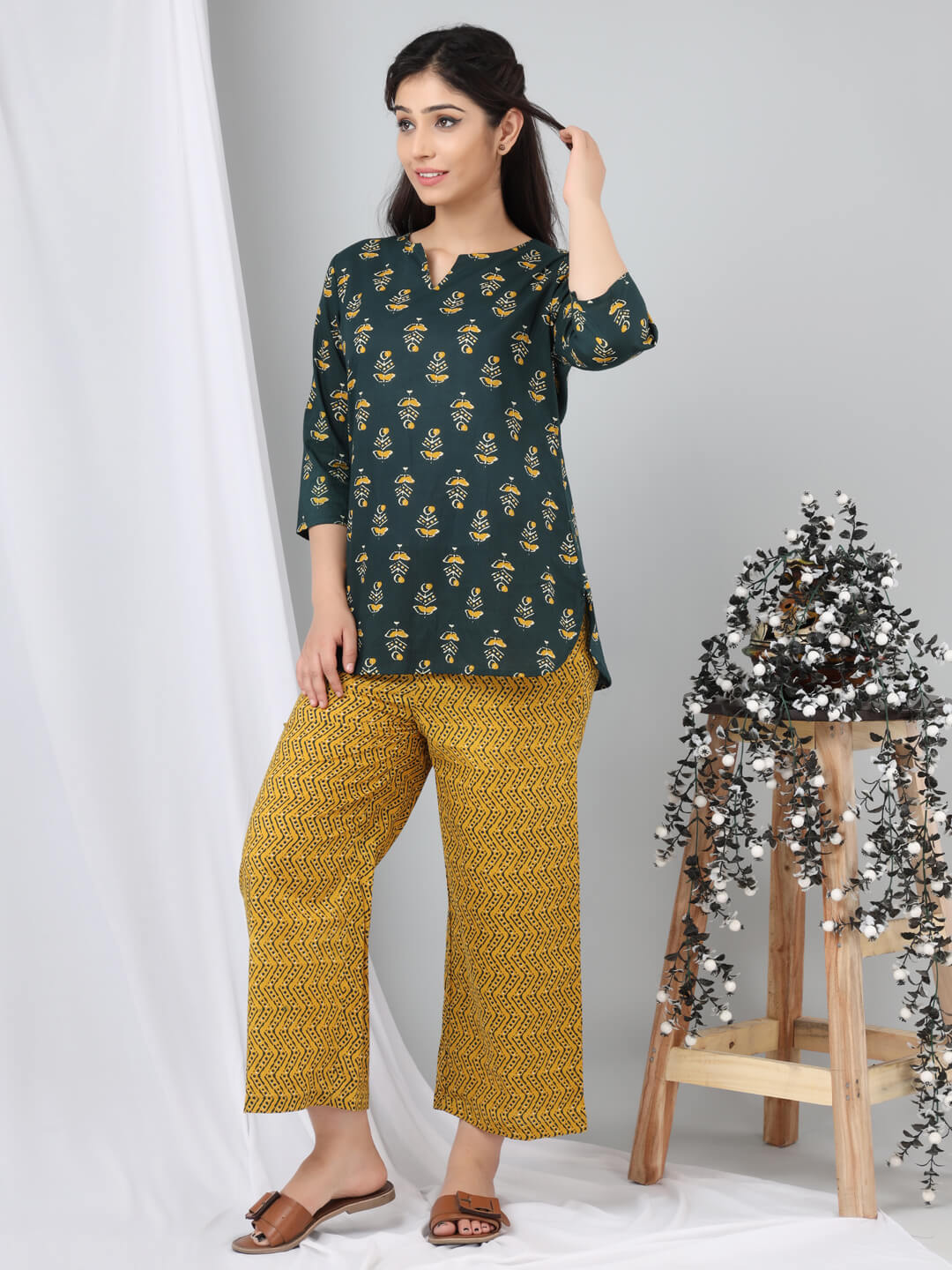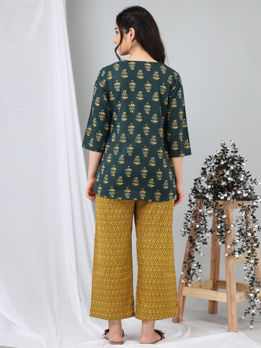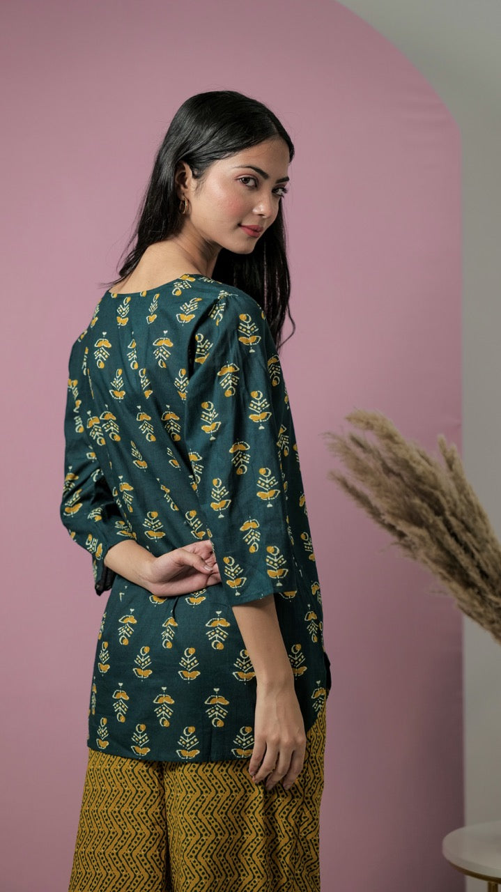 An ideal choice for your loungewear wardrobe, the Cotton Set comes in a soothing color palette. The hand block-printed pattern of the breezy Cotton top complements the matching Pants perfectly.