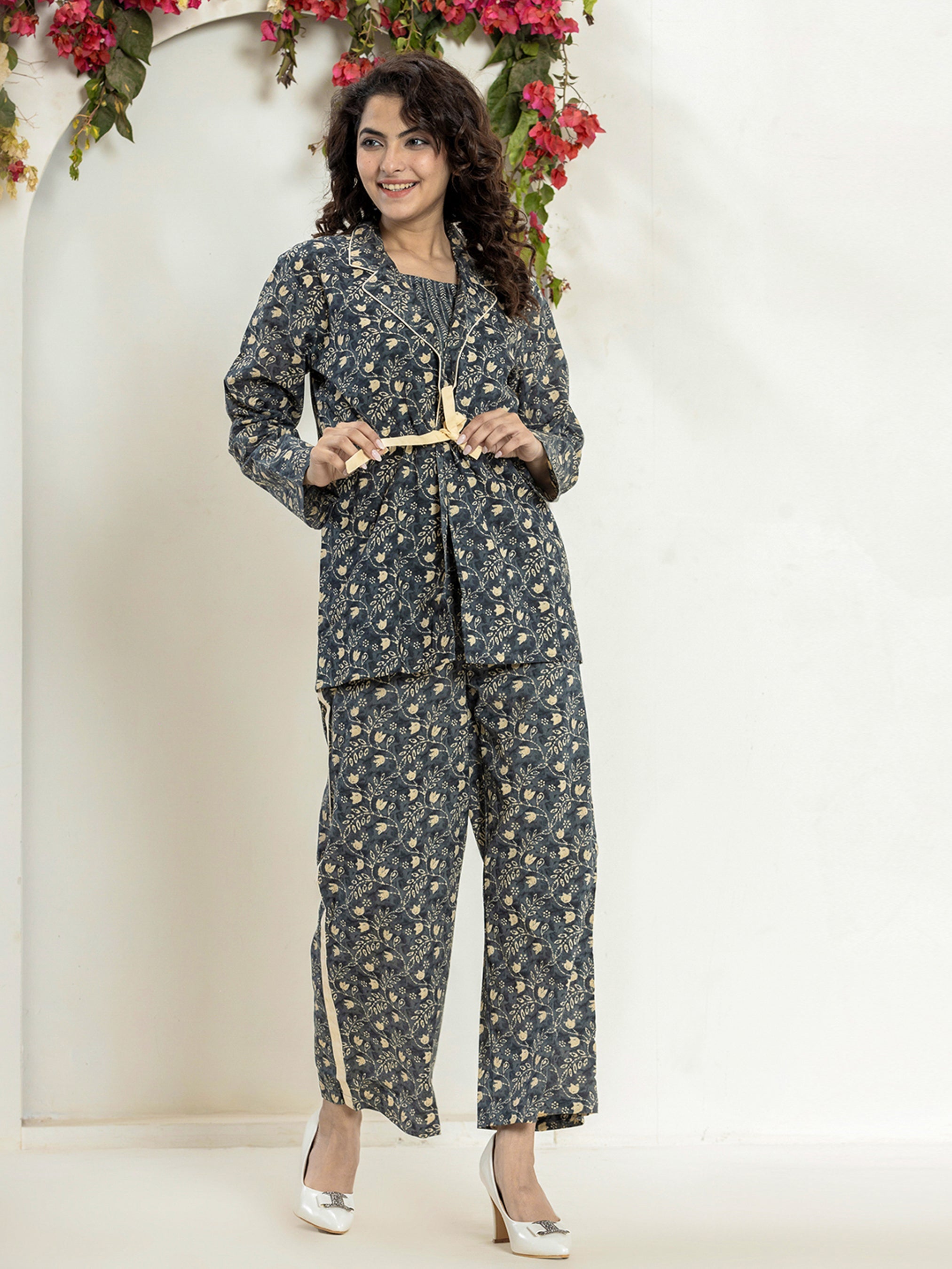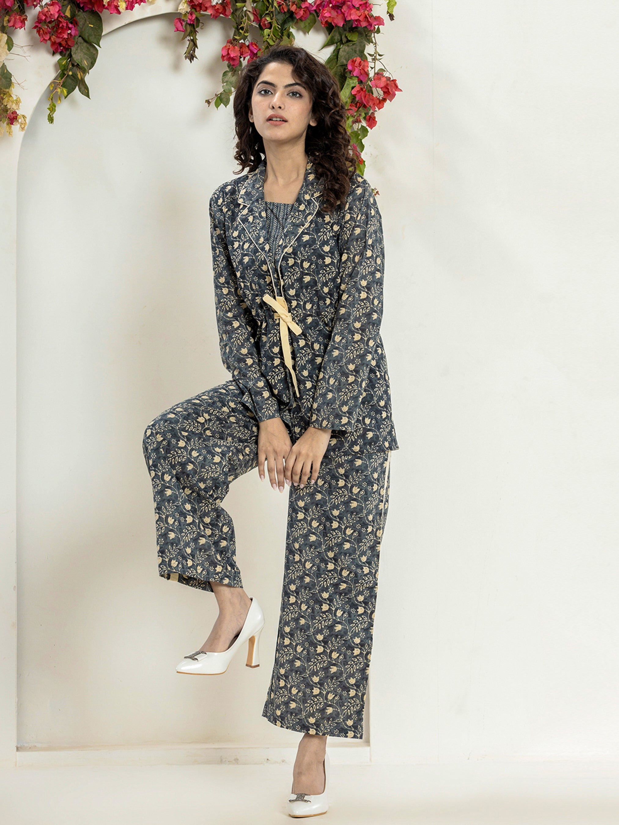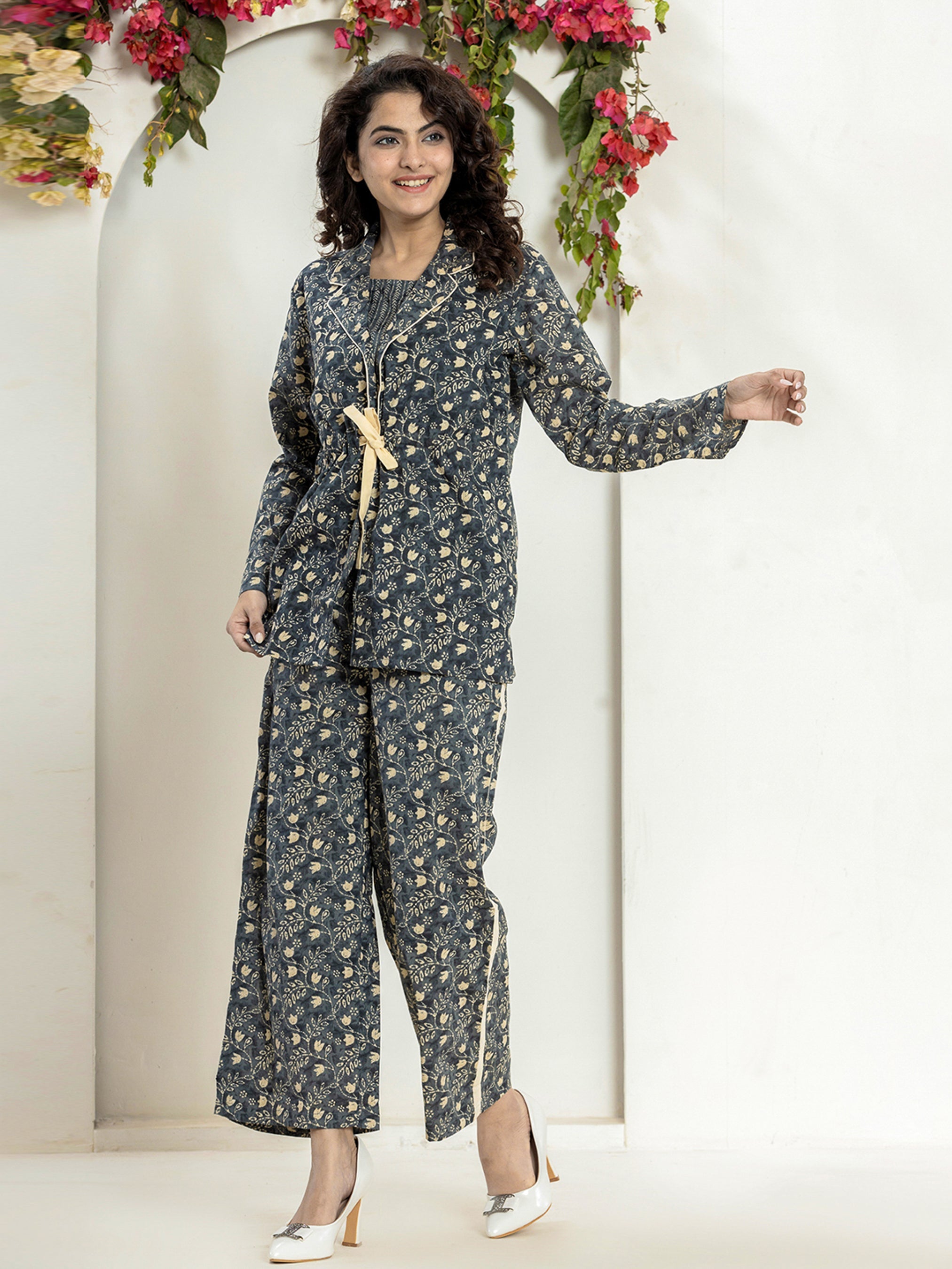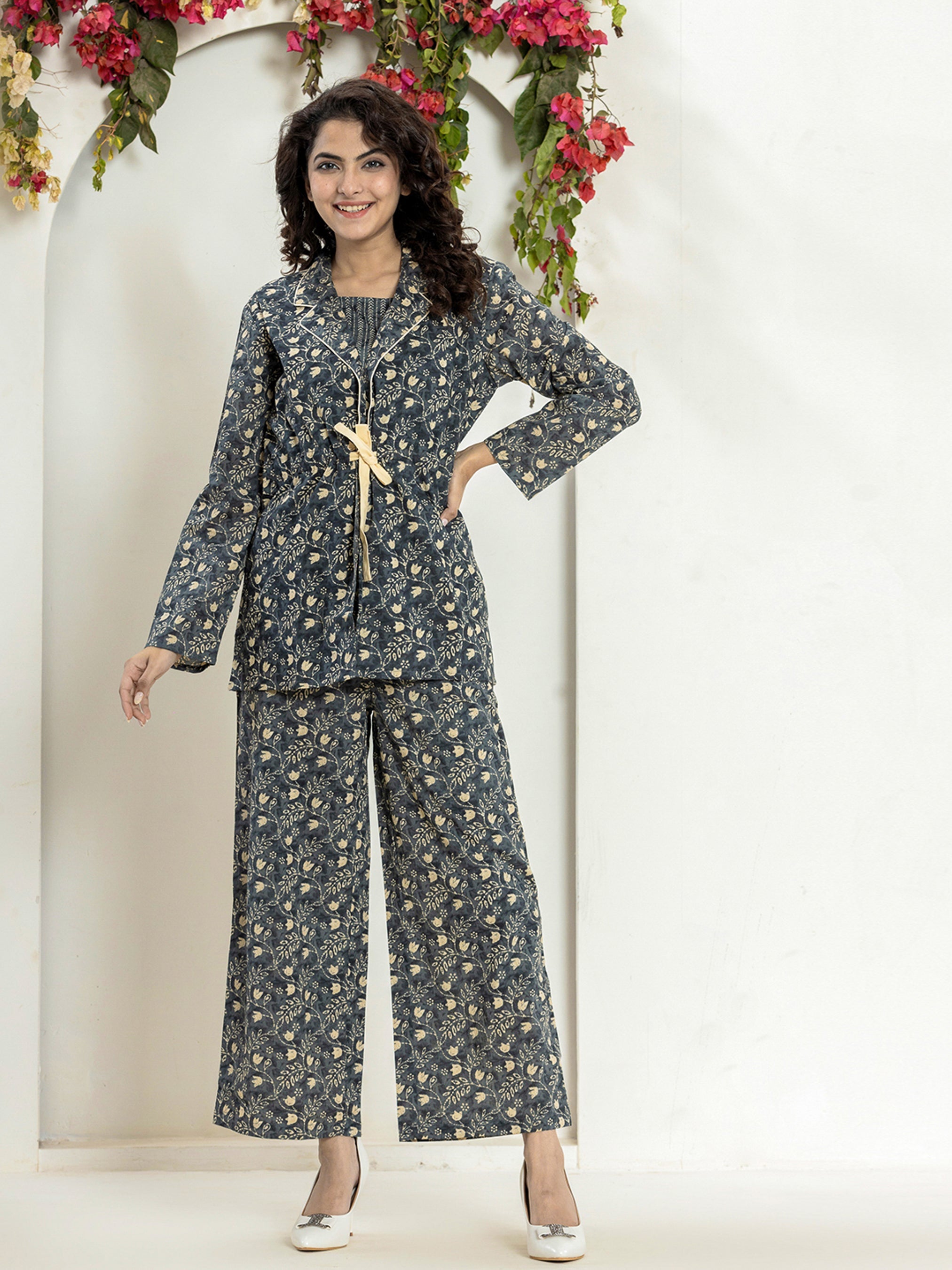 An ideal choice for your loungewear wardrobe, the Cotton Set comes in a soothing color palette. The hand-block-printed pattern of the breezy Cotton top complements the matching Pants perfectly.