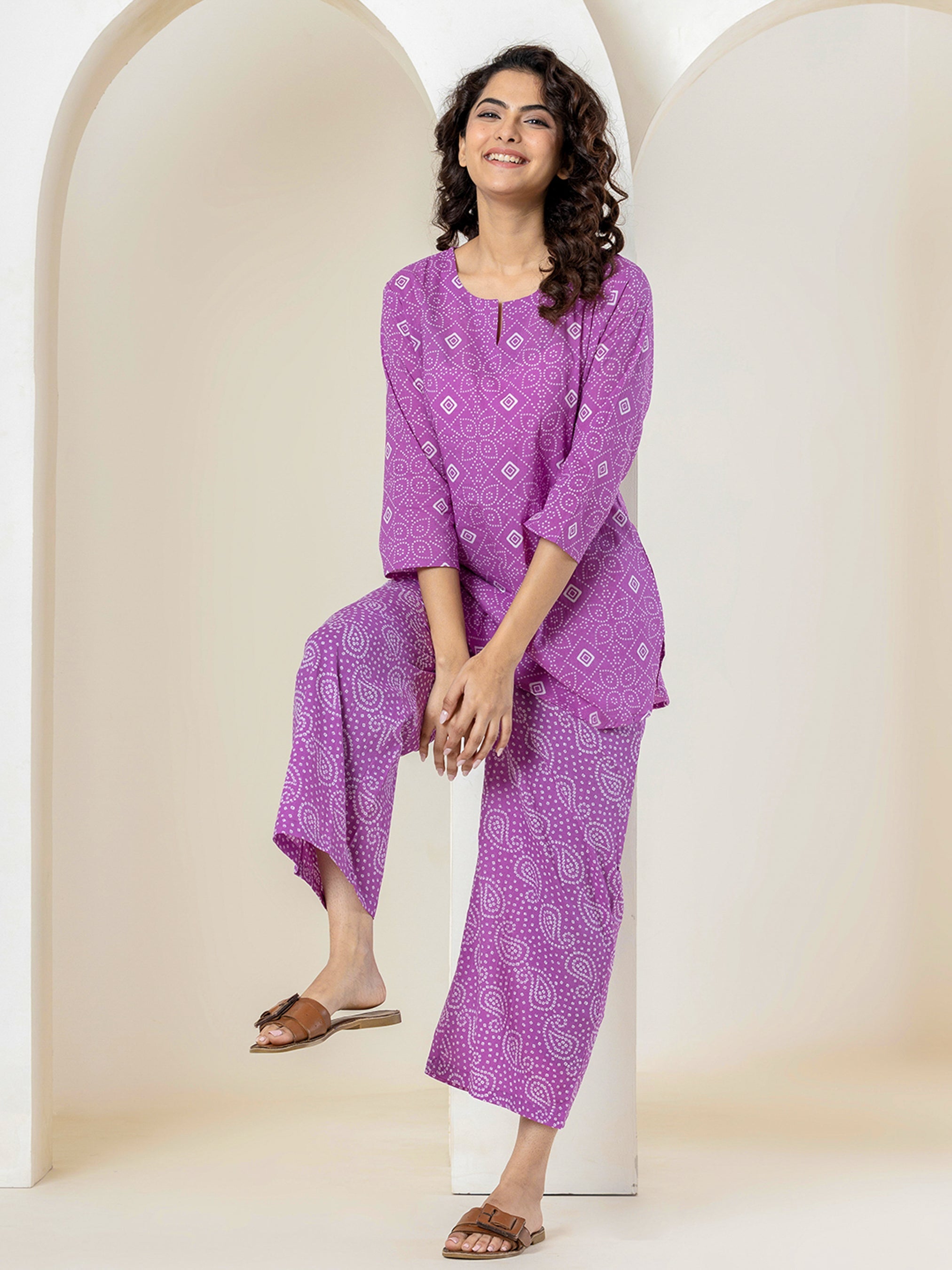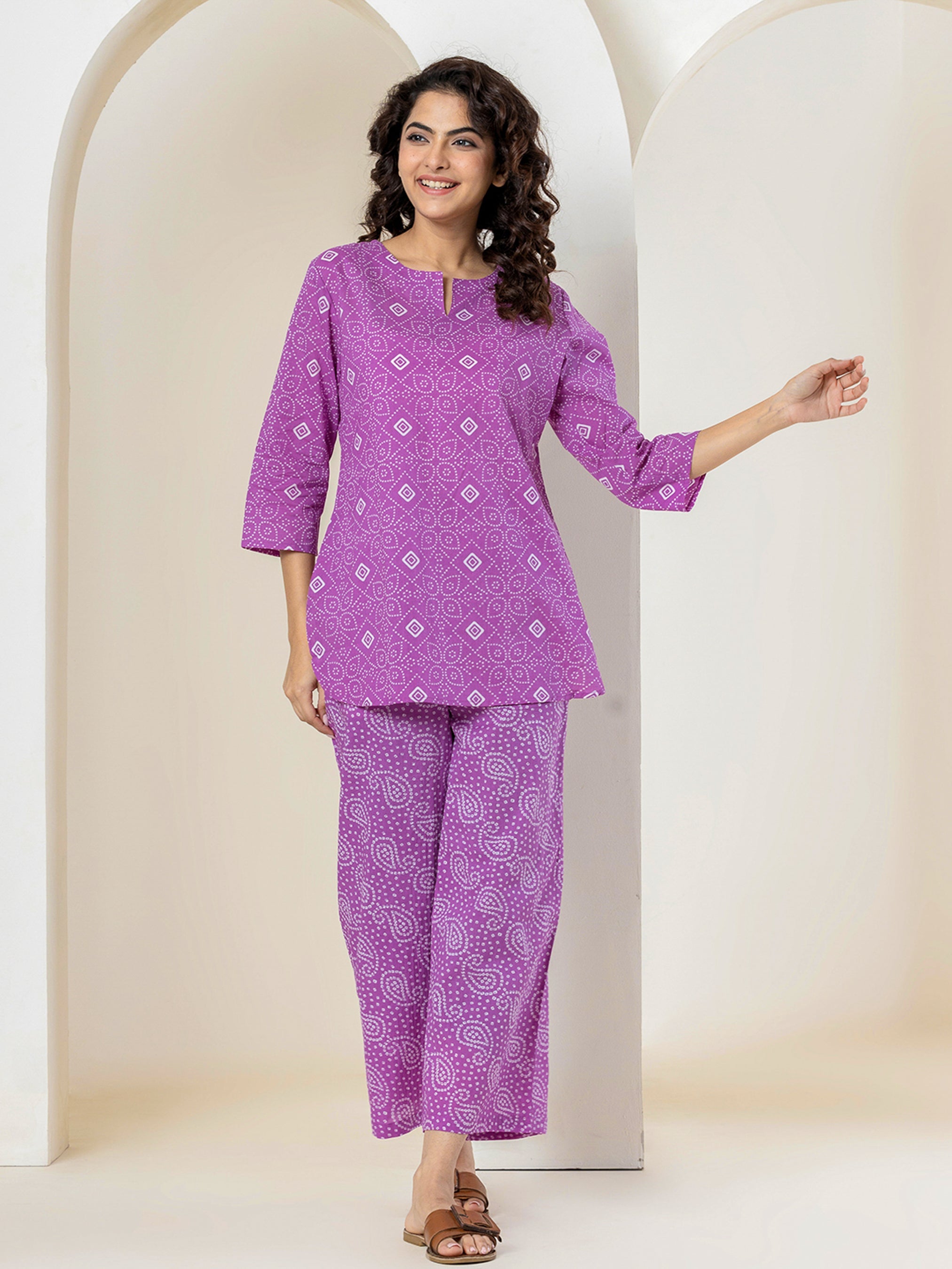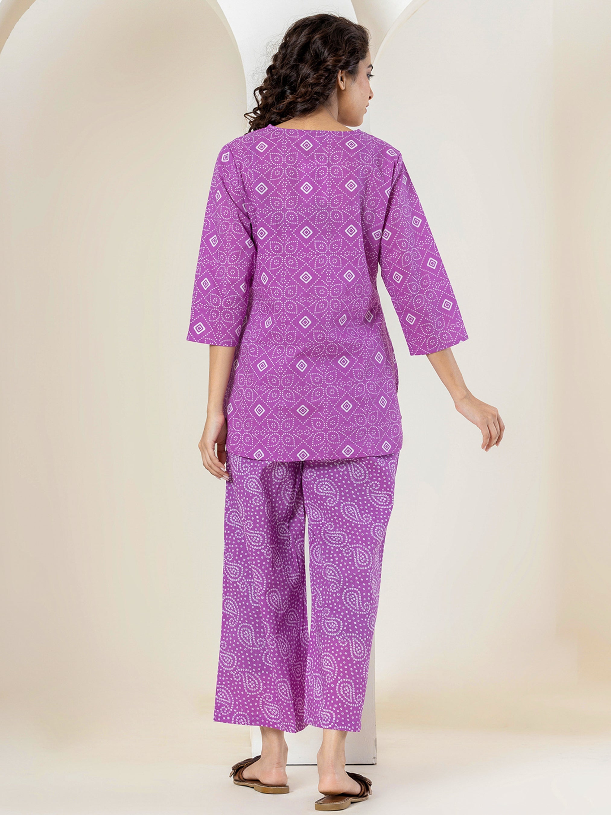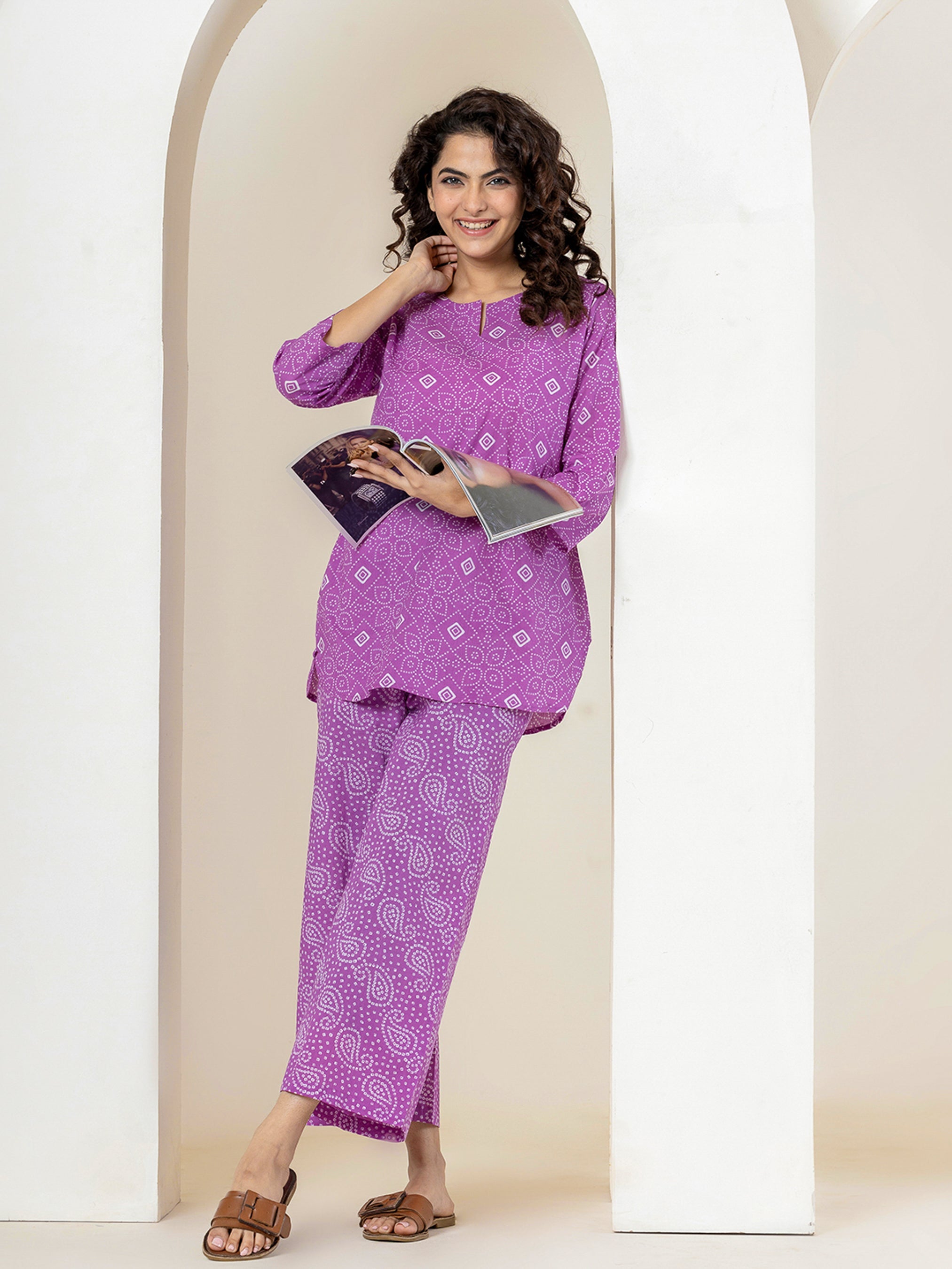 Lilac Leheriya Pure Cotton Hand Printed Loungewear