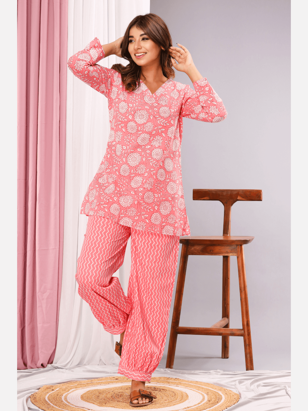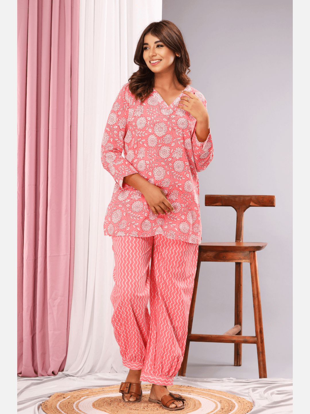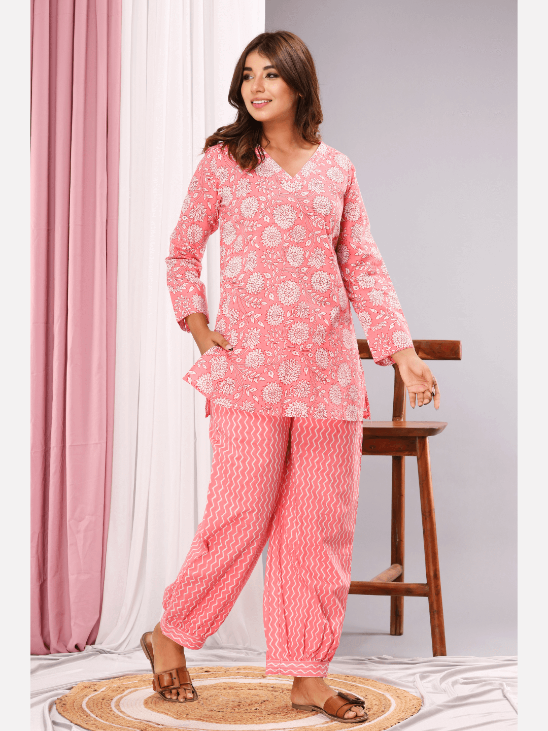 An ideal choice for your loungewear wardrobe, the Cotton Set comes in a soothing color palette. The hand block-printed pattern of the breezy Cotton top complements the matching Pants perfectly.