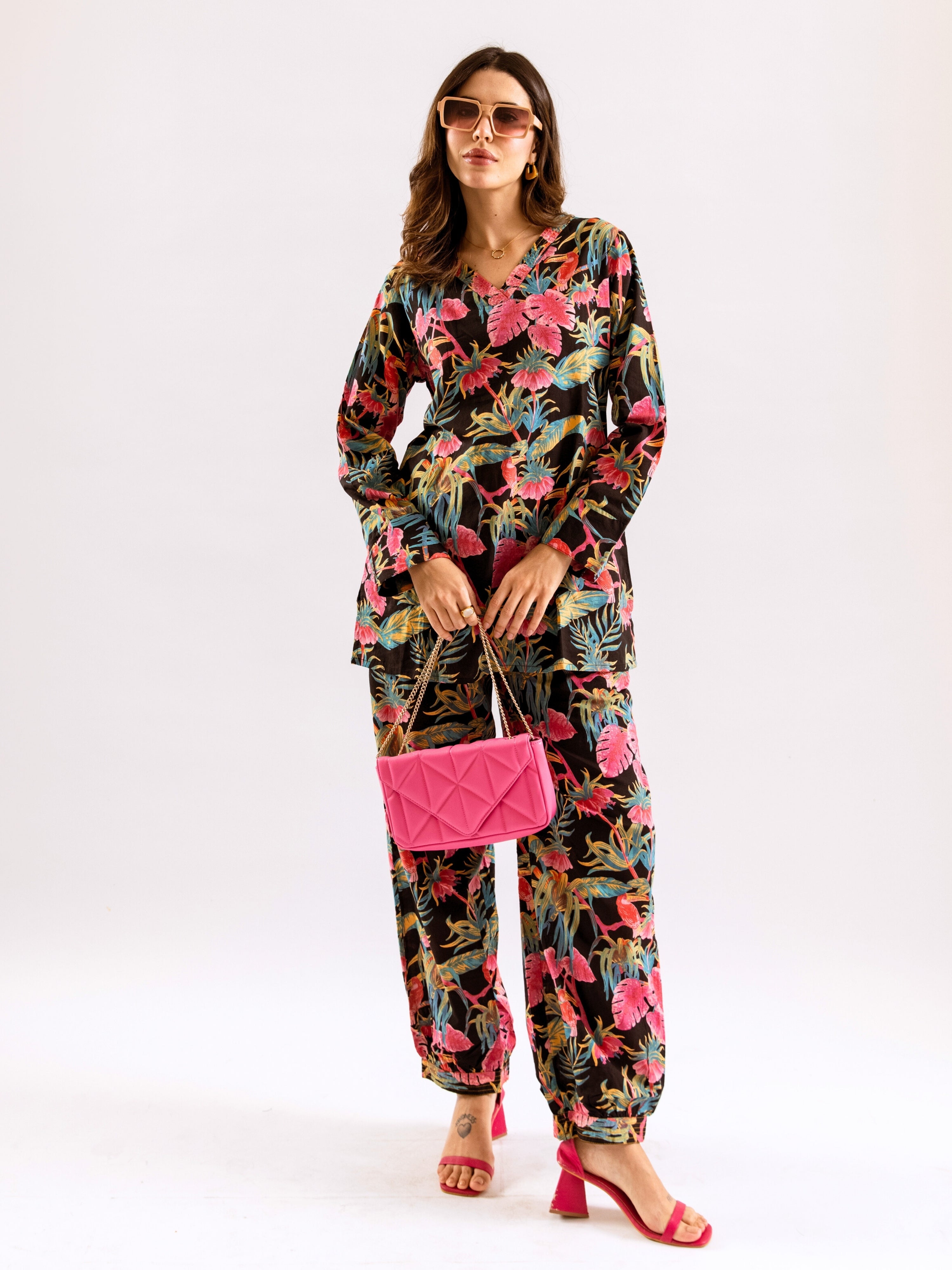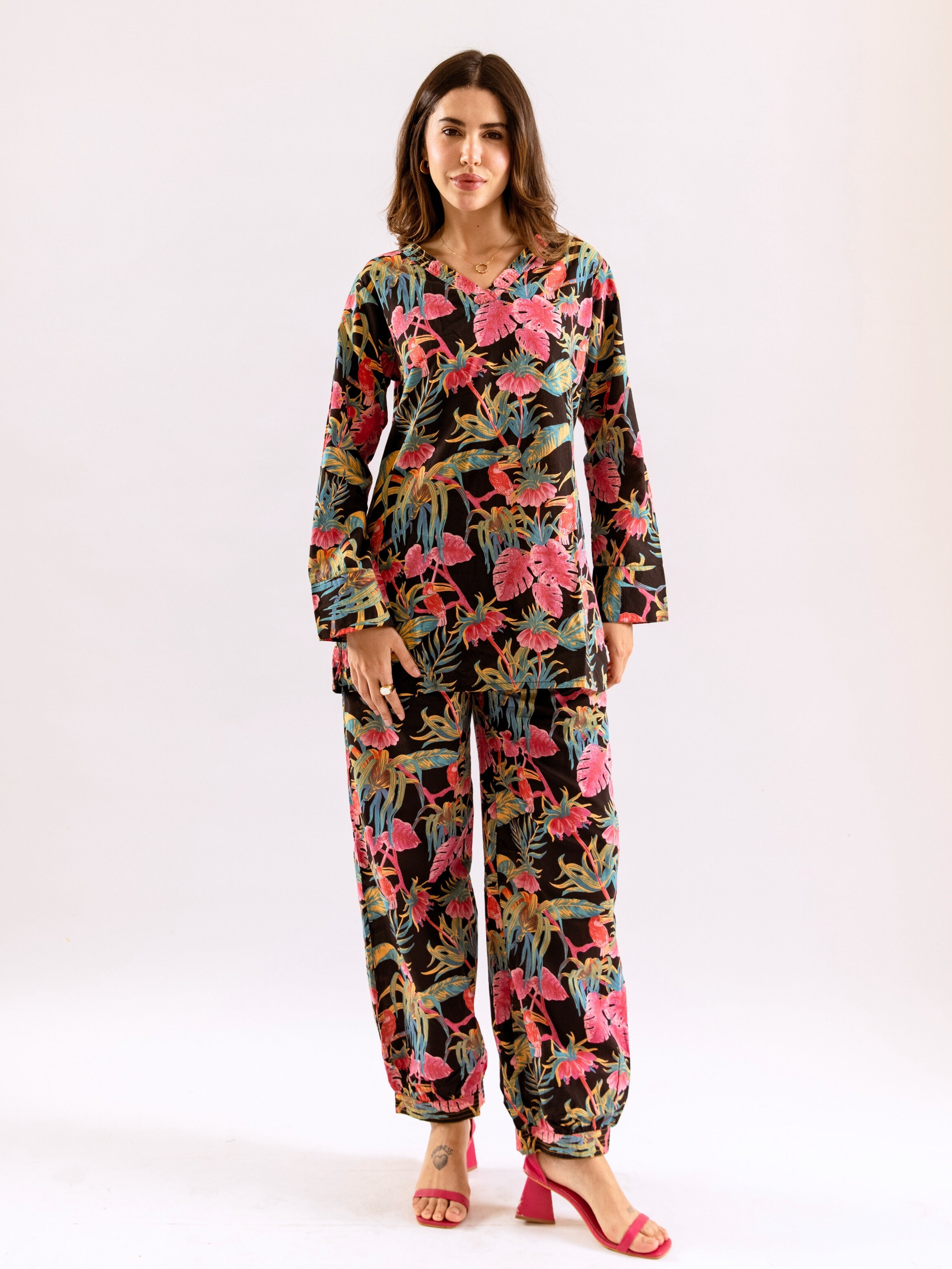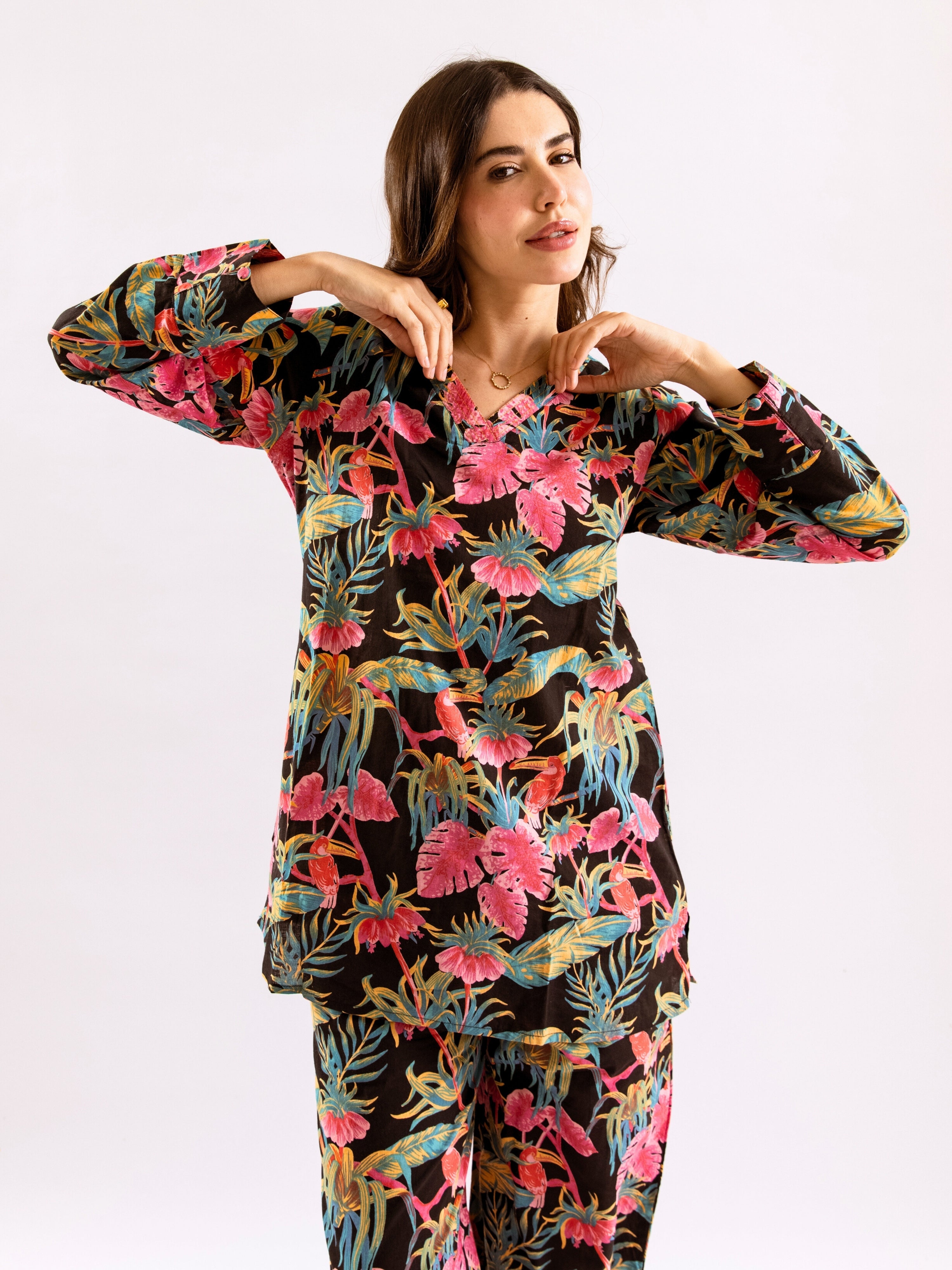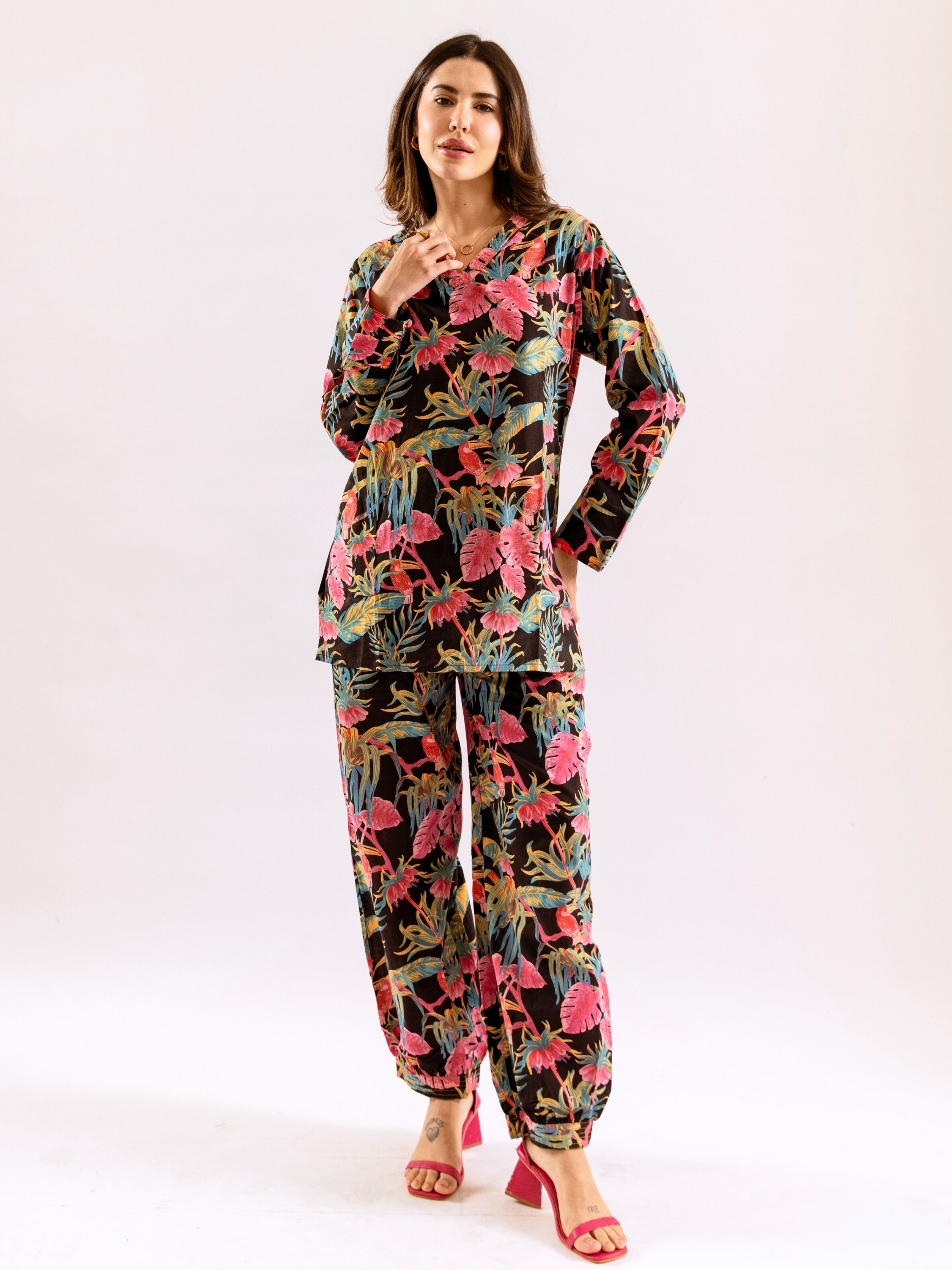 Tropical Raven's Wing Floral V-Neck Patiala Co-Ord Set
