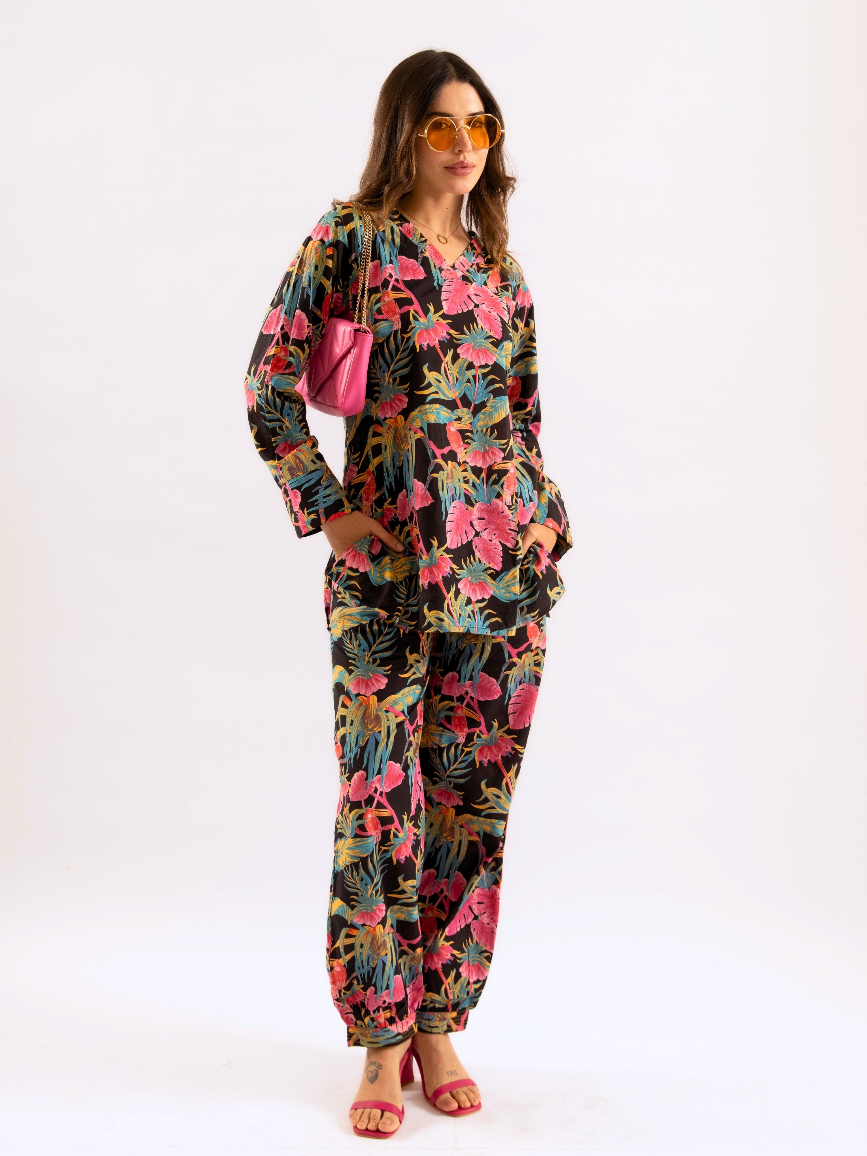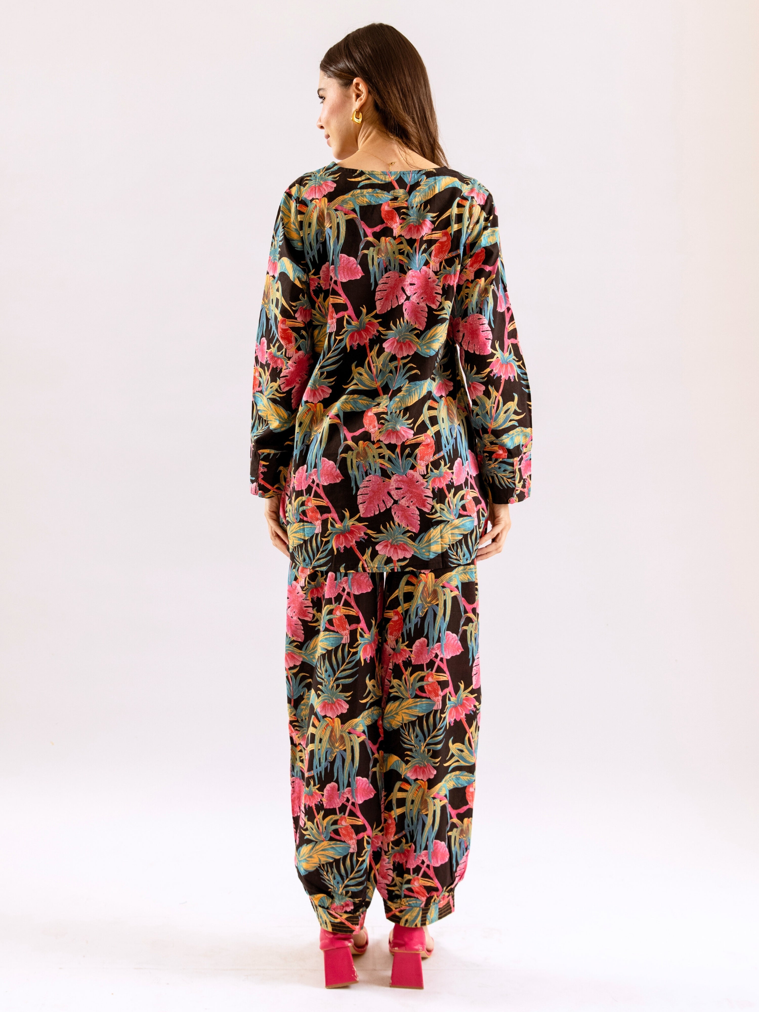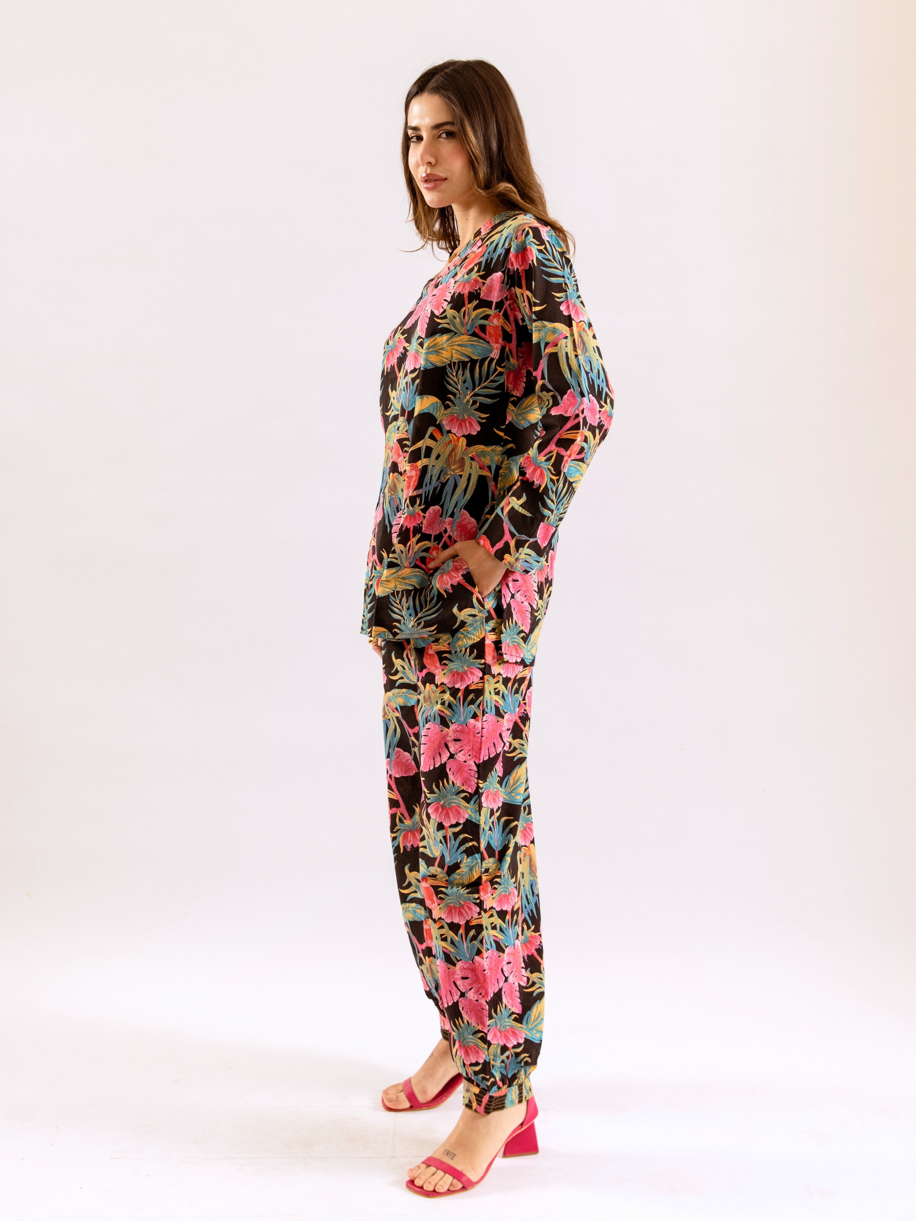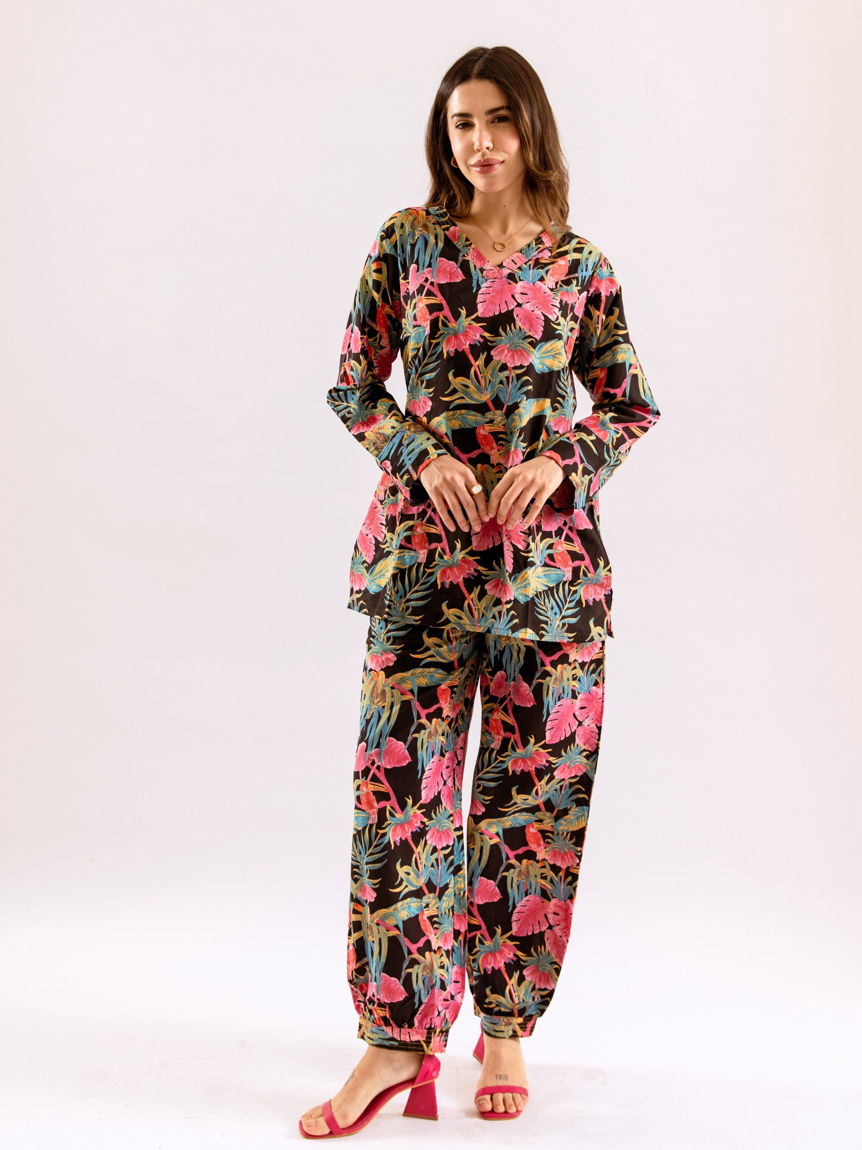 Tropical Raven's Wing Floral V-Neck Patiala Co-Ord Set
