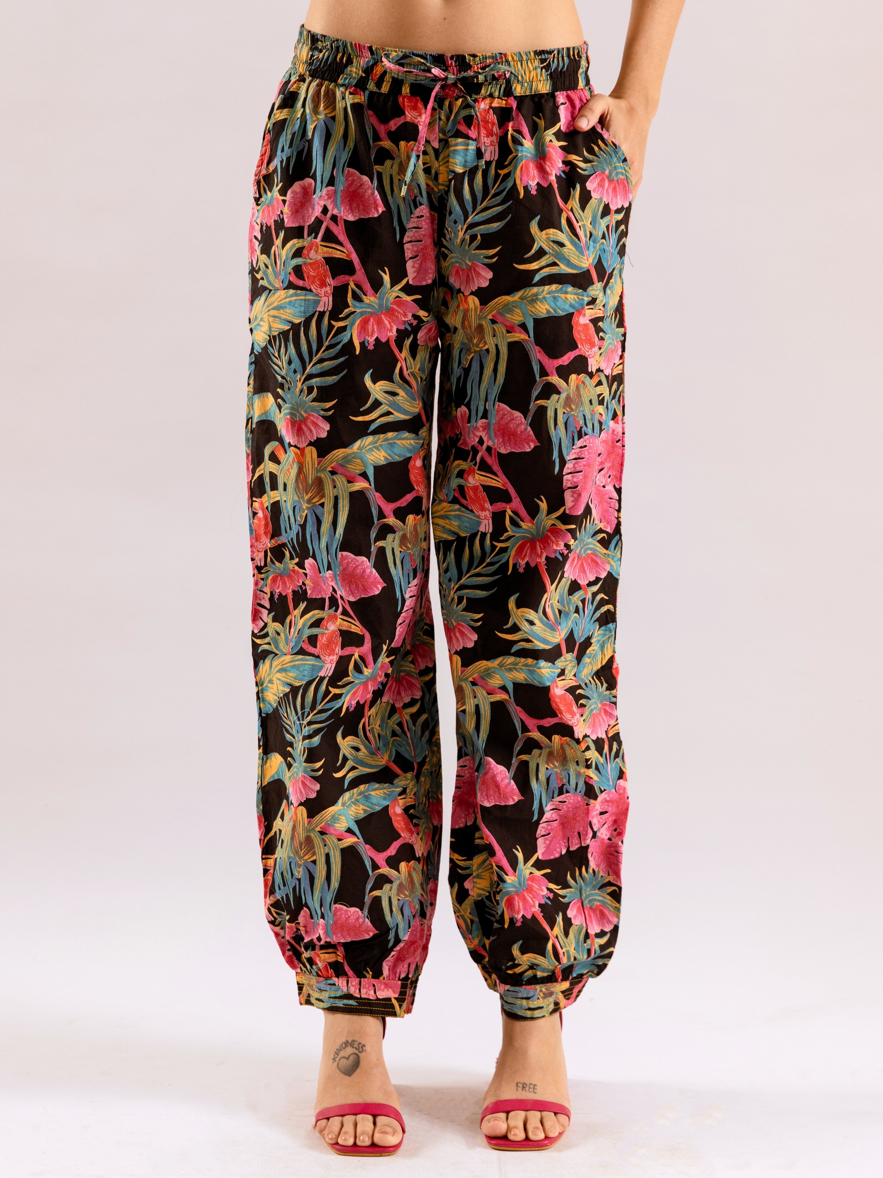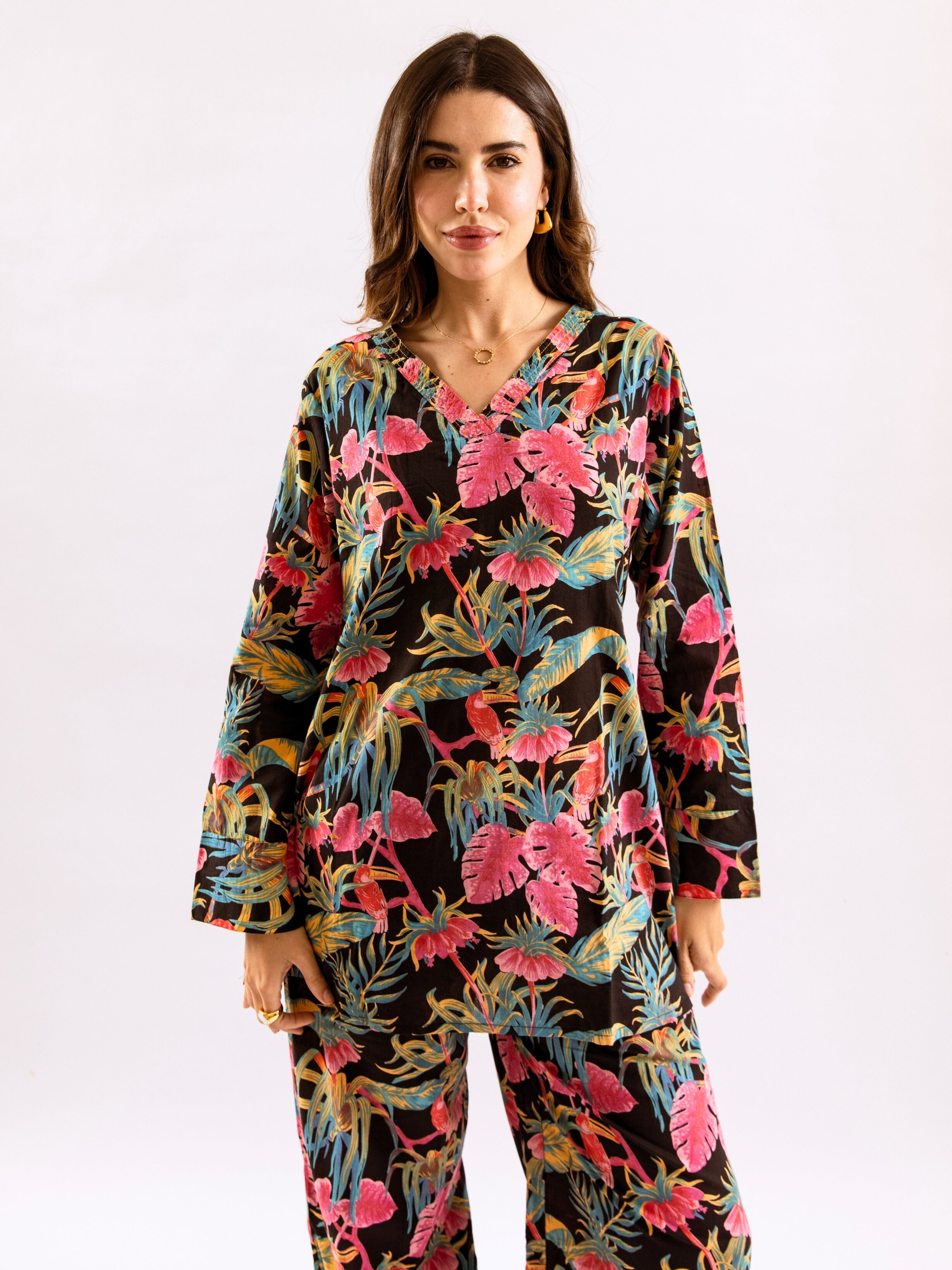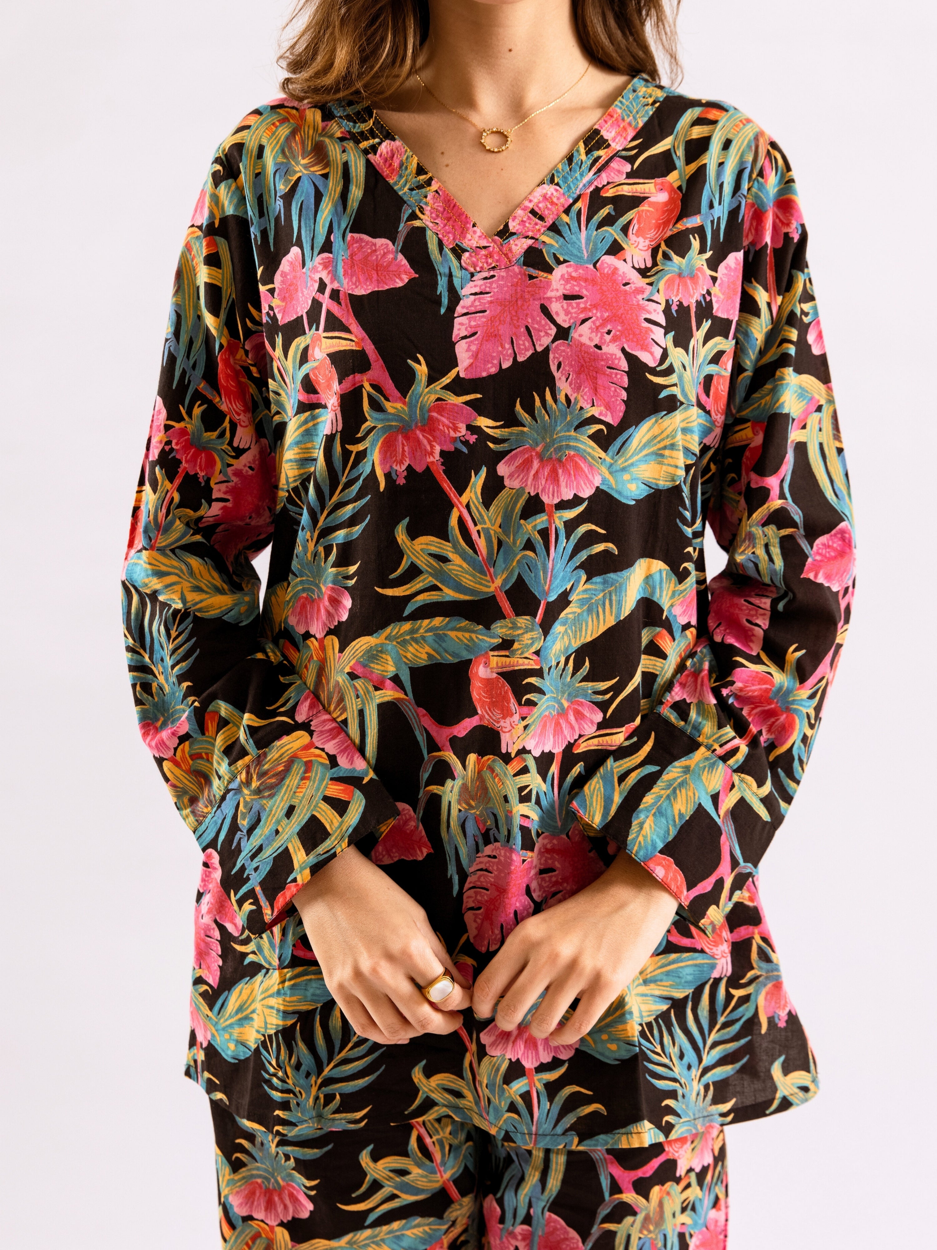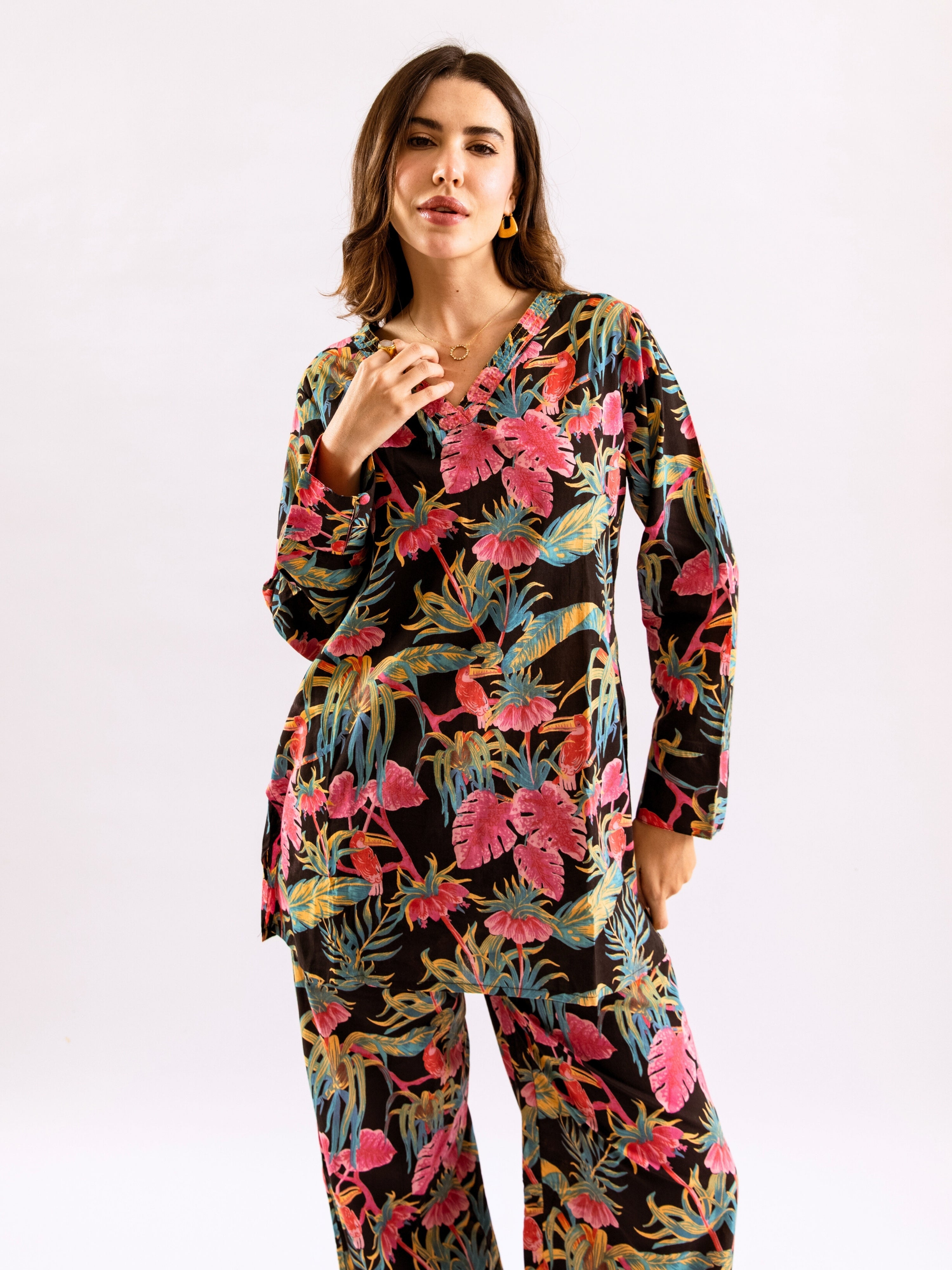 Tropical Raven's Wing Floral V-Neck Patiala Co-Ord Set