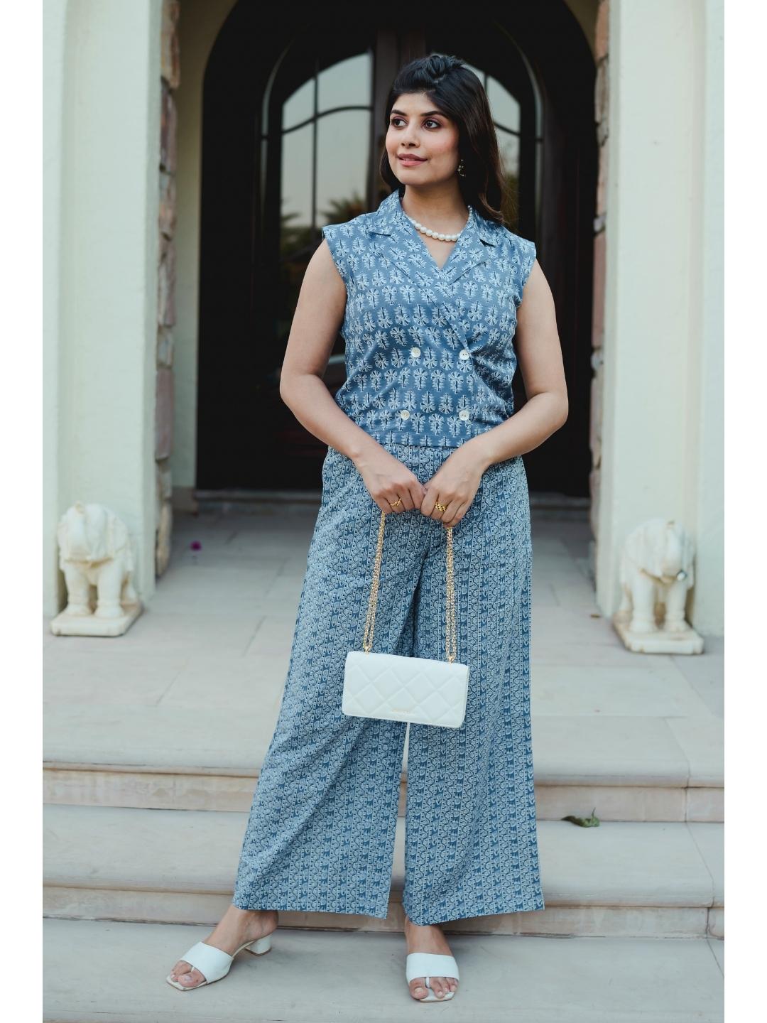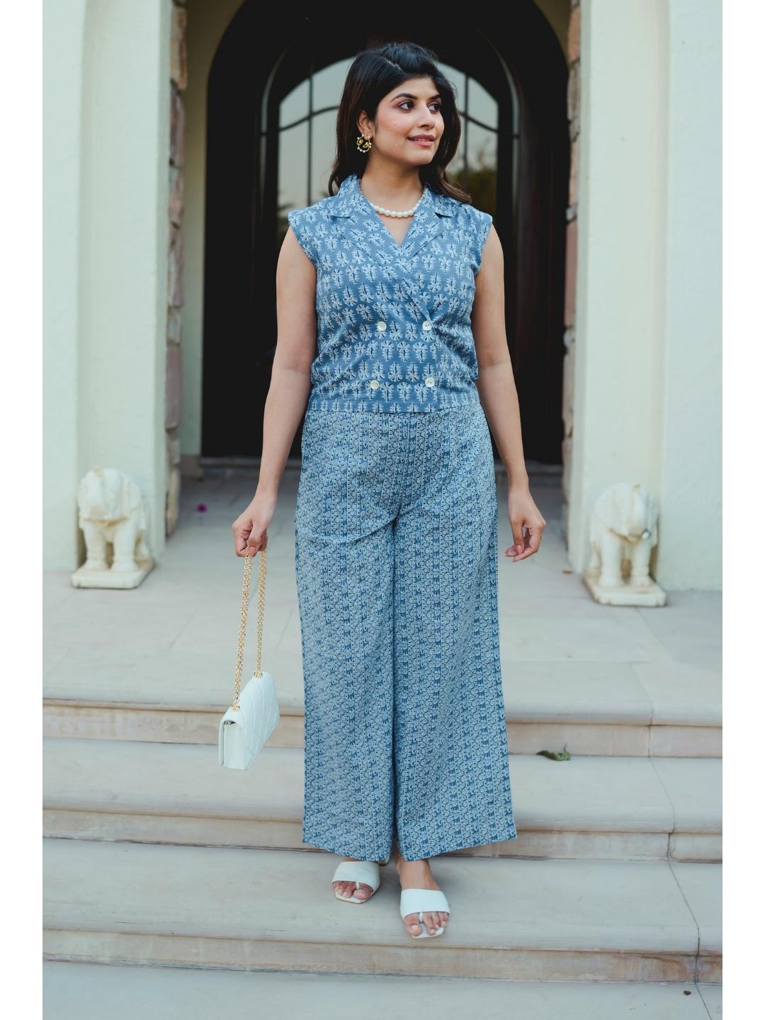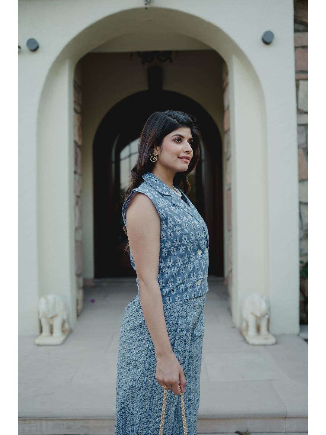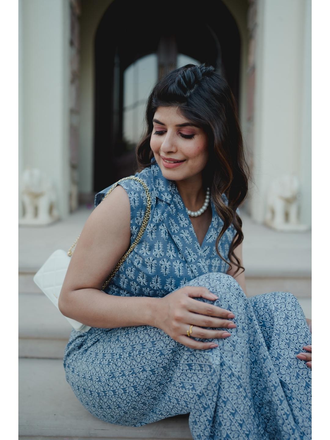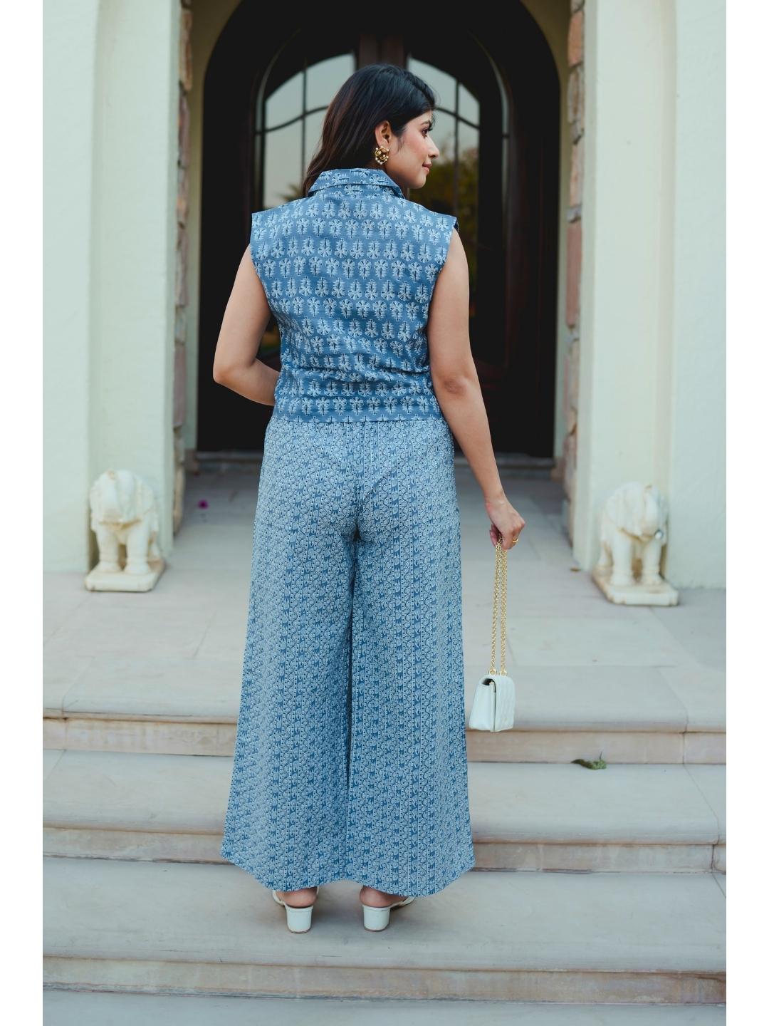 Sleeveless Collar Blue Cotton Set