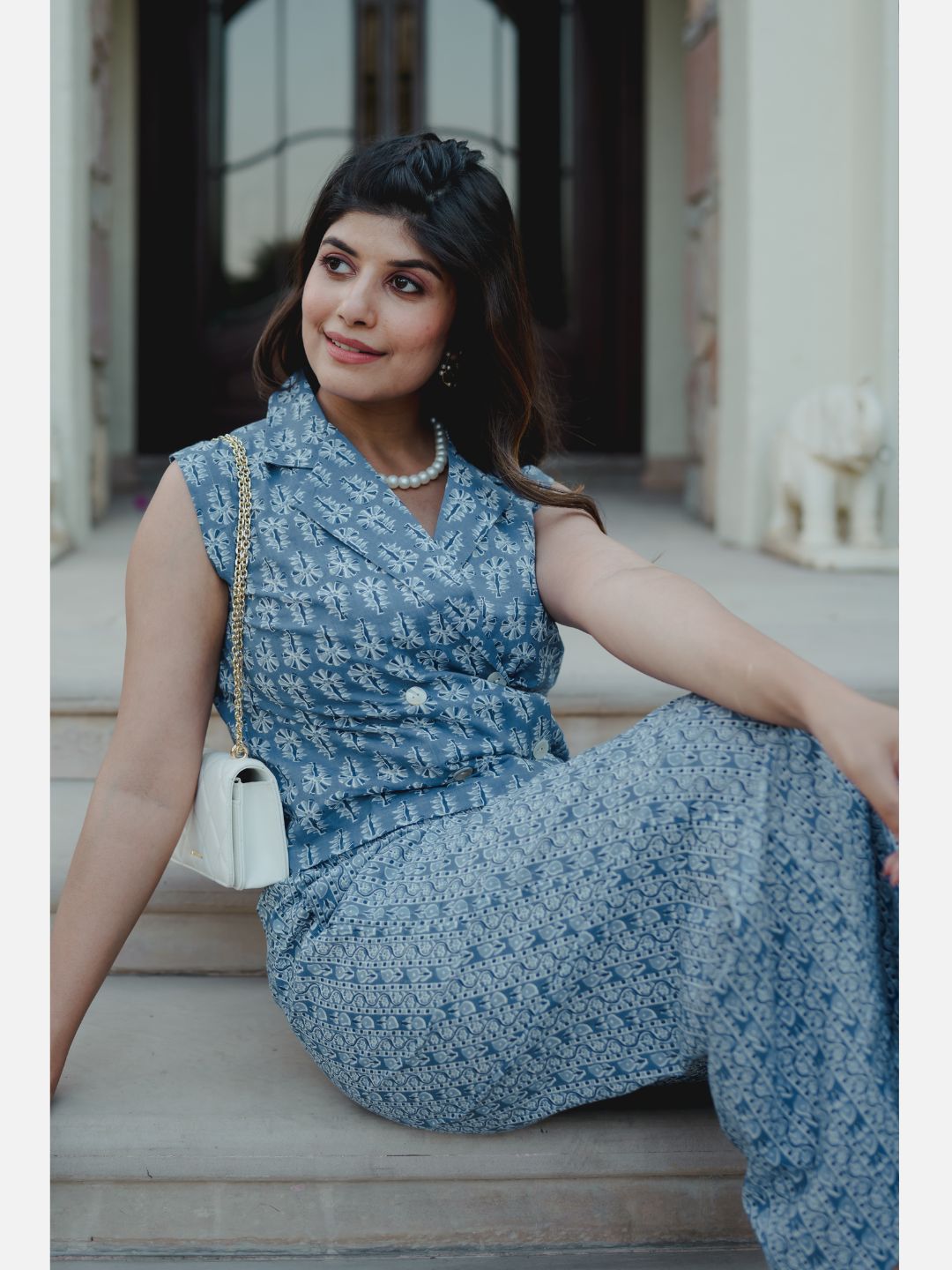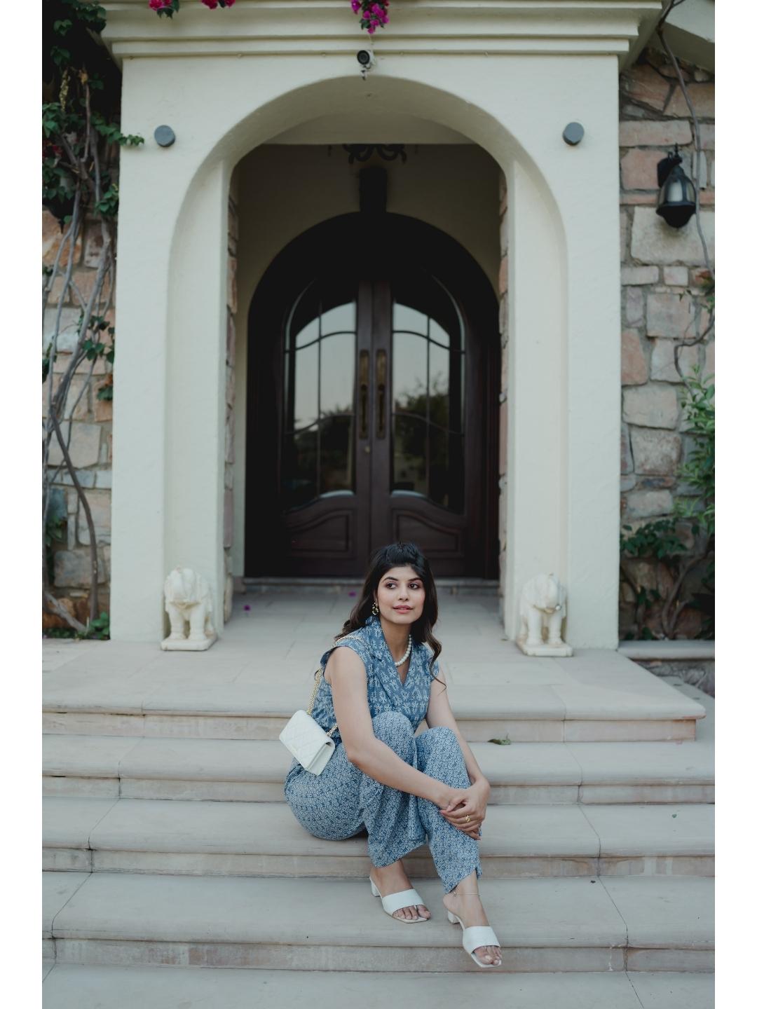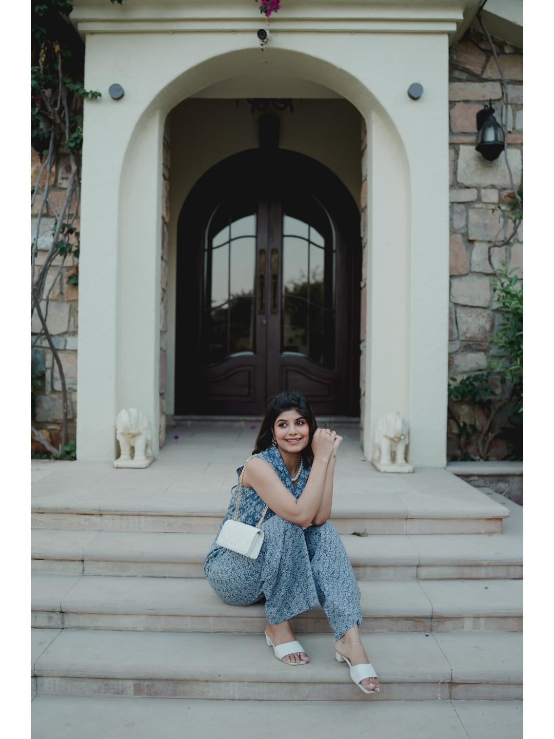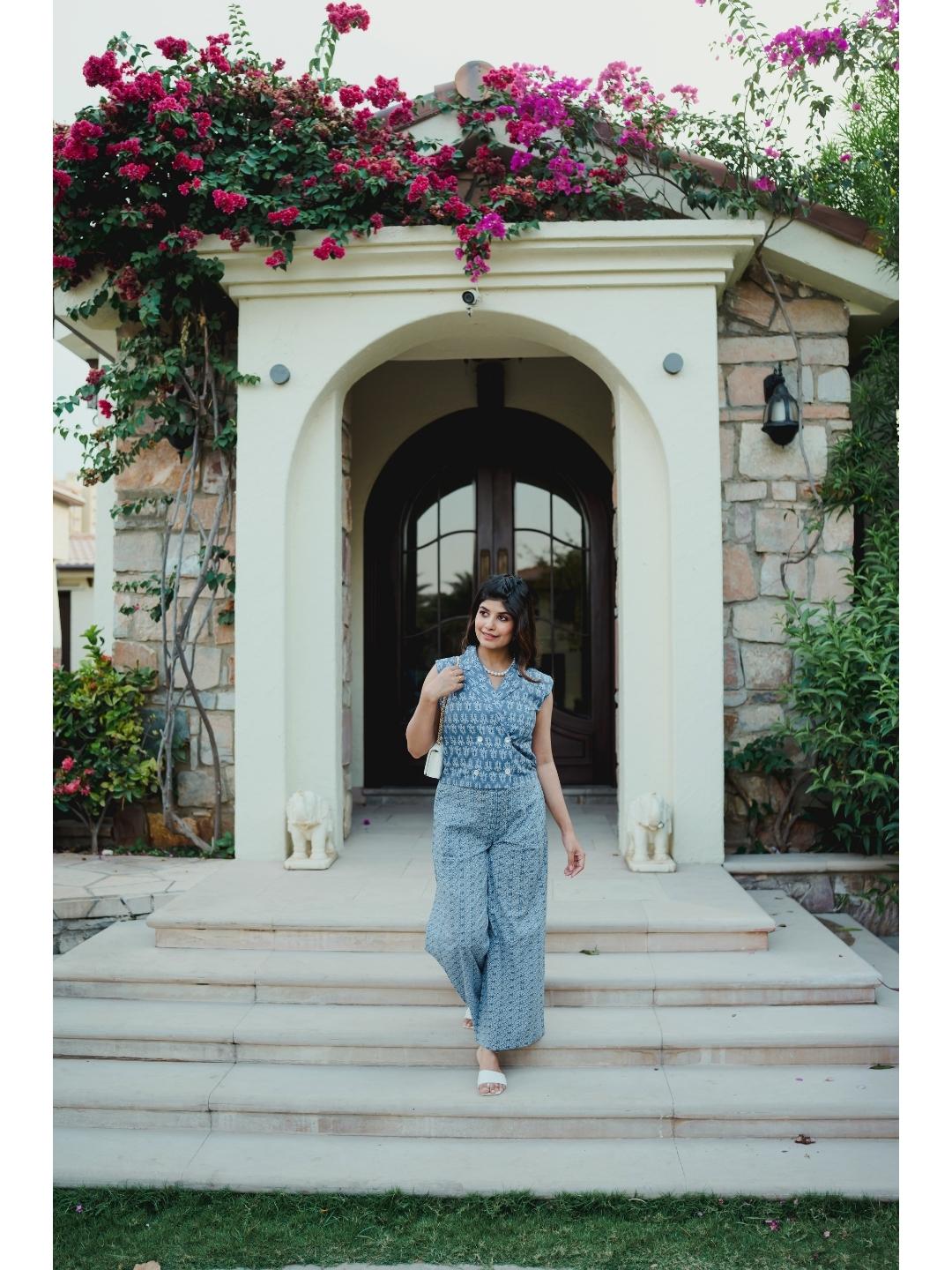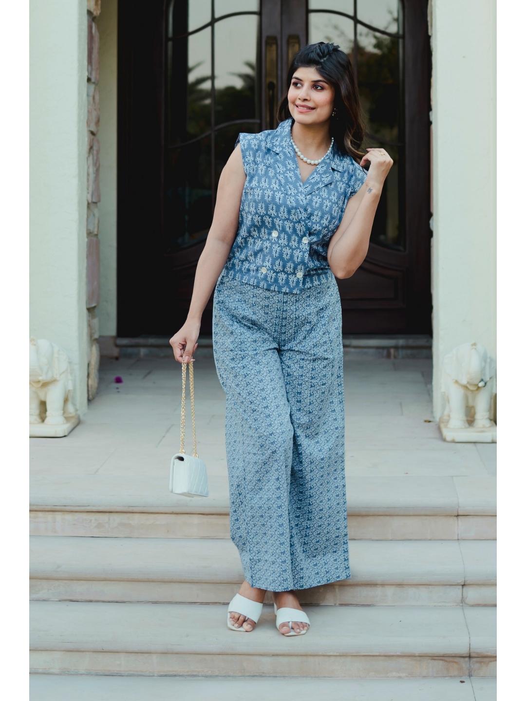 Sleeveless Collar Blue Cotton Set