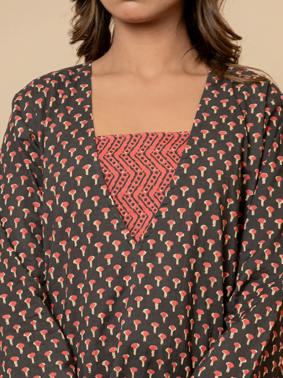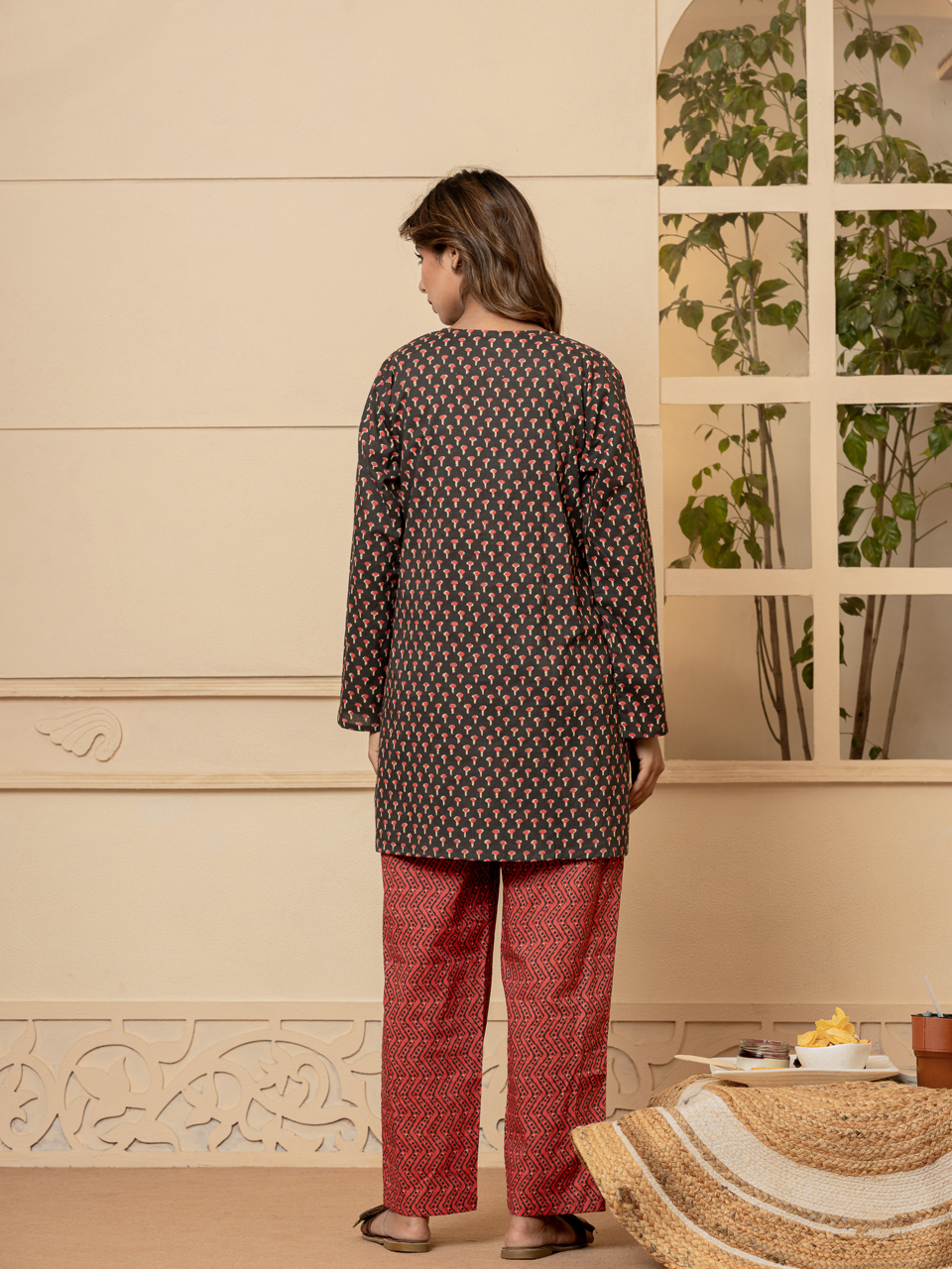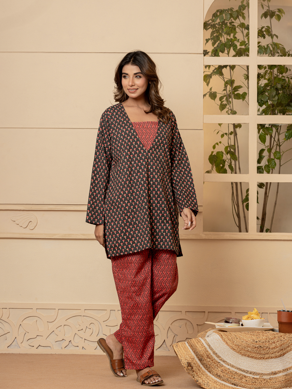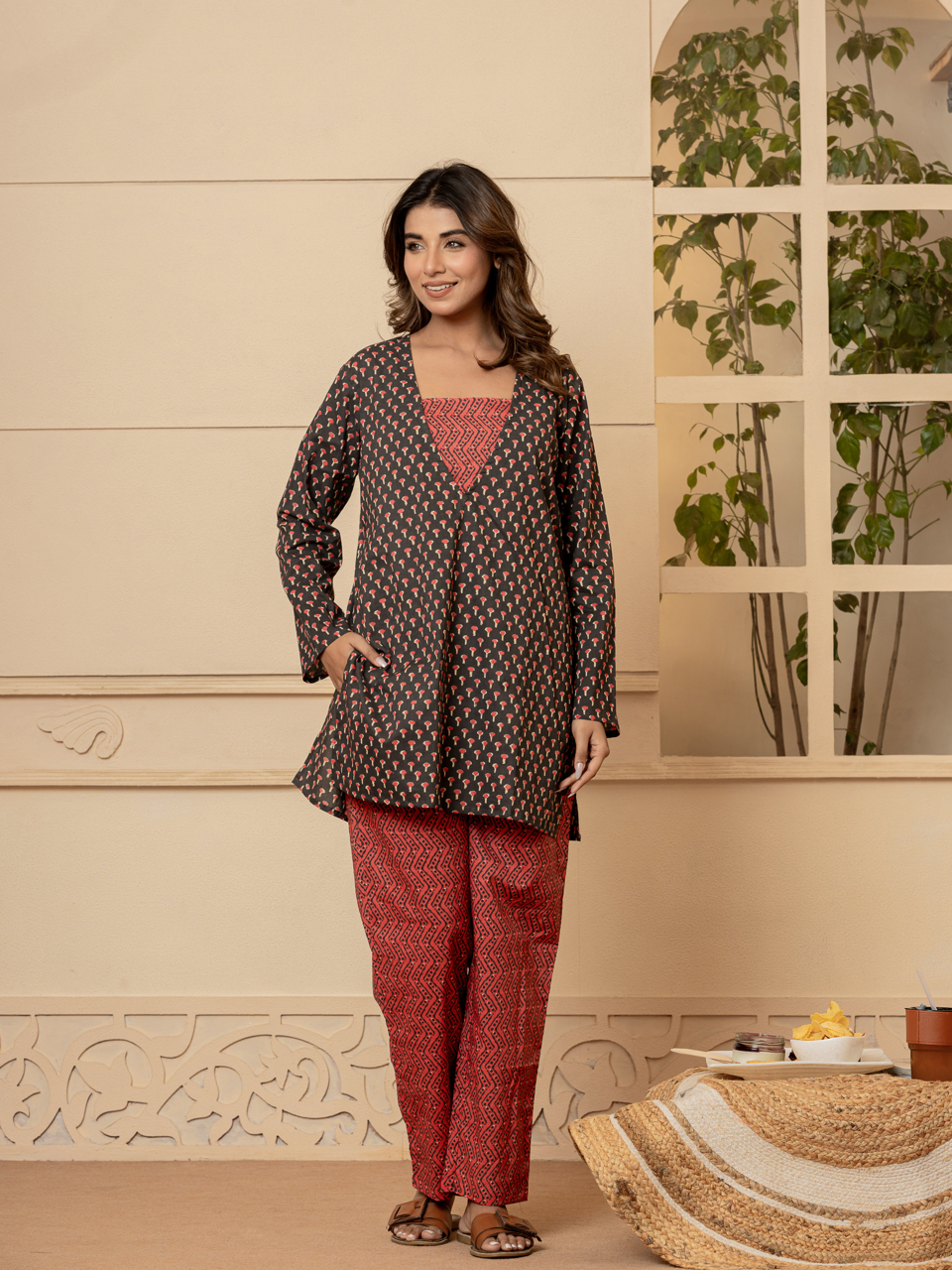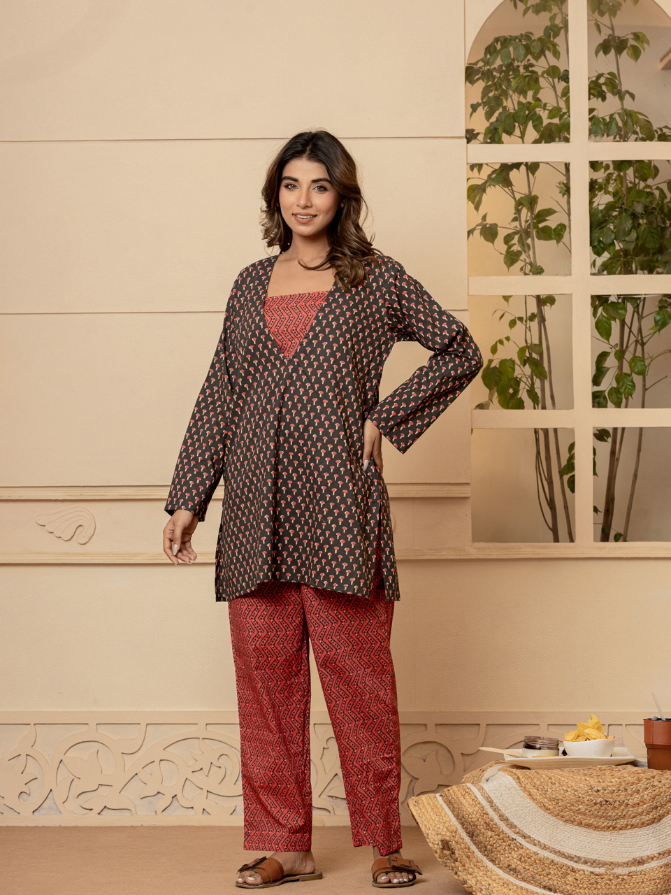 Cosmic coal crimson block print 3 - piece Pure Cotton set