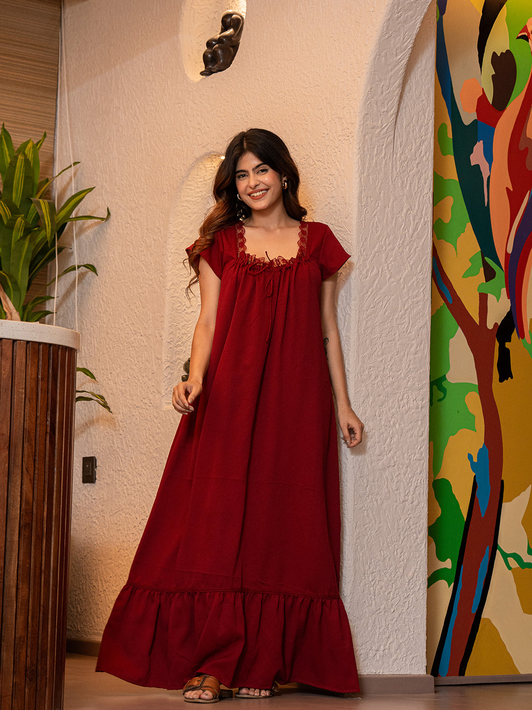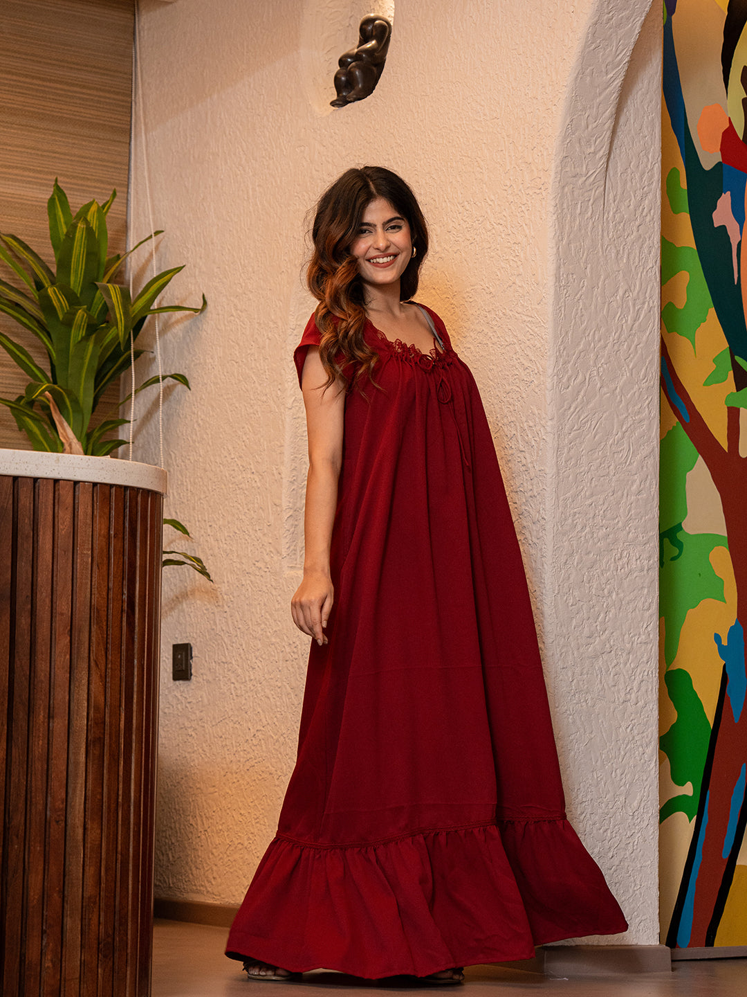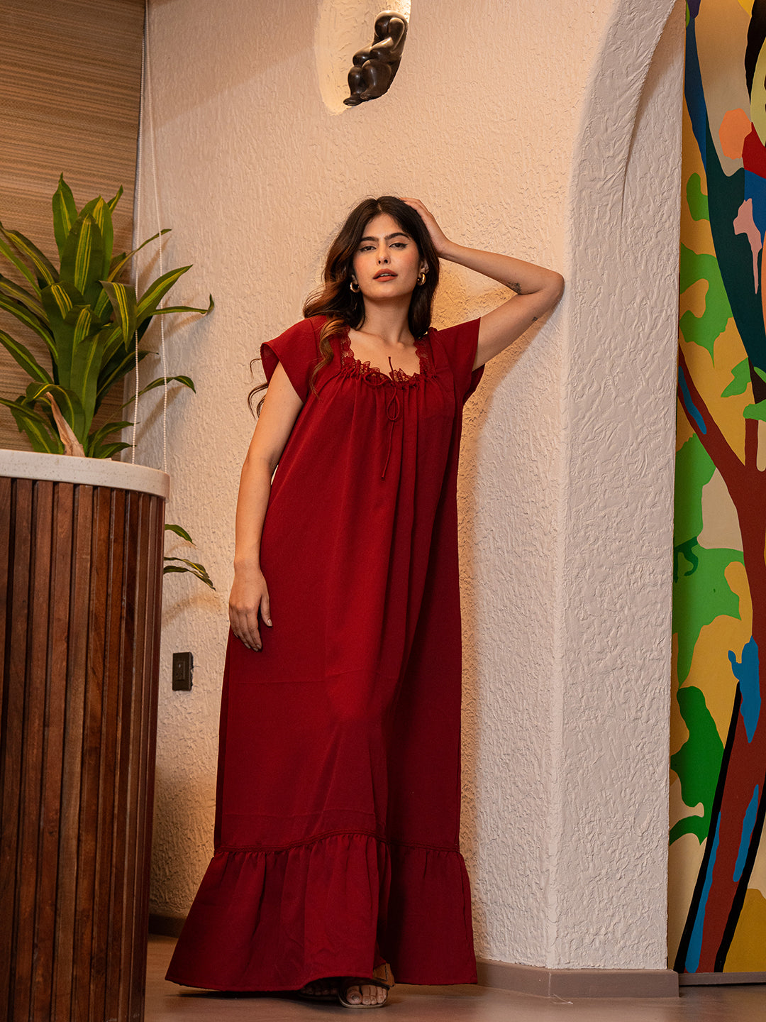 This maxi will have you feeling like the queen of the night! The flared design and soft crepe fabric create an elegant and comfortable look. Perfect for a night out or even just a cozy night in.