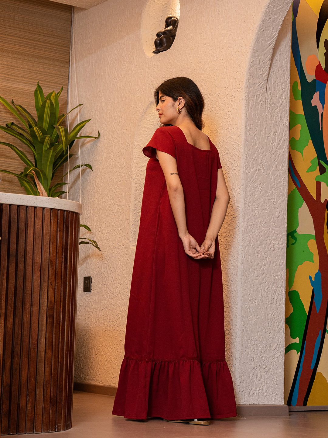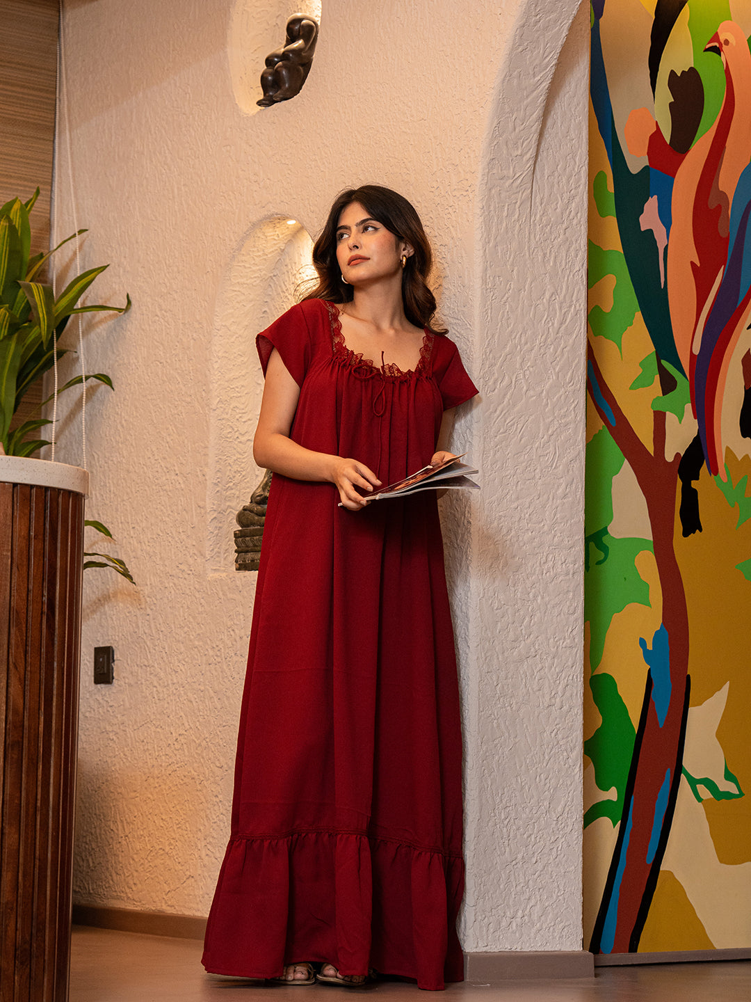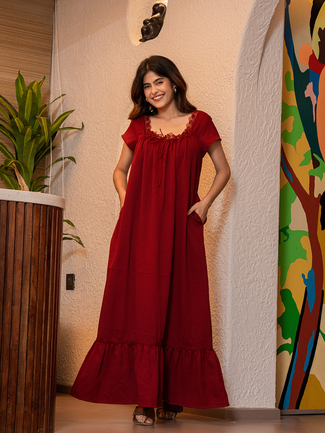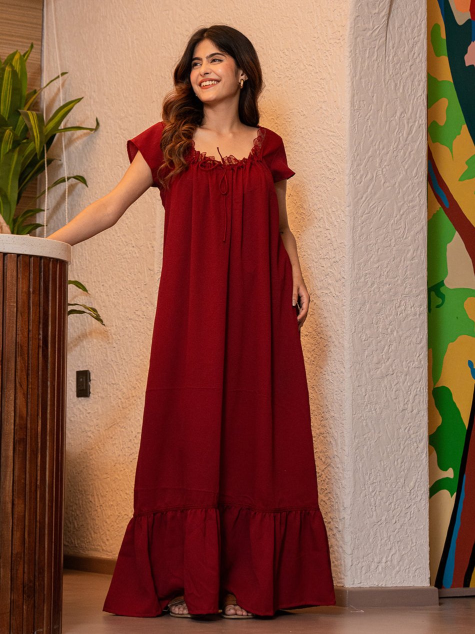 This maxi will have you feeling like the queen of the night! The flared design and soft crepe fabric create an elegant and comfortable look. Perfect for a night out or even just a cozy night in.