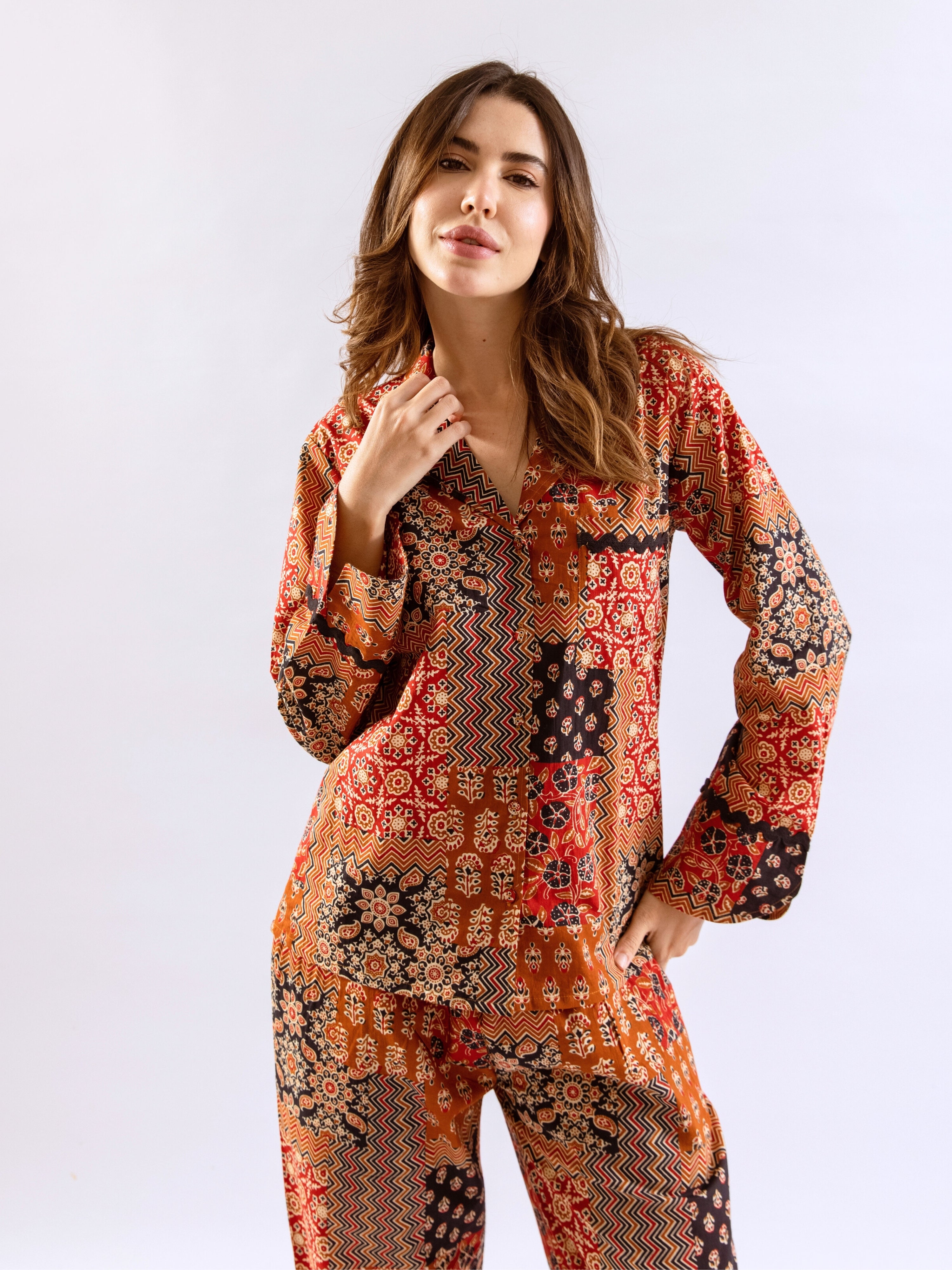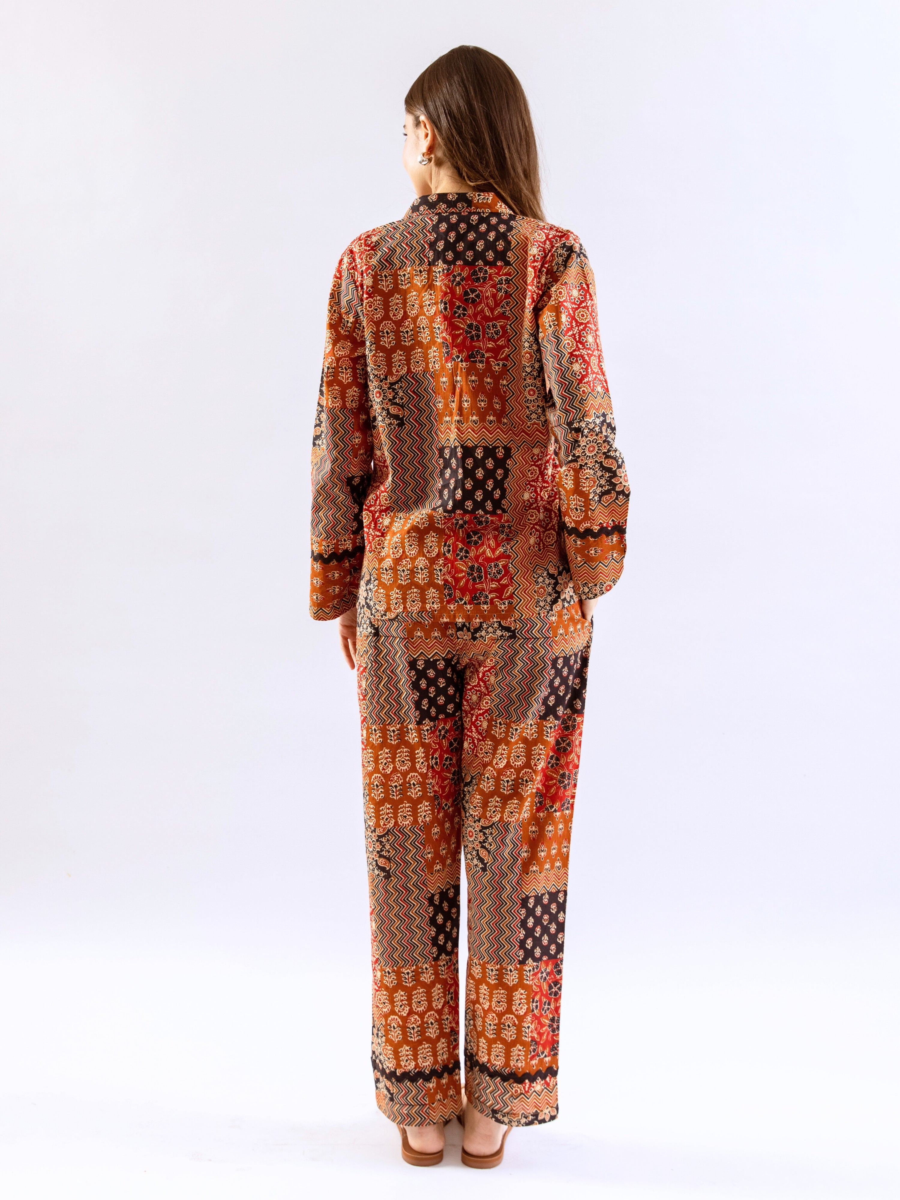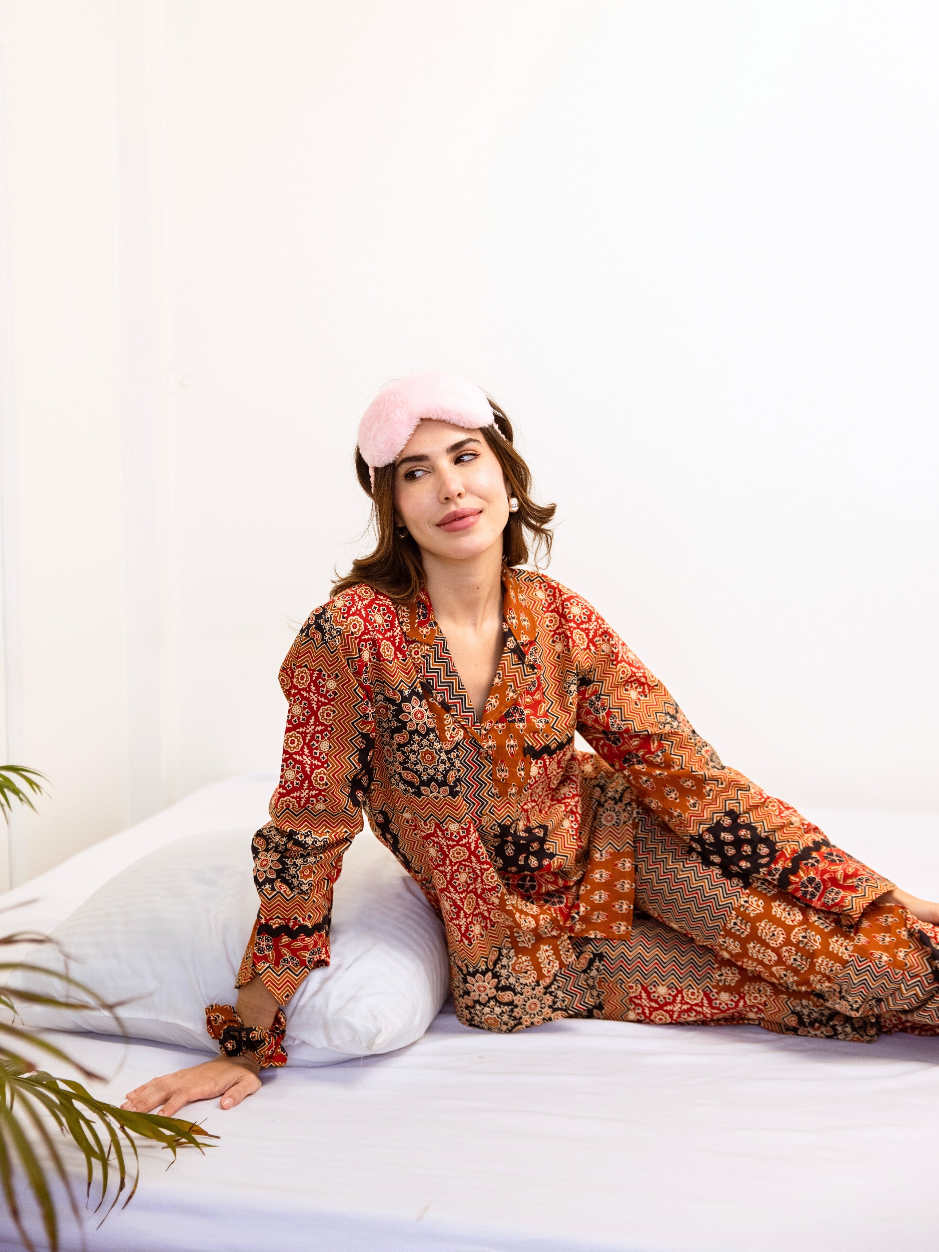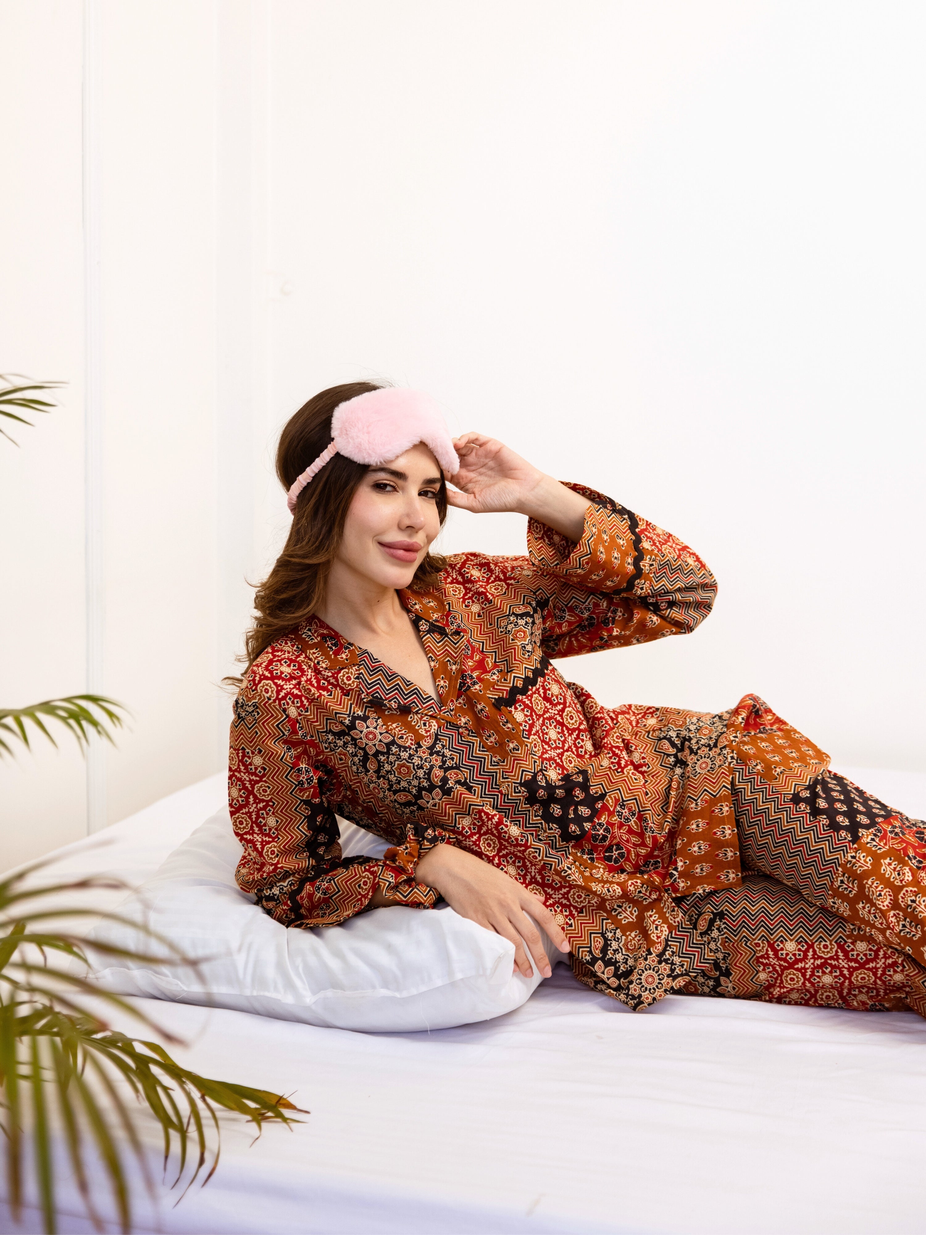 Brown Snuggle Patch Pure Cotton Collar Shirt Night Suit