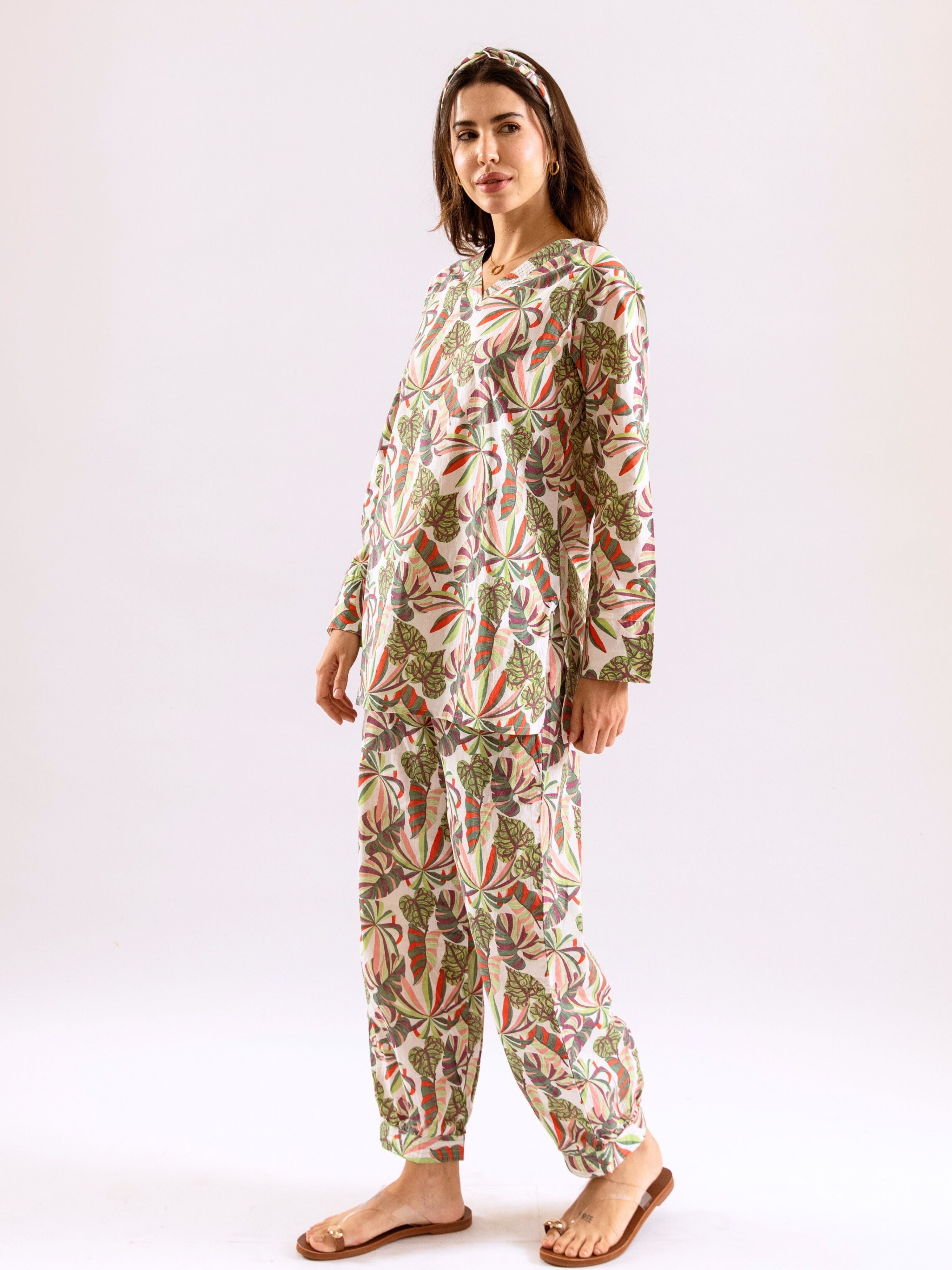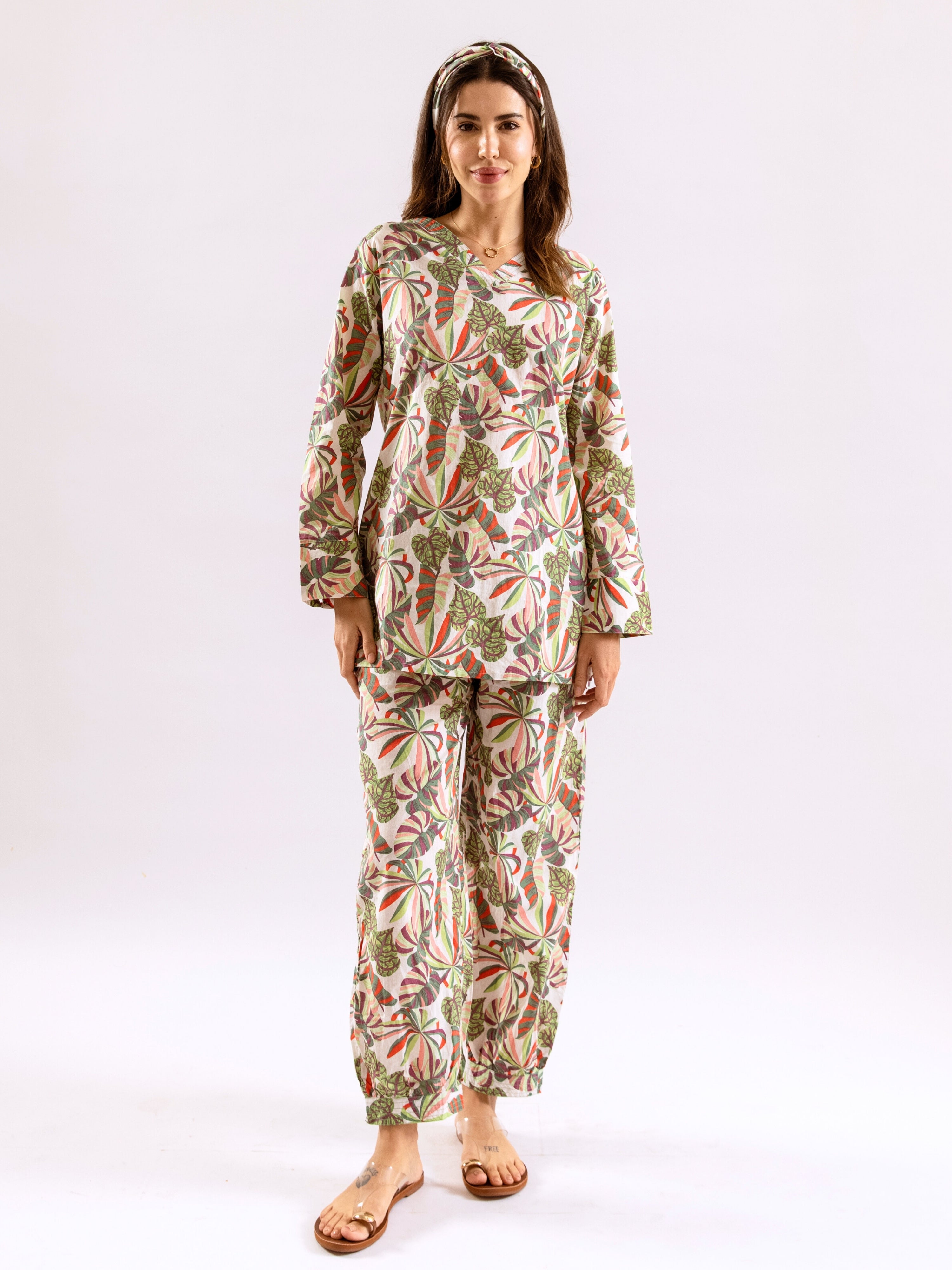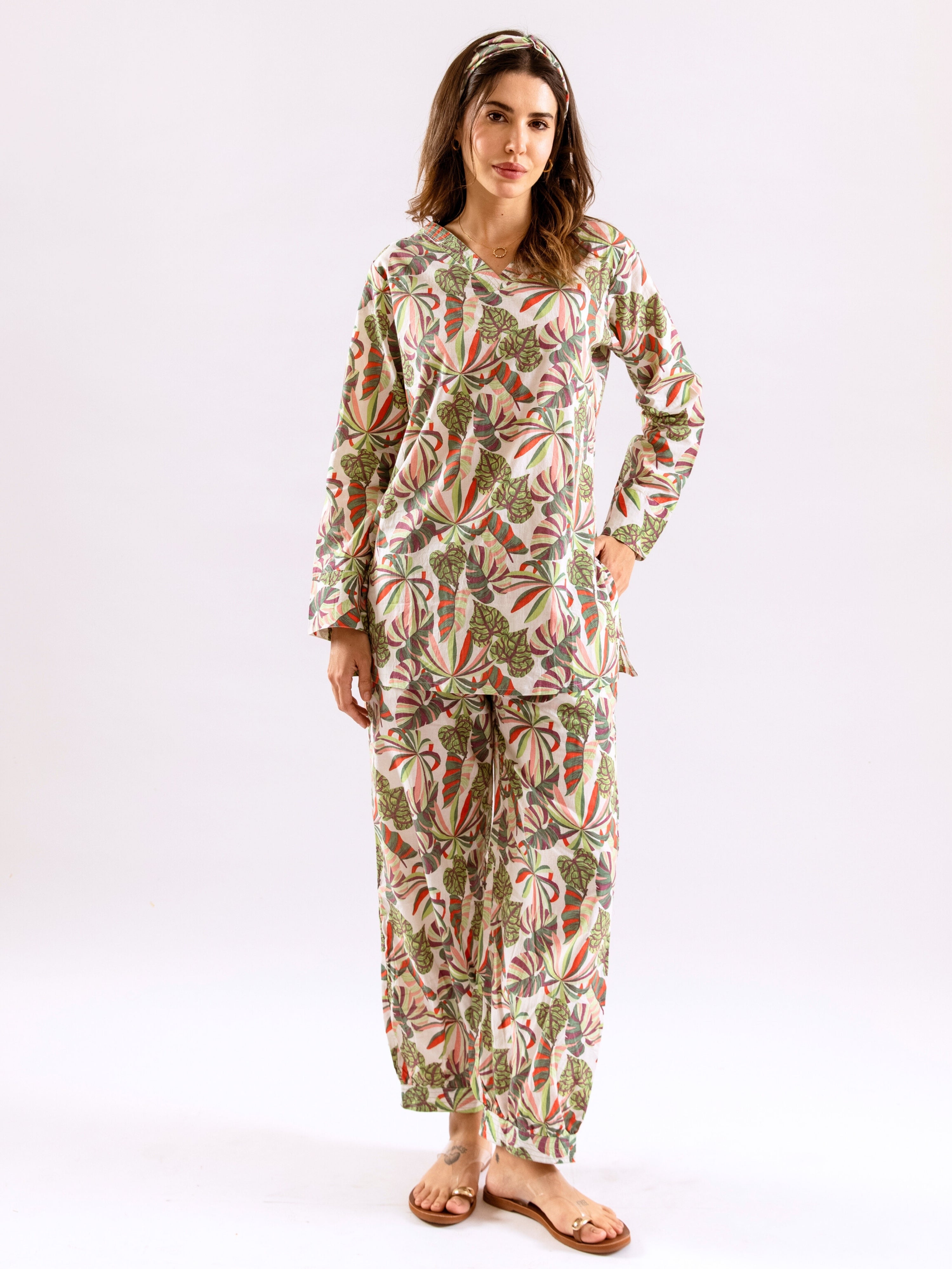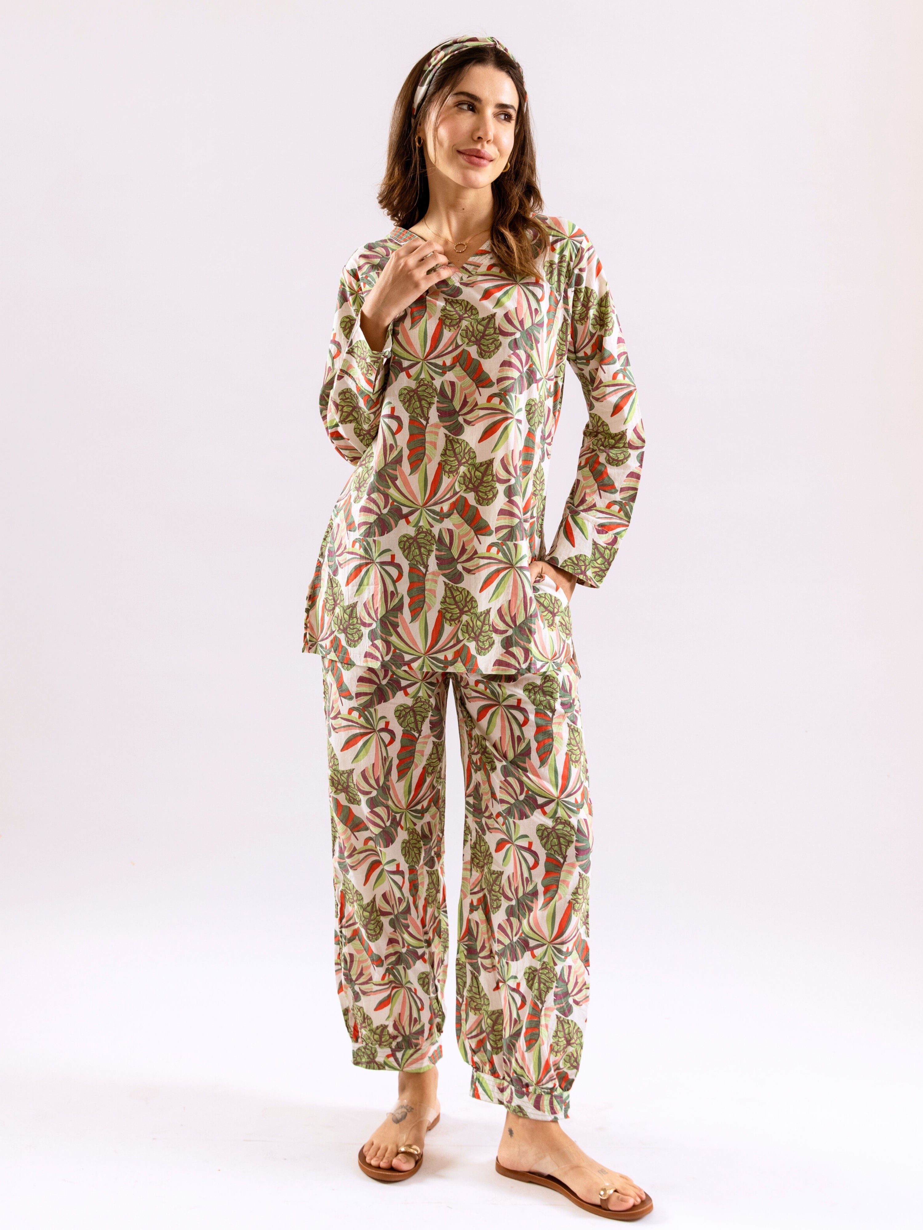 An ideal choice for your loungewear wardrobe, the Cotton Set comes in a soothing color palette. The hand block-printed pattern of the breezy Cotton top complements the matching Pants perfectly.