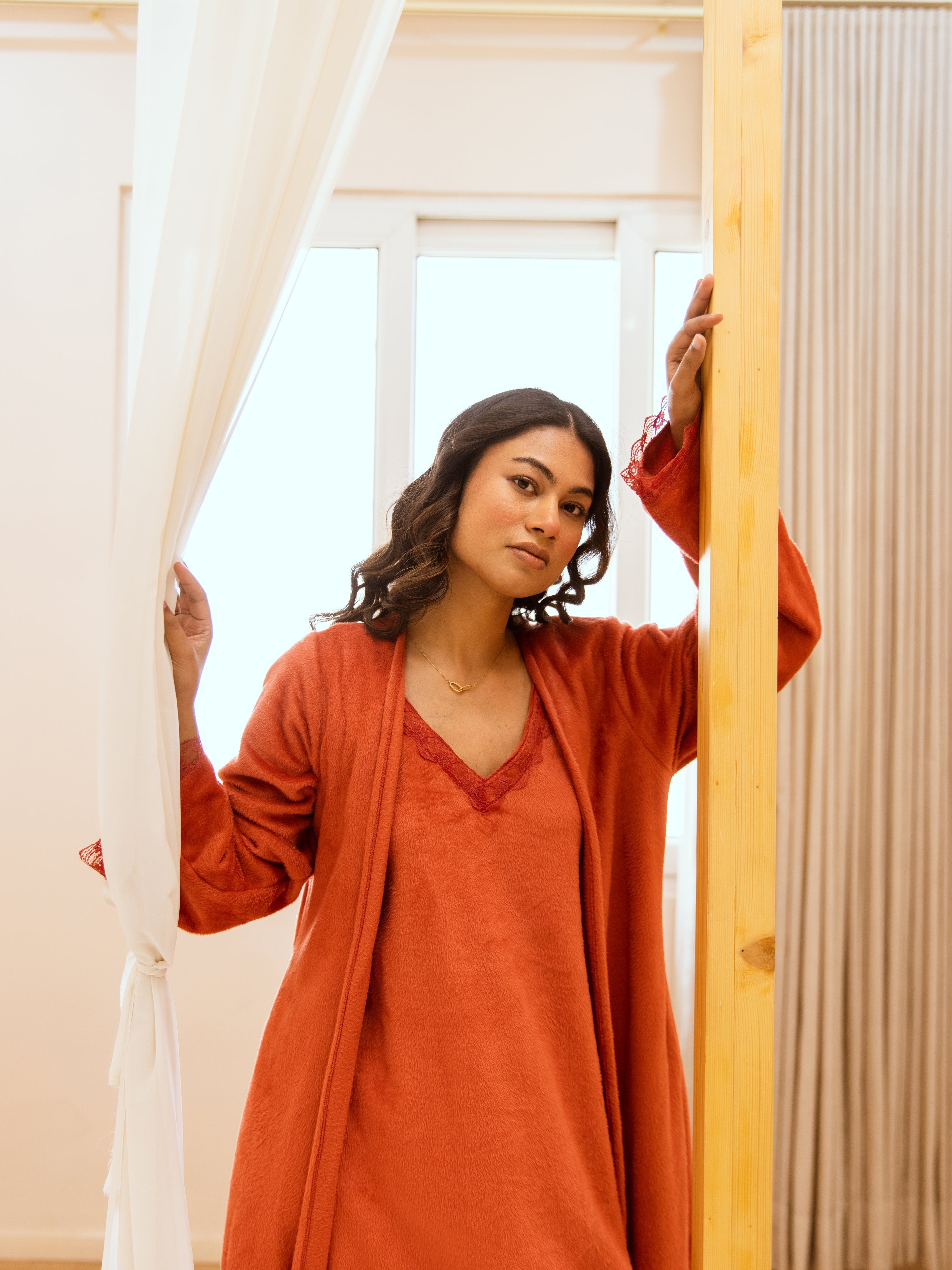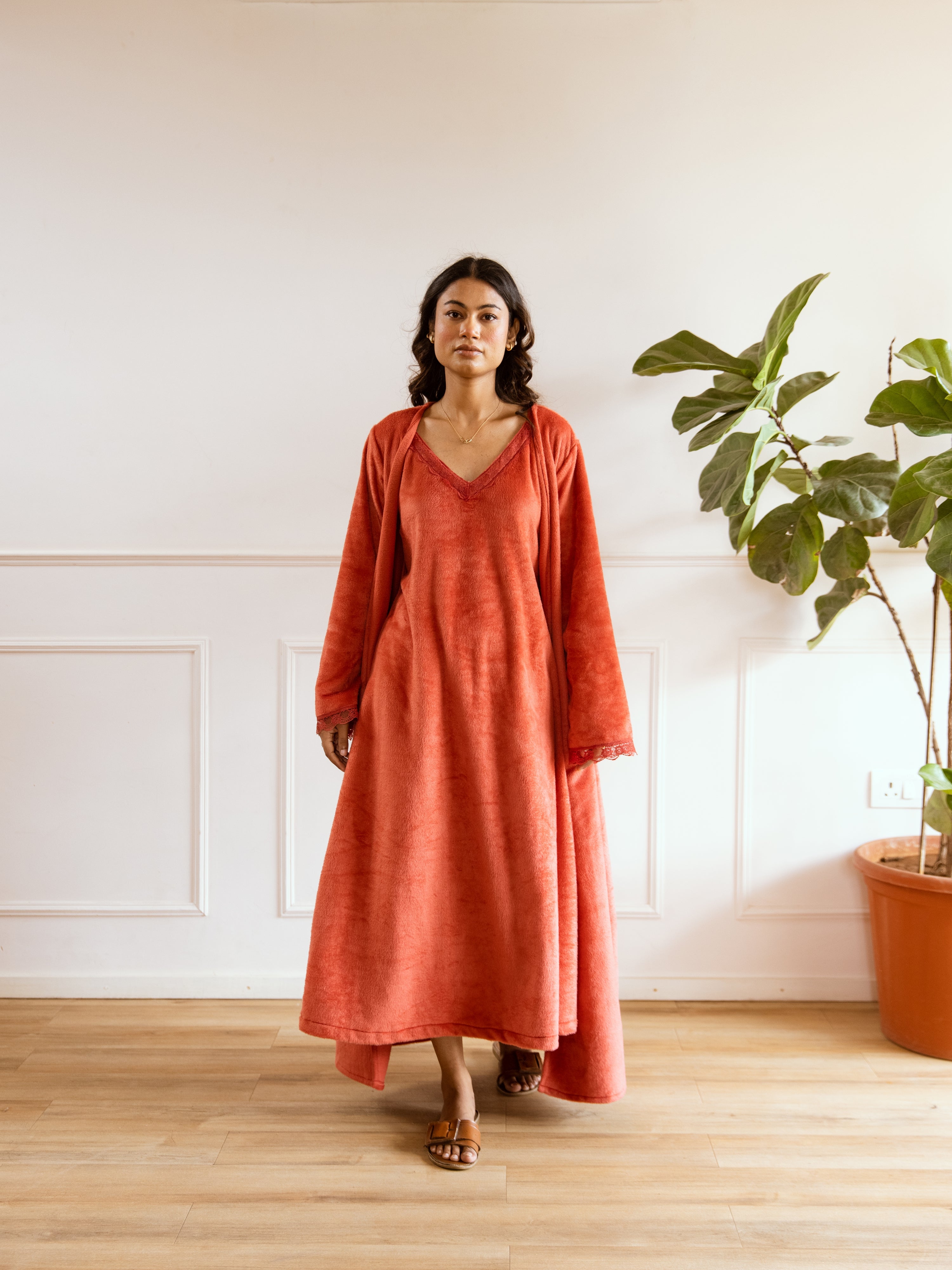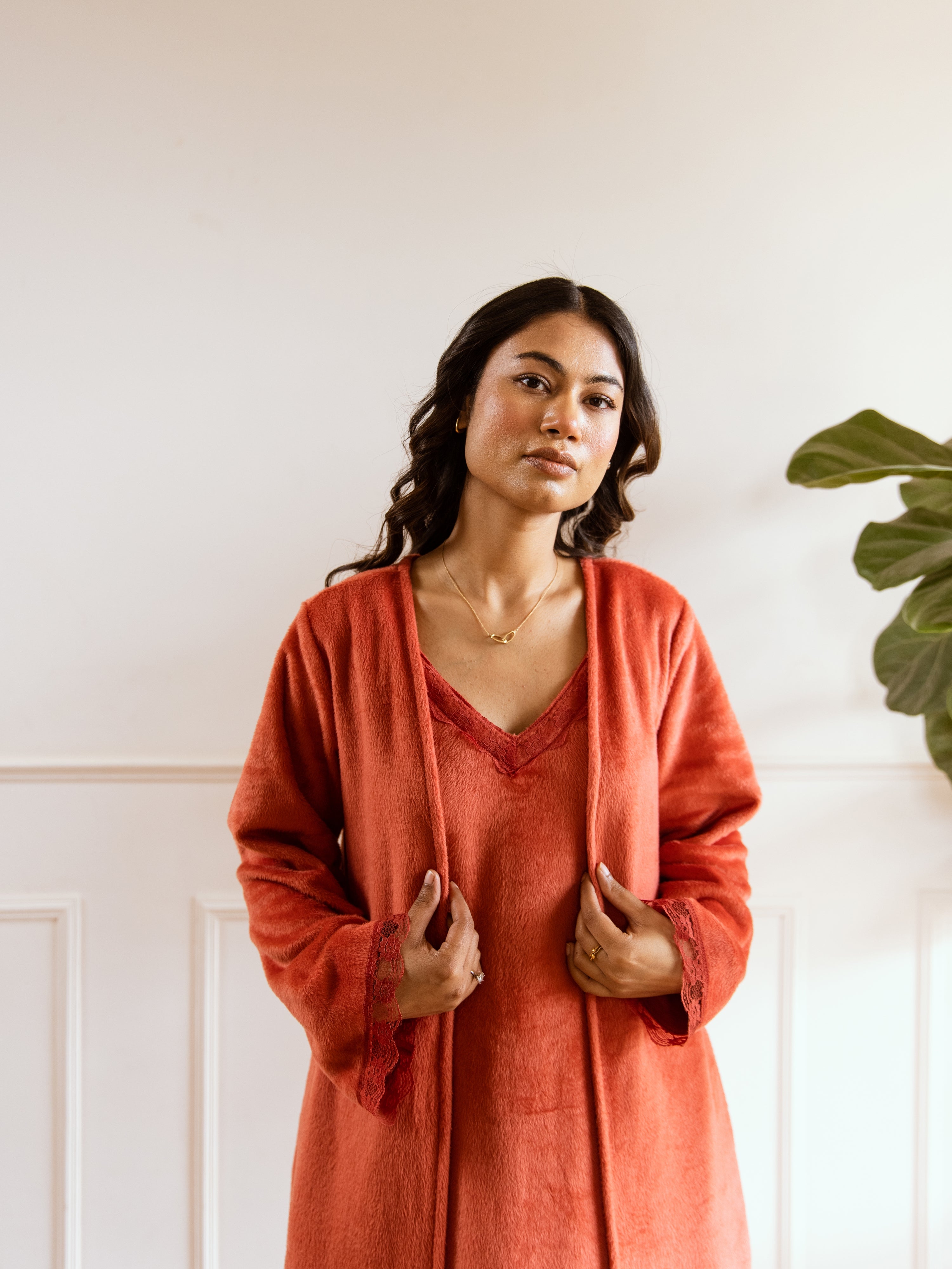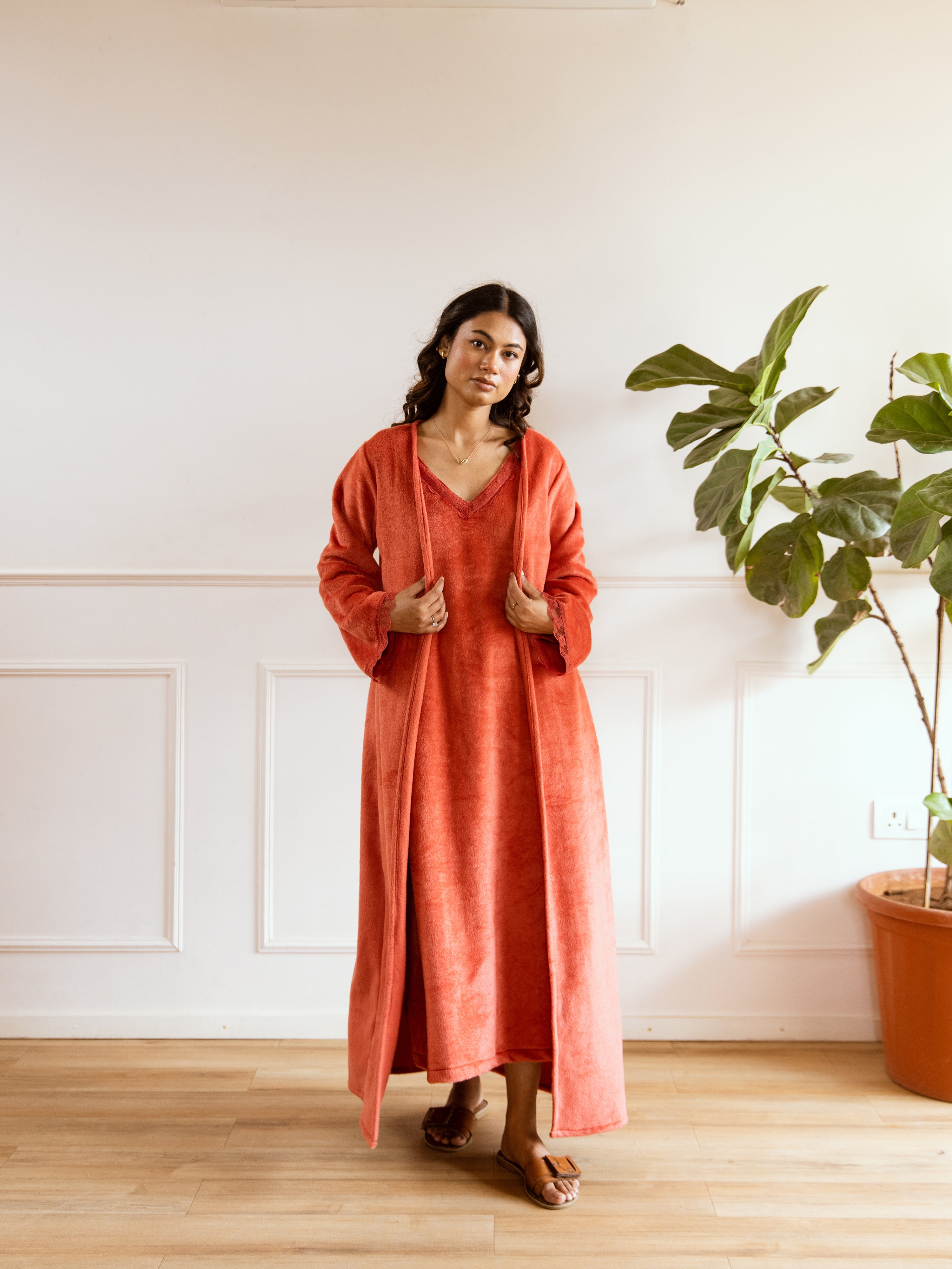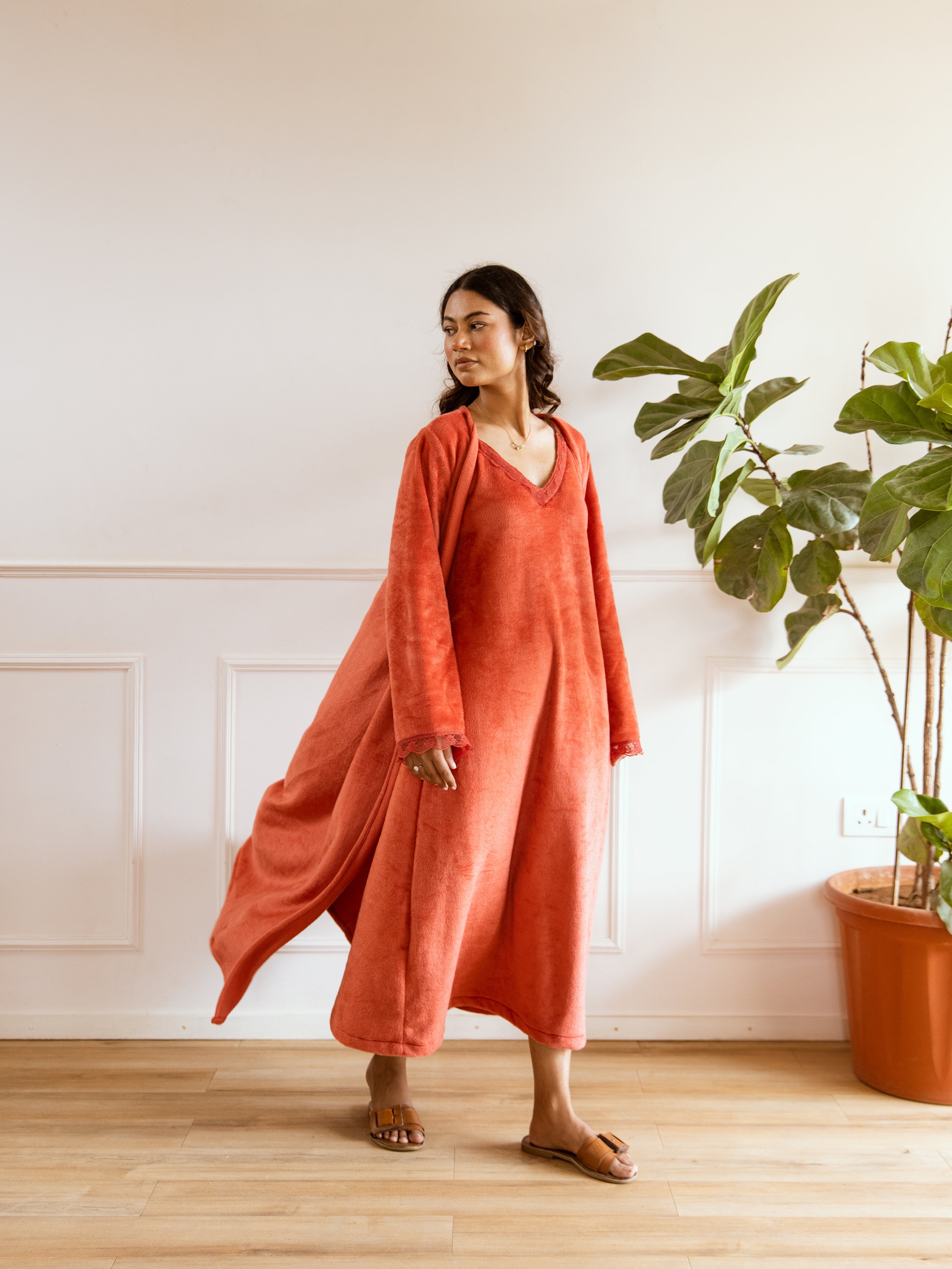 This cozy woollen set in a warm rust color is perfect for chilly days. The soft material will keep you warm and comfortable, while the maxi and shrug set allows for easy layering. Stay both stylish and snug with this set.