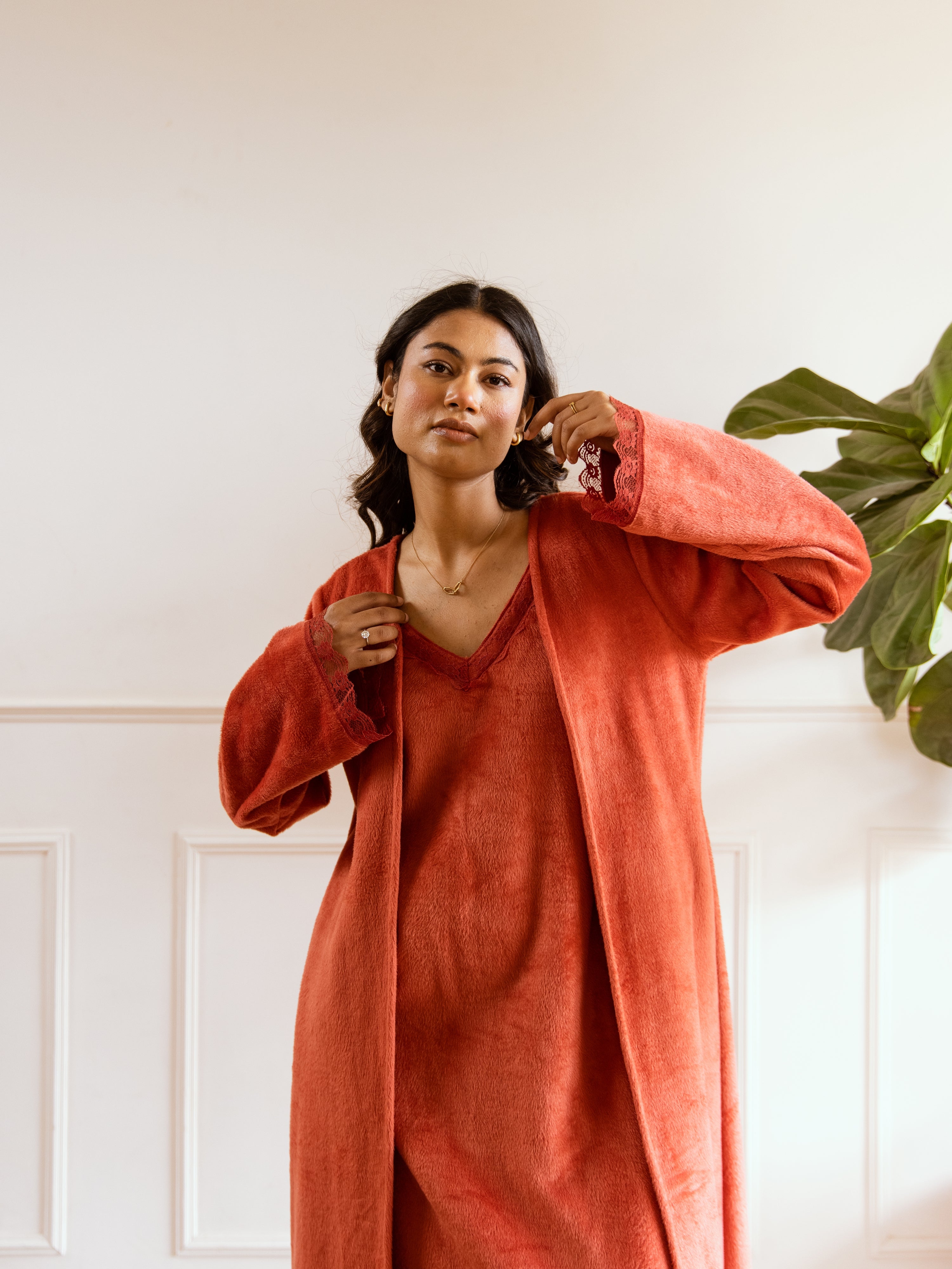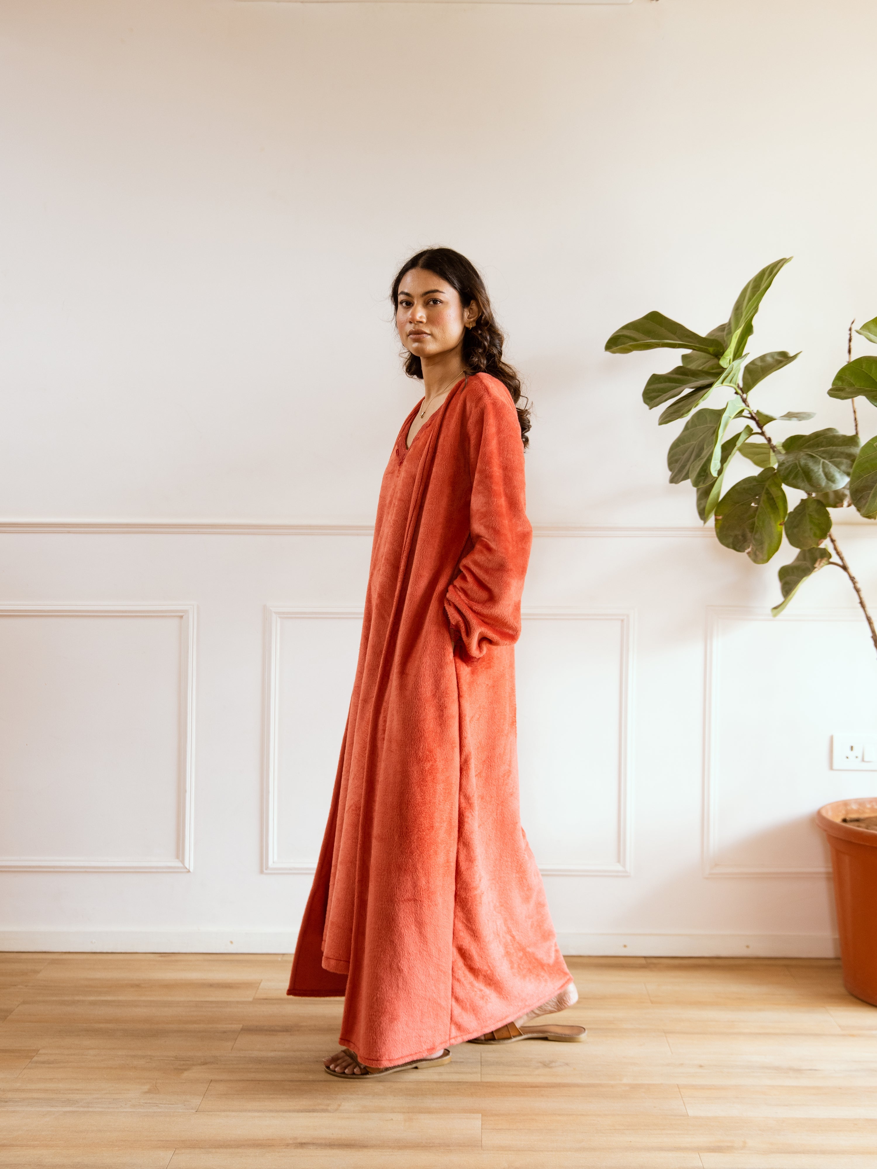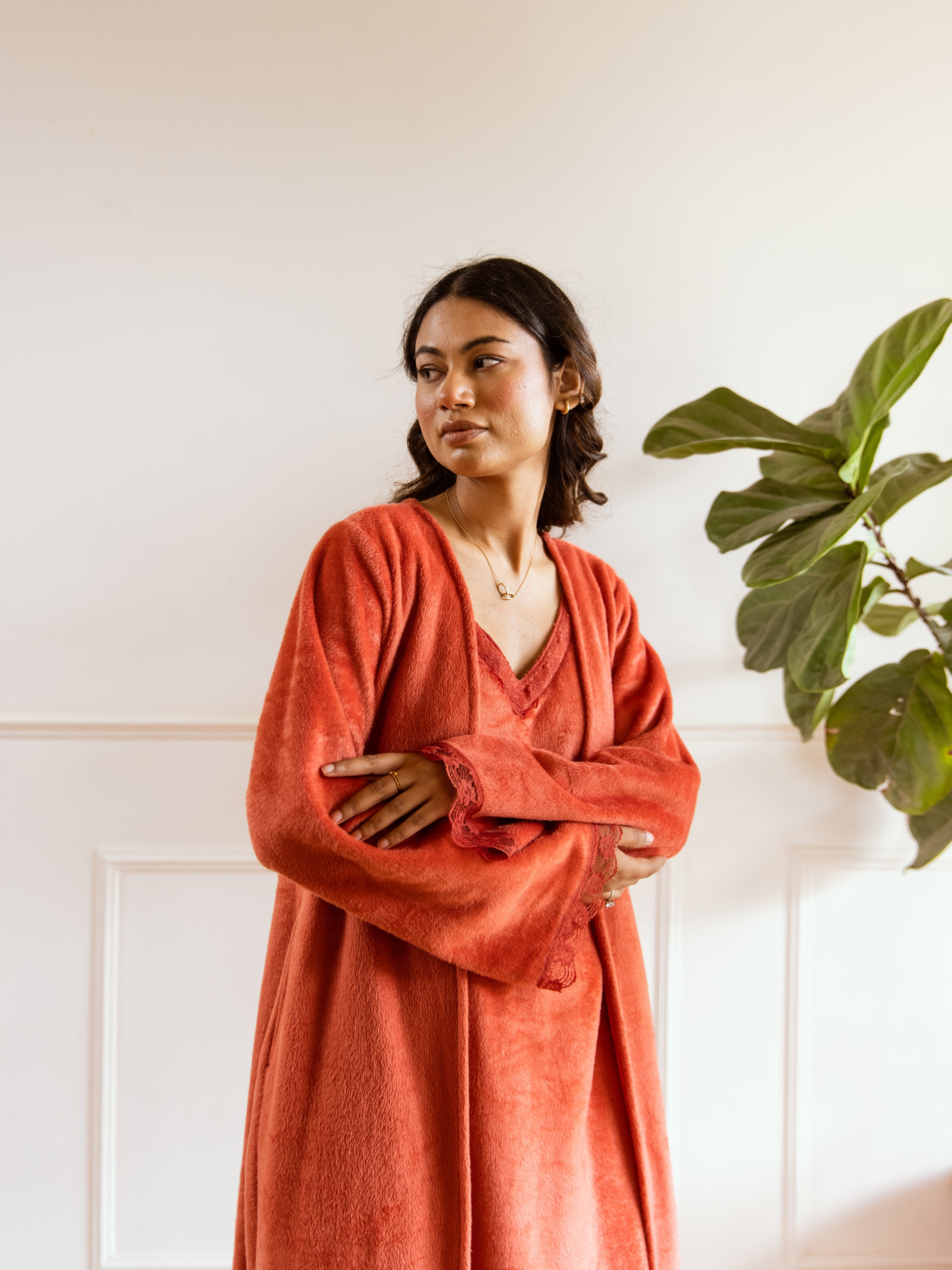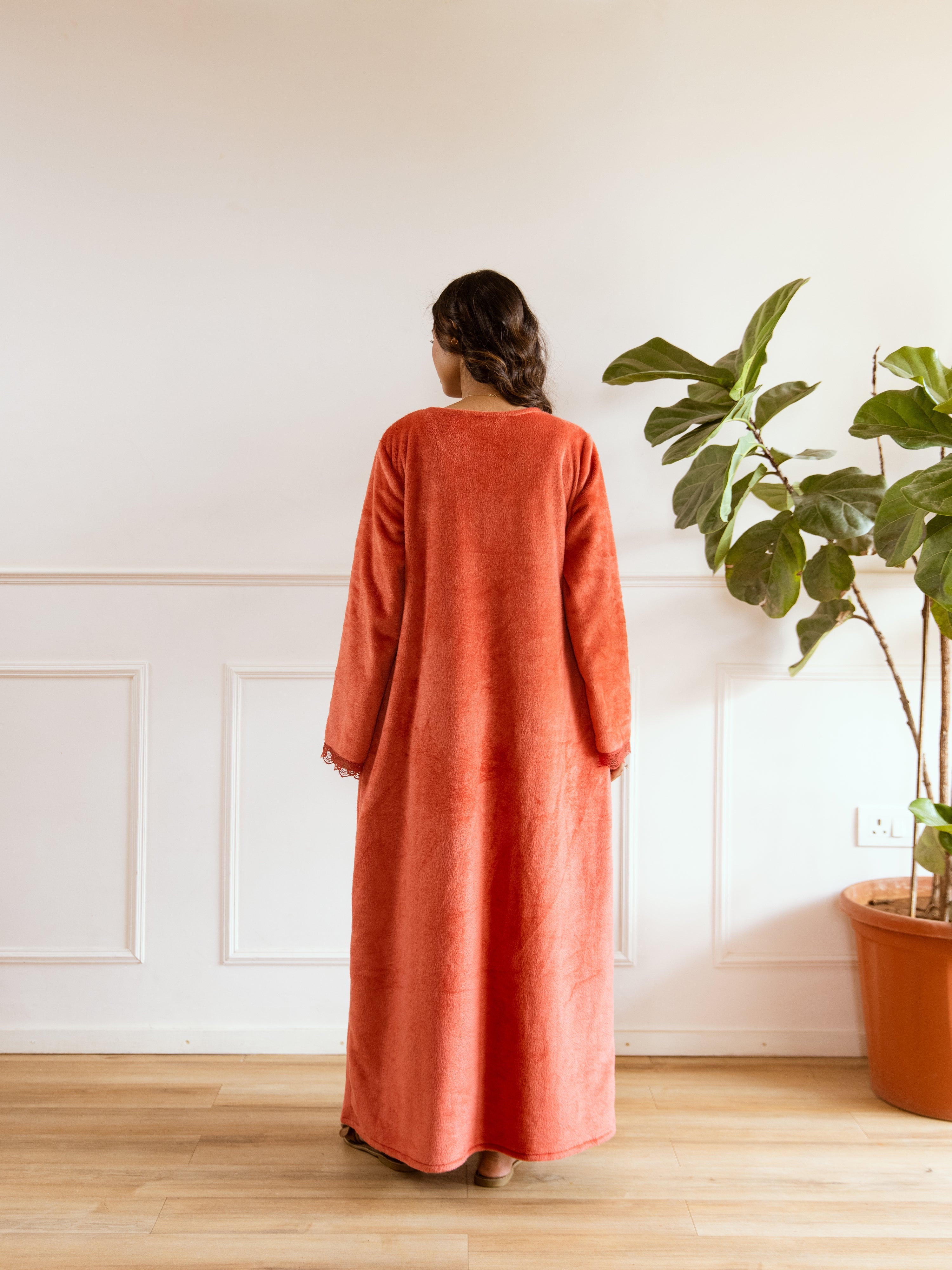 This cozy woollen set in a warm rust color is perfect for chilly days. The soft material will keep you warm and comfortable, while the maxi and shrug set allows for easy layering. Stay both stylish and snug with this set.