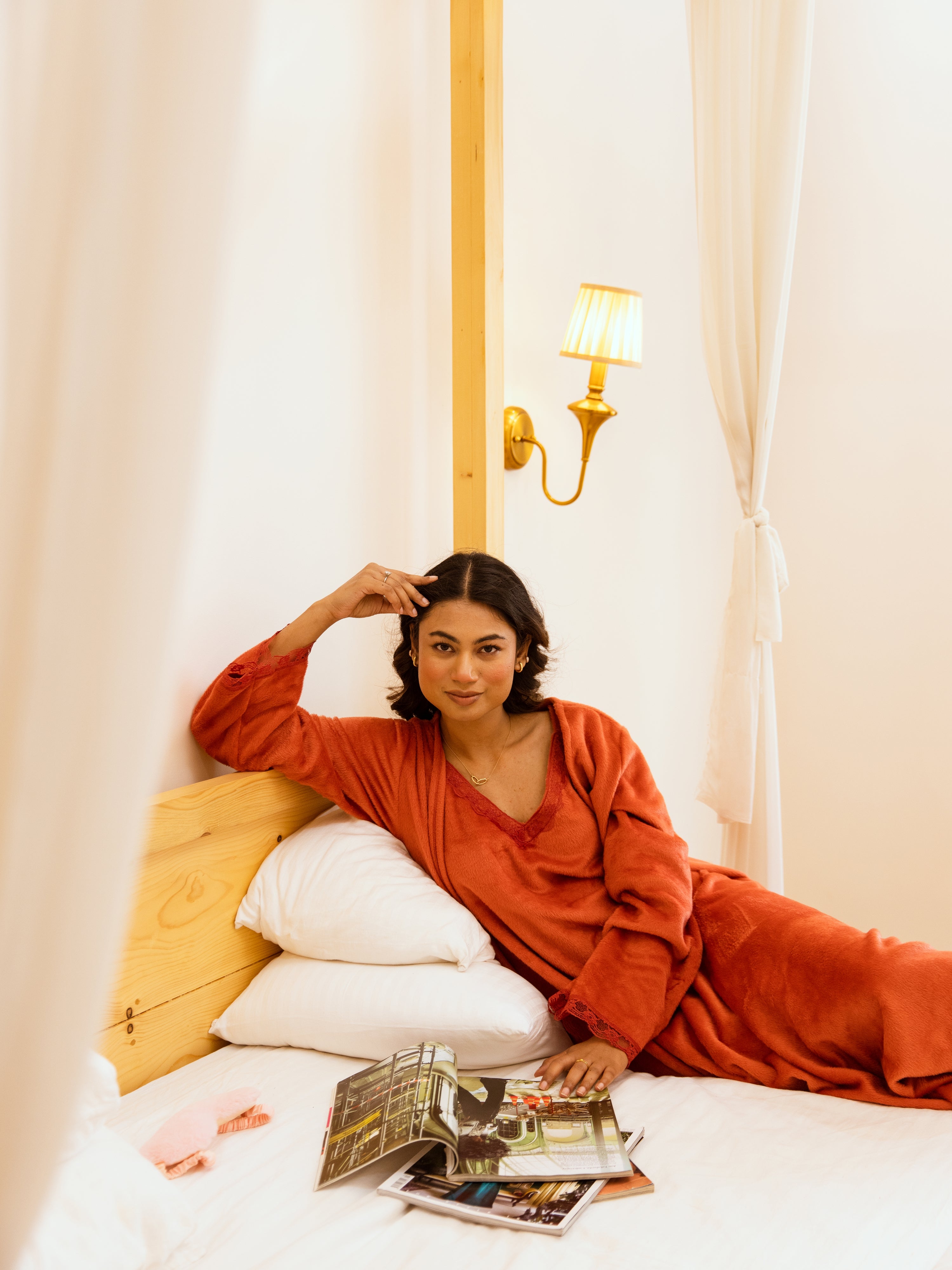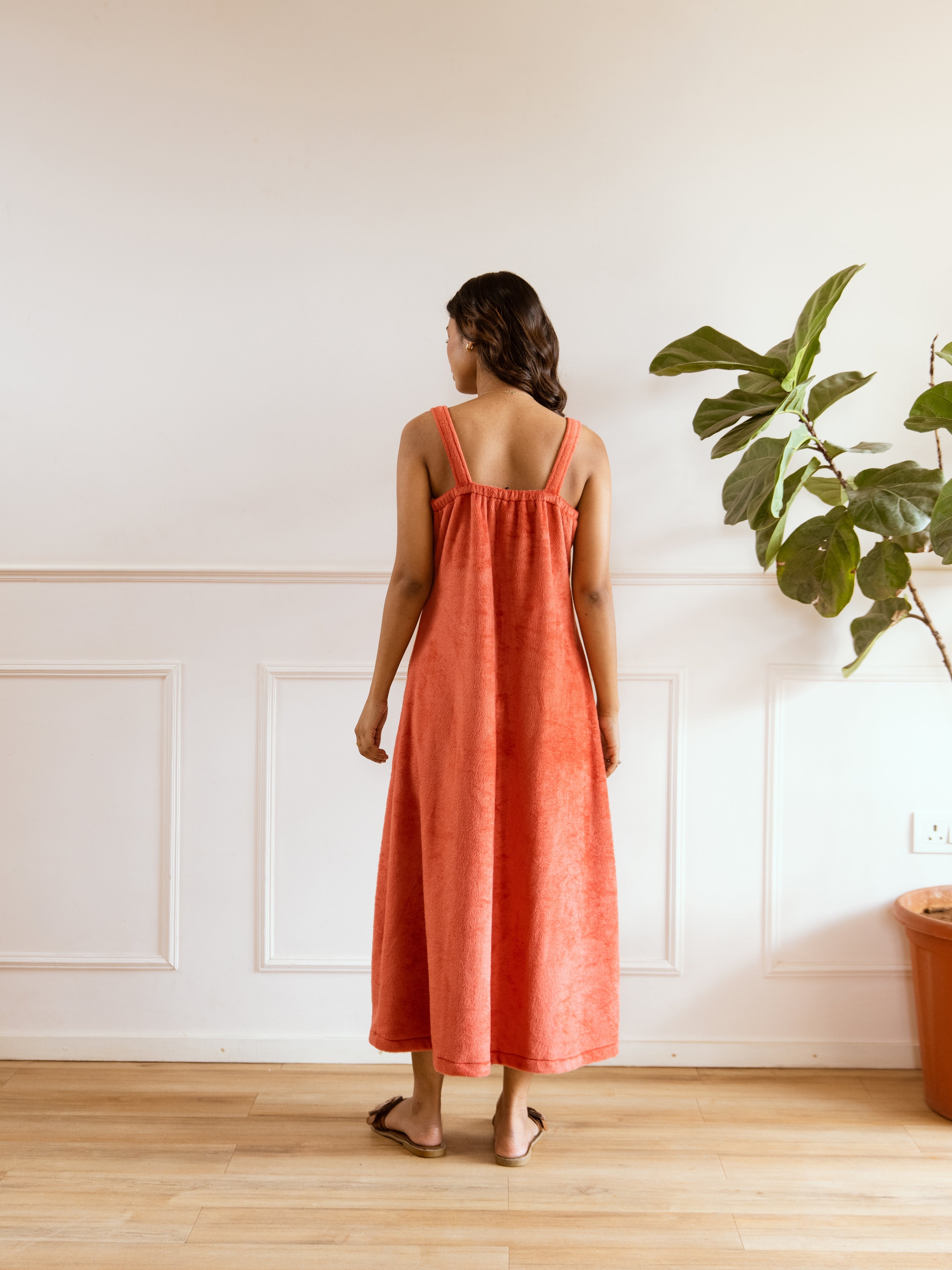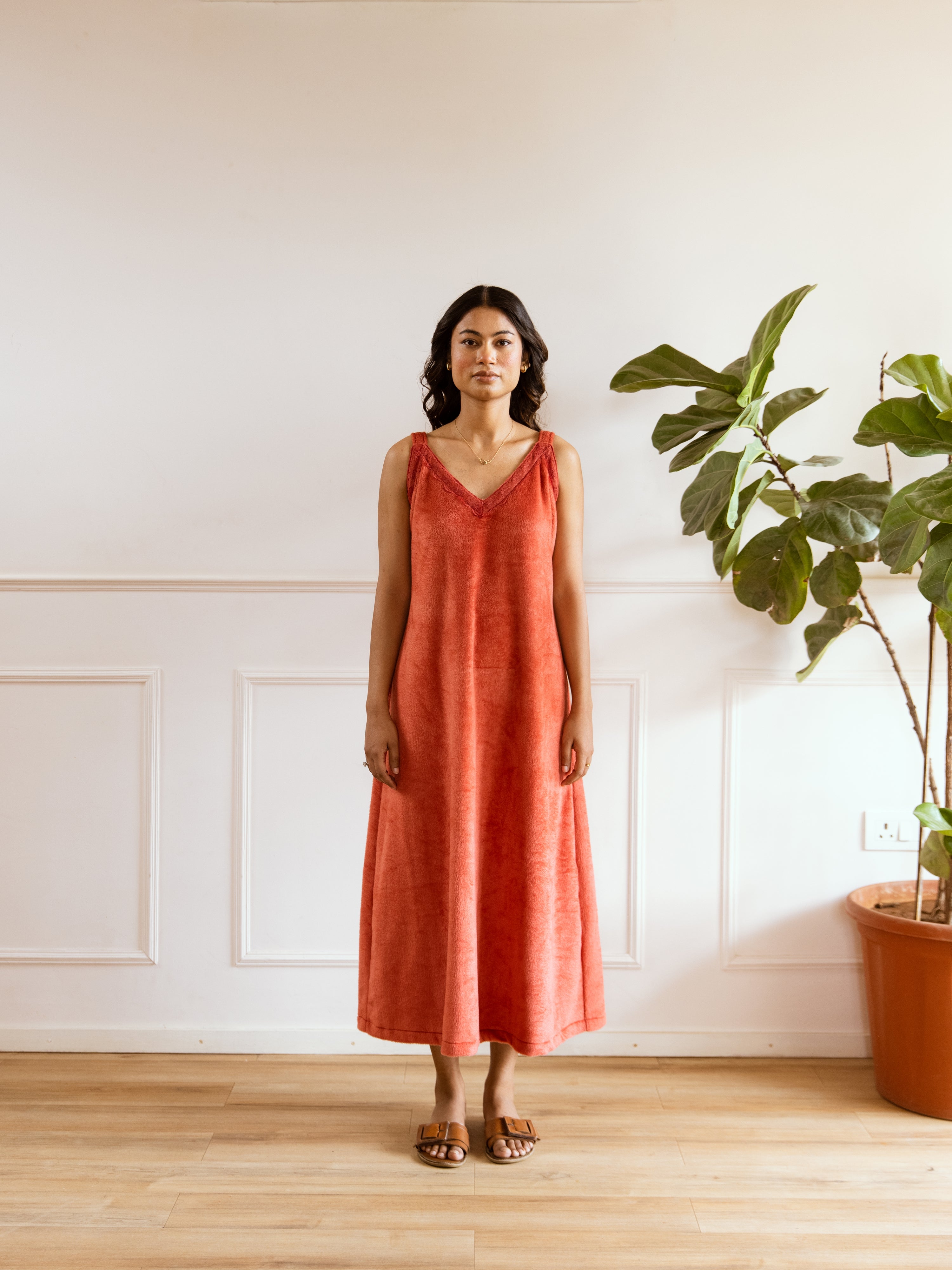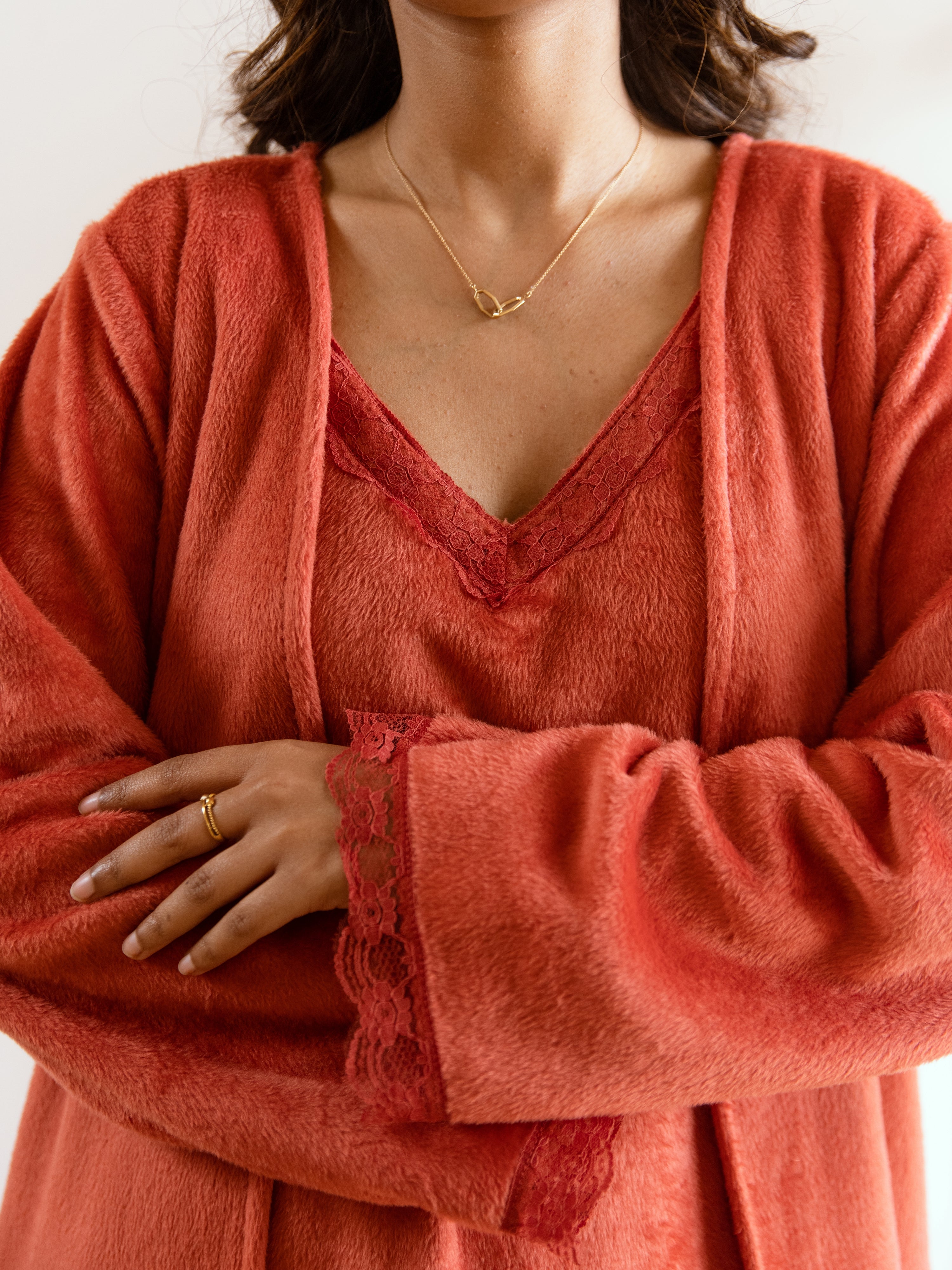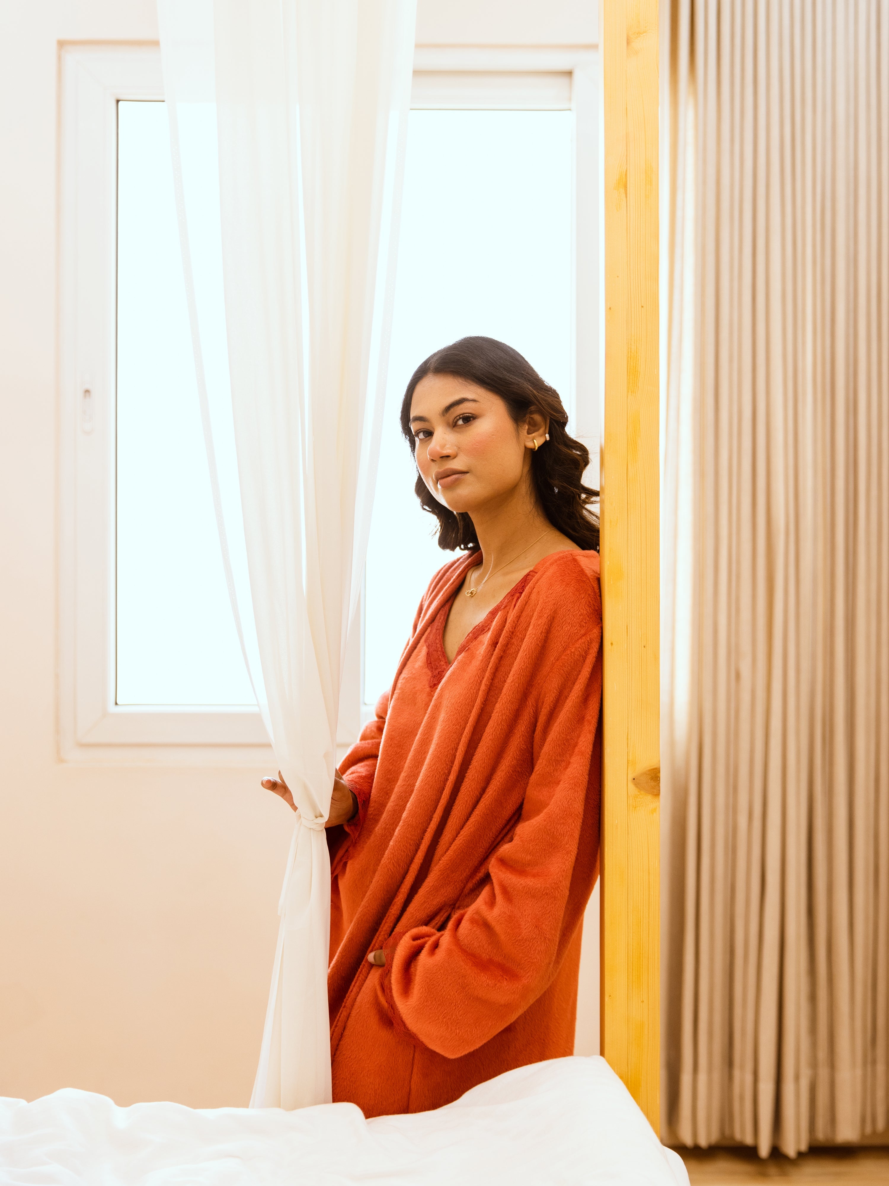 This cozy woollen set in a warm rust color is perfect for chilly days. The soft material will keep you warm and comfortable, while the maxi and shrug set allows for easy layering. Stay both stylish and snug with this set.
