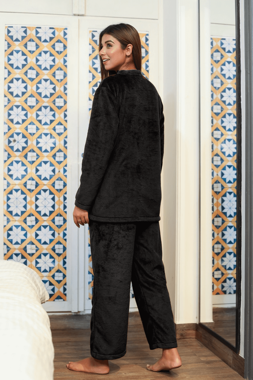 V neck Super Soft Black woollen Lounge Wear Set